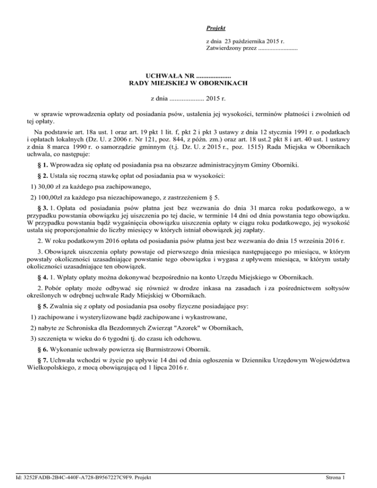 Projekt z dnia 23 października 2015 r. Zatwierdzony przez ......................... UCHWAŁA NR .................... RADY MIEJSKIEJ W OBORNIKACH z dnia .................... 2015 r. w sprawie wprowadzenia opłaty od posiadania psów, ustalenia jej wysokości, terminów płatności i zwolnień od tej opłaty. Na podstawie art. 18a ust. 1 oraz art. 19 pkt 1 lit. f, pkt 2 i pkt 3 ustawy z dnia 12 stycznia 1991 r. o podatkach i opłatach lokalnych (Dz. U. z 2006 r. Nr 121, poz. 844, z późn. zm.) oraz art. 18 ust.2 pkt 8 i art. 40 ust. 1 ustawy z dnia 8 marca 1990 r. o samorządzie gminnym (t.j. Dz. U. z 2015 r., poz. 1515) Rada Miejska w Obornikach uchwala, co następuje: § 1. Wprowadza się opłatę od posiadania psa na obszarze administracyjnym Gminy Oborniki. § 2. Ustala się roczną stawkę opłat od posiadania psa w wysokości: 1) 30,00 zł za każdego psa zachipowanego, 2) 100,00zł za każdego psa niezachipowanego, z zastrzeżeniem § 5. § 3. 1. Opłata od posiadania psów płatna jest bez wezwania do dnia 31 marca roku podatkowego, a w przypadku powstania obowiązku jej uiszczenia po tej dacie, w terminie 14 dni od dnia powstania tego obowiązku. W przypadku powstania bądź wygaśnięcia obowiązku uiszczenia opłaty w ciągu roku podatkowego, jej wysokość ustala się proporcjonalnie do liczby miesięcy w których istniał obowiązek jej zapłaty. 2. W roku podatkowym 2016 opłata od posiadania psów płatna jest bez wezwania do dnia 15 września 2016 r. 3. Obowiązek uiszczenia opłaty powstaje od pierwszego dnia miesiąca następującego po miesiącu, w którym powstały okoliczności uzasadniające powstanie tego obowiązku i wygasa z upływem miesiąca, w którym ustały okoliczności uzasadniające ten obowiązek. § 4. 1. Wpłaty opłaty można dokonywać bezpośrednio na konto Urzędu Miejskiego w Obornikach. 2. Pobór opłaty może odbywać się również w drodze inkasa na zasadach i za pośrednictwem sołtysów określonych w odrębnej uchwale Rady Miejskiej w Obornikach. § 5. Zwalnia się z opłaty od posiadania psa osoby fizyczne posiadające psy: 1) zachipowane i wysterylizowane bądź zachipowane i wykastrowane, 2) nabyte ze Schroniska dla Bezdomnych Zwierząt "Azorek" w Obornikach, 3) szczenięta w wieku do 6 tygodni tj. do czasu ich odchowu. § 6. Wykonanie uchwały powierza się Burmistrzowi Obornik. § 7. Uchwała wchodzi w życie po upływie 14 dni od dnia ogłoszenia w Dzienniku Urzędowym Województwa Wielkopolskiego, z mocą obowiązującą od 1 lipca 2016 r. Id: 3252FADB-2B4C-440F-A728-B9567227C9F9. Projekt Strona 1 UZASADNIENIE Wprowadzenie obowiązku opłatowego od posiadania psa stanie się jednym z elementów realizowanej przez Gminę Oborniki polityki pro zwierzęcej. Z analizy realizacji programu opieki nad bezdomnymi zwierzętami i zapobiegania bezdomności wynika, że bez wprowadzenia skutecznego narzędzia mobilizującego właściciela do zarejestrowania psa, poddaniu go zabiegowi sterylizacji czy kastracji działania na rzecz ograniczenia zjawiska bezdomności są mało skuteczne. Dlatego też, zaproponowano wprowadzenie opłaty od posiadania psa różnicując jej wysokość w zależności od posiadania psa zachipowanego bądź nie zachipowanego. Ponadto zgodnie z art. 19 pkt. 3 ustawy o podatkach i opłatach lokalnych oraz § 5 Uchwały wprowadzono zwolnienia z opłaty od posiadania psów ze względu na określony podmiot (cechę) związany z posiadaniem psów, a mianowicie wysterylizowanie lub wykastrowanie psa, pochodzenie psa (nabycie psa w Schronisku dla Bezdomnych Zwierząt "Azorek" w Obornikach) oraz wiek zwierzęcia. Dzięki takim rozwiązaniom modeluje się porządane i korzystne z punktu widzenia zapobiegania bezdomności zwierząt zachowania posiadaczy psów. Powyższe unormowania mieszczą się w granicach wyznaczonych przez art. 15 oraz 19 pkt 1 lit. a ustawy o podatkach i opłatach lokalnych. Zgodnie z wykładnią przywołanego przepisu dopuszczalne jest różnicowanie obciążeń, aby zrealizować określone cele publiczne. Odstępstwa od zasady równości wobec prawa są dopuszczalne, jeśli spełniają trzy warunki: po pierwsze - są relatywne, tj. racjonalnie uzasadnione; po drugie - są proporcjonalne, a więc waga interesu, jakiemu służy zróżnicowanie musi pozostawać w odpowiedniej proporcji do wagi interesów podmiotów, które zostaną naruszone; po trzecie - pozostają w związku z innymi wartościami, zasadami czy normami konstytucyjnymi, uzasadniającymi różne traktowanie podmiotów podobnych. Przesłanki ww. występują w sytuacji regulowanej niniejszą uchwałą. Mając na uwadze powyższe podjęcie przedmiotowej uchwały jest uzasadnione. Id: 3252FADB-2B4C-440F-A728-B9567227C9F9. Projekt Strona 1