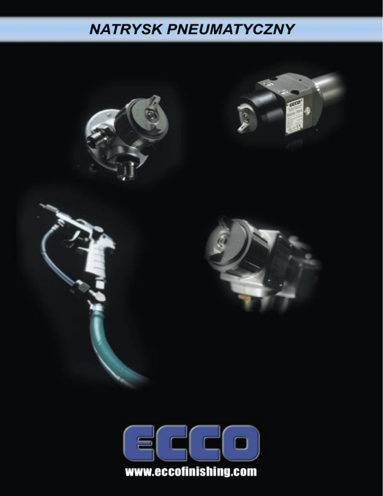 NATRYSK PNEUMATYCZNY www.eccofinishing.com NATRYSK PNEUMATYCZNY Niskociśnieniowa metoda natryskowa W tej metodzie natrysku farba jest atomizowana przez sprężone powietrze. Ilość farby kontrolowana jest poprzez regulację skoku iglicy. Iglicę steruje się naciskając język spustowy. Przy lekkim pociągnięciu języka spustowego najpierw zostaje otwarty przepływ sprężonego powietrza a później przepływ farby. Farba przepływając przez dyszę natryskowa i rozpylacz jest rozbijana na bardzo małe krople. Stopień atomizacji jest regulowany poprzez regulację przepływu farby lub powietrza. Kształt strumienia natrysku może być regulowany od okrągłego do płaskiego za pomocą zaworu regulacji strumienia sterującego dopływem powietrza do rozpylacza. W zależności od potrzeb aplikacji stosuje się trzy metody zasilania farbą: grawitacyjną, podciśnieniową lub ciśnieniową. W pistoletach Ecco 40 i 60 do atomizacji stosuje się ciśnienie do 7 bar. Metoda ta jest nazywana metodą konwencjonalną. Seria pistoletów Ecco 65 jest wyposażona w przepustnicę wbudowaną w korpus pistoletu, co powoduje, że przy ciśnieniu zasilania pistoletu 3 bar na rozpylaczu uzyskuje się ciśnienie 0,7 bar. Ta metoda nazywana jest metodą HVLP (Wysoka Wydajność Niskie Ciśnienie), daje minimalny rozkurz i niższy poziom hałasu. Większa wydajność przepływu tej metodzie pozwala na stosowanie jej tam, gdzie wymagane jest naniesienie większej ilości farby. Automatyczny pistolet natryskowy Ecco 70 może być używany zarówno jako pistolet konwencjonalny lub HVLP w zależności od wyboru odpowiedniej kombinacji dyszy, rozpylacza oraz parametrów powietrza zasilającego. Niskociśnieniowe pistolety natryskowe są używane do aplikacji przemysłowych, gdzie wymagana jest wysoka wydajność, trwałość i jakość powierzchni. ZALETY • Wysoka jakość natrysku • Jednorodna grubość powłoki • Łatwe i precyzyjne regulacje kształtu strumienia i ilości farby • Wszechstronne pistolety do wielu aplikacji Index Metody natryskowe ________________________________ 2 Pistolety natryskowe- właściwości_____________________ 3 Jak zamawiać zestawy natryskowe____________________ 4 Ecco zestawy zasilające ____________________________ 5 Ręczne pistolety natryskowe _______________________ 6-9 Ecco 40S, 65S____________________________________ 6 Ecco 401S, 651S__________________________________ 7 Ecco 402S, 652S__________________________________ 8 Ecco 30 _________________________________________ 9 Automatyczne pistolety natryskowe ________________10-11 Ecco 70A/AS ____________________________________ 10 Ecco 60A/AS, 65AS,40DA__________________________ 11 Ecco węże ______________________________________ 12 Akcesoria____________________________________ 13-14 Ecco zbiorniki ciśnieniowe__________________________ 15 Ochrona osobista ________________________________ 16 2 www.eccofinishing.com NATRYSK PNEUMATYCZNY Ecco pistolety natryskowe Do wszystkich profesjonalnych zastosowań Sprzęt Ecco do natrysku konwencjonalnego rozwijany był przez wysoko kwalifikowanych inżynierów przy ścisłej współpracy z producentami farb i lakierniami przemysłowymi od ponad 60 lat. To zaowocowało powstaniem kompletnej koncepcji natrysku, gdzie korpus pistoletu, rozpylacz, dysze, natryskową, iglicę, regulację powietrza i farby można kompletować na wiele różnych sposobów otrzymując pistolet natryskowy o unikalnych funkcjach który zaspokoi potrzeby każdego klienta. Pistolety Ecco 40/65 są odpowiednie do pracy w liniach lakierniczych, jak również do napraw punktowych czy też lakierowania drobnych elementów. Uniwersalny pistolet do różnych aplikacji Idealny do lakierów metalicznych Pistolet natryskowy Ecco 40/65 można dostosować do różnych potrzeb klientów poprzez różne kombinacje elementów pistoletu. Regulator szerokości strumienia może być wykonany w wersji płynnej lub skokowej regulacji albo stałego ustawienia. Pistolet można używać z regulacją iglicy lub bez niej, z różnymi wymiarami przyłączy oraz iglicą wykonaną z różnych materiałów np: weglika spiekanego plastiku lub stali nierdzewnej. Pistolet natryskowy Ecco 40/65 jest wyposażony w wymienny filtr umieszczony wewnątrz dyszy natryskowej który filtruje farbę bezpośrednio przed wylotem z pistoletu. Tak umieszczony filtr redukuje ryzyko, że jakiekolwiek zanieczyszczenia z rur i węży farby dostaną się na lakierowaną powierzchnie. Ale największą korzyścią jest to, że filtr homogenizuje farbę, zwłaszcza przy natrysku bazy farby metalicznej co umożliwia natrysk tymi farbami bez konieczności stosowania cyrkulacji farby. Unikalny rozpylacz Podwójne kanały farby Wykonany z utwardzonego aluminium, ma długą żywotność, daje doskonały, powtarzalny strumień natrysku. Zapewniają minimalny spadek ciśnienia w pistolecie, co jest niezbędne do uzyskania najlepszego rozpylenia. Wymienny pierścień dystrybucyjny Dobrze chroniona iglica W przypadku uszkodzenia pierścienia można go łatwo wymienić bez konieczności wymiany całego korpusu pistoletu. Iglica jest dobrze chroniona przed zanieczyszczeniem farbą i uszkodzeniami mechanicznymi. Nierdzewne kanały farby Wszystkie części mające kontakt z rozpylanym materiałem są wykonane ze stali nierdzewnej, co powoduje, że pistoletem można natryskiwać zarówno farby i lakiery rozpuszczalnikowe jak i wodorozpuszczalne. Dobre wyważenie Doskonałe wyważenie szczególnie z wężem Ecco Ergotube. (Patrz strona 12). Kompaktowa budowa Pistolet Ecco 40/65 ma lekki korpus ułatwiający pracę lakiernikowi. Kompaktowa budowa i gładka powierzchnia ułatwia czyszczenie. Korpus może być pokryty teflonem. www.eccofinishing.com 3 NATRYSK PNEUMATYCZNY Jak zamawiać zestawy natryskowe Do zasilania pistoletu natryskowego farbą lub inną cieczą można użyć jednego z zestawów zasilających. W przypadku zamawiania kompletnego zesta wu wybierz potrzebne el