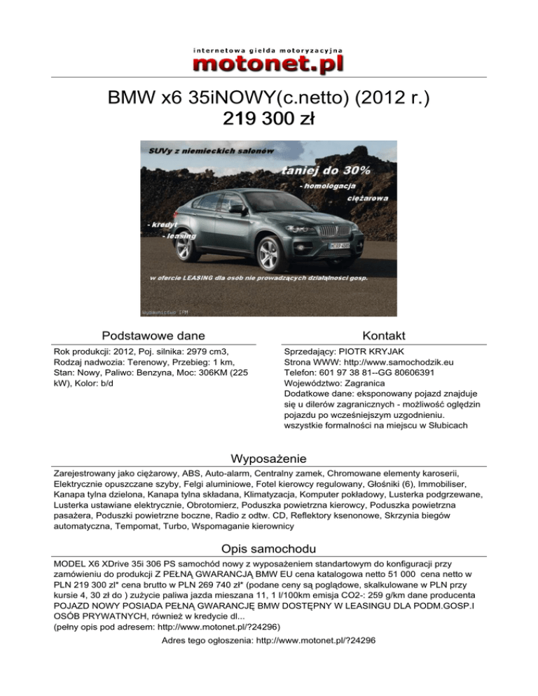 BMW x6 35iNOWY(c.netto) (2012 r.) 219 300 zł Podstawowe dane Kontakt Rok produkcji: 2012, Poj. silnika: 2979 cm3, Rodzaj nadwozia: Terenowy, Przebieg: 1 km, Stan: Nowy, Paliwo: Benzyna, Moc: 306KM (225 kW), Kolor: b/d Sprzedający: PIOTR KRYJAK Strona WWW: http://www.samochodzik.eu Telefon: 601 97 38 81--GG 80606391 Województwo: Zagranica Dodatkowe dane: eksponowany pojazd znajduje się u dilerów zagranicznych - możliwość oględzin pojazdu po wcześniejszym uzgodnieniu. wszystkie formalności na miejscu w Słubicach Wyposażenie Zarejestrowany jako ciężarowy, ABS, Auto-alarm, Centralny zamek, Chromowane elementy karoserii, Elektrycznie opuszczane szyby, Felgi aluminiowe, Fotel kierowcy regulowany, Głośniki (6), Immobiliser, Kanapa tylna dzielona, Kanapa tylna składana, Klimatyzacja, Komputer pokładowy, Lusterka podgrzewane, Lusterka ustawiane elektrycznie, Obrotomierz, Poduszka powietrzna kierowcy, Poduszka powietrzna pasażera, Poduszki powietrzne boczne, Radio z odtw. CD, Reflektory ksenonowe, Skrzynia biegów automatyczna, Tempomat, Turbo, Wspomaganie kierownicy Opis samochodu MODEL X6 XDrive 35i 306 PS samochód nowy z wyposażeniem standartowym do konfiguracji przy zamówieniu do produkcji Z PEŁNĄ GWARANCJĄ BMW EU cena katalogowa netto 51 000 cena netto w PLN 219 300 zl* cena brutto w PLN 269 740 zł* (podane ceny są poglądowe, skalkulowane w PLN przy kursie 4, 30 zł do ) zużycie paliwa jazda mieszana 11, 1 l/100km emisja CO2-: 259 g/km dane producenta POJAZD NOWY POSIADA PEŁNĄ GWARANCJĘ BMW DOSTĘPNY W LEASINGU DLA PODM.GOSP.I OSÓB PRYWATNYCH, również w kredycie dl... (pełny opis pod adresem: http://www.motonet.pl/?24296) Adres tego ogłoszenia: http://www.motonet.pl/?24296