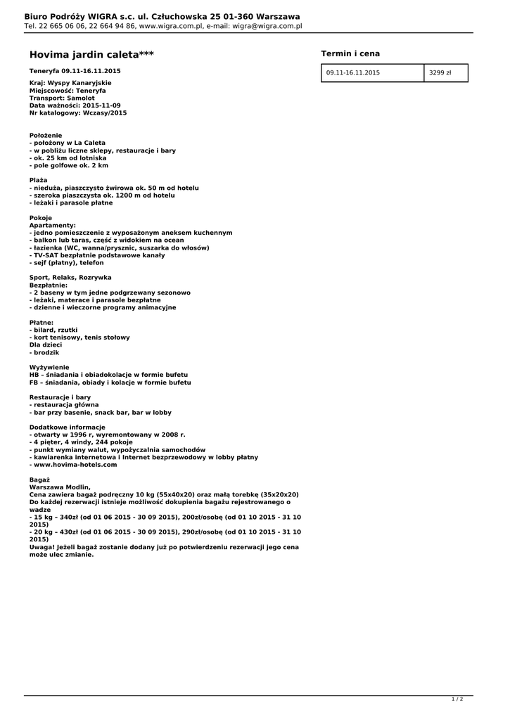 Biuro Podróży WIGRA s.c. ul. Człuchowska 25 01-360 Warszawa Tel. 22 665 06 06, 22 664 94 86, www.wigra.com.pl, e-mail: [email protected] Hovima jardin caleta*** Teneryfa 09.11-16.11.2015 Termin i cena 09.11-16.11.2015 3299 zł Kraj: Wyspy Kanaryjskie Miejscowość: Teneryfa Transport: Samolot Data ważności: 2015-11-09 Nr katalogowy: Wczasy/2015 Położenie - położony w La Caleta - w pobliżu liczne sklepy, restauracje i bary - ok. 25 km od lotniska - pole golfowe ok. 2 km Plaża - nieduża, piaszczysto żwirowa ok. 50 m od hotelu - szeroka piaszczysta ok. 1200 m od hotelu - leżaki i parasole płatne Pokoje Apartamenty: - jedno pomieszczenie z wyposażonym aneksem kuchennym - balkon lub taras, część z widokiem na ocean - łazienka (WC, wanna/prysznic, suszarka do włosów) - TV-SAT bezpłatnie podstawowe kanały - sejf (płatny), telefon Sport, Relaks, Rozrywka Bezpłatnie: - 2 baseny w tym jedne podgrzewany sezonowo - leżaki, materace i parasole bezpłatne - dzienne i wieczorne programy animacyjne Płatne: - bilard, rzutki - kort tenisowy, tenis stołowy Dla dzieci - brodzik Wyżywienie HB – śniadania i obiadokolacje w formie bufetu FB – śniadania, obiady i kolacje w formie bufetu Restauracje i bary - restauracja główna - bar przy basenie, snack bar, bar w lobby Dodatkowe informacje - otwarty w 1996 r, wyremontowany w 2008 r. - 4 pięter, 4 windy, 244 pokoje - punkt wymiany walut, wypożyczalnia samochodów - kawiarenka internetowa i Internet bezprzewodowy w lobby płatny - www.hovima-hotels.com Bagaż Warszawa Modlin, Cena zawiera bagaż podręczny 10 kg (55x40x20) oraz małą torebkę (35x20x20) Do każdej rezerwacji istnieje możliwość dokupienia bagażu rejestrowanego o wadze - 15 kg – 340zł (od 01 06 2015 - 30 09 2015), 200zł/osobę (od 01 10 2015 - 31 10 2015) - 20 kg – 430zł (od 01 06 2015 - 30 09 2015), 290zł/osobę (od 01 10 2015 - 31 10 2015) Uwaga! Jeżeli bagaż zostanie dodany już po potwierdzeniu rezerwacji jego cena może ulec zmianie. 1/2 Biuro Podróży WIGRA s.c. ul. Człuchowska 25 01-360 Warszawa Tel. 22 665 06 06, 22 664 94 86, www.wigra.com.pl, e-mail: [email protected] 2/2 Powered by TCPDF (www.tcpdf.org)