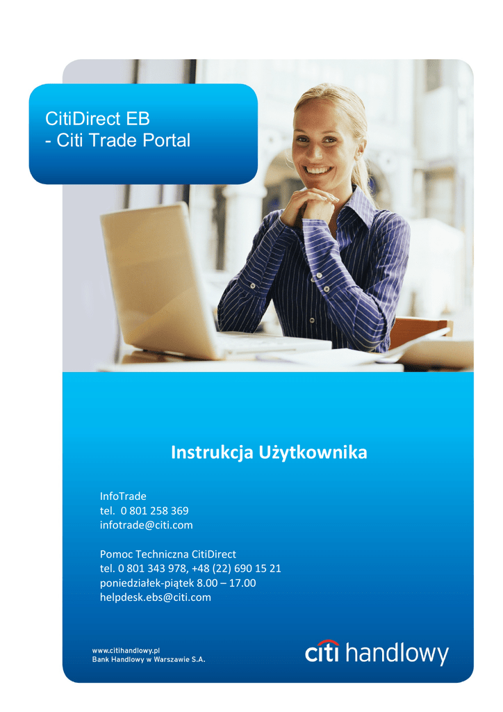 CitiDirect EB - Citi Trade Portal Instrukcja Użytkownika InfoTrade tel. 0 801 258 369 [email protected] Pomoc Techniczna CitiDirect tel. 0 801 343 978, +48 (22) 690 15 21 poniedziałek‐piątek 8.00 – 17.00 [email protected] Spis Treści 2 1. LOGOWANIE /ELEKTRONICZNA IDENTYFIKACJA ................................................................................................ 3 2. FAKTURY .......................................................................................................................................................... 5 1. WPROWADZANIE ......................................................................................................................................................... 5 2. WYSYŁANIE ................................................................................................................................................................ 7 3. AUTORYZACJA ............................................................................................................................................................. 8 3. SPRAWY BIEŻĄCE ............................................................................................................................................. 9 1. 2. 3. 4. 5. LISTA SPŁAT ................................................................................................................................................................ 9 STATUS PORTFELA ...................................................................................................................................................... 10 LISTA ALERTÓW ......................................................................................................................................................... 13 EFAKTURY ................................................................................................................................................................ 13 PISMA/POTWIERDZENIA .............................................................................................................................................. 14 4. RAPORTY ....................................................................................................................................................... 15 5. UMOWY ......................................................................................................................................................... 16 6. USTAWIENIA .................................................................................................................................................. 17 1. 2. 3. 4. SCHEMAT IMPORTU .................................................................................................................................................... 17 POWIADOMIENIA ....................................................................................................................................................... 18 PASEK SKRÓTÓW ....................................................................................................................................................... 18 USTAWIENIA GLOBALNE .............................................................................................................................................. 19 1. Logowanie /elektroniczna identyfikacja Logowanie do Citi Trade Portal odbywa się poprzez Portal CitiDirect EB. W przeglądarce internetowej otwórz adres: https://portal.CitiDirect.com Podczas pierwszego wywołania lub po usunięciu plików cookie pojawi się wybór kraju. Wybierz Poland i kliknij Go. Otworzy się poniższa strona logowania: W polu Metoda logowania wybierz Karta Safeword. W polu Identyfikator Użytkownika wpisz nazwę podaną przez Bank. Posługując się kartą Safeword, wygeneruj hasło: Naciśnij ON, aby włączyć Kartę. Na wyświetlaczu pojawi się napis ENTER PIN. Wpisz swój PIN. Z chwilą naciśnięcia ostatniej cyfry PIN‐u na wyświetlaczu pojawi się napis HOST?. Naciśnij cyfrę 2. Na wyświetlaczu pojawi się hasło. UWAGA Hasło może składać się z cyfr i liter. Wielkość liter nie ma znaczenia. Literami mogą być tylko takie znaki, które nie mogą być cyframi. W razie wątpliwości, czy wpisać literę czy cyfrę, pierwszeństwo ma zawsze cyfra (np. zawsze 0 nigdy „O”). Hasło jest jednorazowe. Przy każdym logowaniu musi być generowane od nowa. Przepisz hasło do odpowiedniego pola. Naciśnij Zaloguj, aby uruchomić program. Zaznaczenie opcji Pamiętaj mój identyfikator logowania na tym komputerze pozwoli przy kolejnych logowaniach wybierać identyfikator z listy. Usunięcie plików cookie spowoduje, że Identyfikator zniknie i znowu trzeba będzie skorzystać z opcji Nowy użytkownik. 3 Po zalogowaniu się do serwisu, w górnym menu kliknij na Finansowanie Handlu: UWAGA Aplikacja uruchamia się w nowym oknie, bądź w nowej karcie przeglądarki. Jeśli wyświetlił się komunikat o zablokowaniu wyskakującego okienka, należy kliknąć na jego treść i zezwolić na wyskakujące okienko. Strona główna Po uruchomieniu aplikacji na ekranie Użytkownika pojawi się poniższa strona: Instrukcja Użytkownika odnosi się do wszystkich produktów faktoringowych obsługiwanych przez Citi Trade Portal. Dostęp do poszczególnych pozycji i podpozycji menu głównego uzależniona jest od uprawnień przypisanych Użytkownikowi zgodnie z odpowiednią dokumentacją. Część „Moje skróty” ‐ składa się z maksymalnie 5 skrótów wybranych przez Użytkownika. Przycisk „dostosuj…” po prawej stronie służy do dokonania wyboru widocznych przycisków. Część „Alerty” ‐ obejmuje informacje dotyczące alertów przesłanych do Użytkownika, których nie otwarto (nie były wyświetlane na formatce szczegółów wiadomości). Maksymalna liczba wyświetlanych alertów w tej części wynosi 10. Pod tabelą znajduje się przycisk „Zaznacz jako przeczytane”, za pomocą którego możliwe jest oznaczenie al