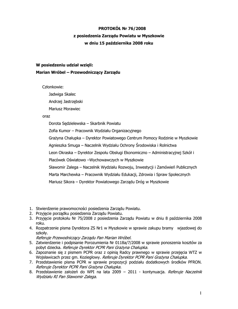 PROTOKÓŁ Nr 76/2008 z posiedzenia Zarządu Powiatu w Myszkowie w dniu 15 października 2008 roku W posiedzeniu udział wzięli: Marian Wróbel – Przewodniczący Zarządu Członkowie: Jadwiga Skalec Andrzej Jastrzębski Mariusz Morawiec oraz Dorota Sędzielewska – Skarbnik Powiatu Zofia Kumor – Pracownik Wydziału Organizacyjnego Grażyna Chałupka – Dyrektor Powiatowego Centrum Pomocy Rodzinie w Myszkowie Agnieszka Smuga – Naczelnik Wydziału Ochrony Środowiska i Rolnictwa Leon Okraska – Dyrektor Zespołu Obsługi Ekonomiczno – Administracyjnej Szkół i Placówek Oświatowo –Wychowawczych w Myszkowie Sławomir Zalega – Naczelnik Wydziału Rozwoju, Inwestycji i Zamówień Publicznych Marta Marchewka – Pracownik Wydziału Edukacji, Zdrowia i Spraw Społecznych Mariusz Sikora – Dyrektor Powiatowego Zarządu Dróg w Myszkowie 1. Stwierdzenie prawomocności posiedzenia Zarządu Powiatu. 2. Przyjęcie porządku posiedzenia Zarządu Powiatu. 3. Przyjęcie protokołu Nr 75/2008 z posiedzenia Zarządu Powiatu w dniu 8 października 2008 roku. 4. Rozpatrzenie pisma Dyrektora ZS Nr1 w Myszkowie w sprawie zakupu bramy wjazdowej do szkoły. Referuje Przewodniczący Zarządu Pan Marian Wróbel. 5. Zatwierdzenie i podpisanie Porozumienia Nr 0118a/7/2008 w sprawie ponoszenia kosztów za pobyt dziecka. Referuje Dyrektor PCPR Pani Grażyna Chałupka. 6. Zapoznanie się z pismem PCPR oraz z opinią Radcy prawnego w sprawie przejęcia WTZ w Wojsławicach przez gm. Koziegłowy. Referuje Dyrektor PCPR Pani Grażyna Chałupka. 7. Przedstawienie pisma PCPR w sprawie propozycji podziału dodatkowych środków PFRON. Referuje Dyrektor PCPR Pani Grażyna Chałupka. 8. Przedstawienie założeń do WPI na lata 2009 – 2011 - kontynuacja. Referuje Naczelnik Wydziału RI Pan Sławomir Zalega. 1 9. Materiały na Komisje Rady Powiatu: a) Informacja na temat wykorzystania środków z funduszy unijnych w roku 2008 oraz perspektywy ich wykorzystania w kolejnych latach okresu budżetowego 2007 – 2013. Referuje Naczelnik Wydziału RI Pan Sławomir Zalega. 10. Przedstawienie projektów i podjęcie uchwały Zarządu Powiatu w sprawie: a) zmiany Uchwały Nr 250/2008 Zarządu Powiatu w Myszkowie z dnia 20 sierpnia 2008r. w sprawie ogłoszenia otwartego konkursu ofert na realizację zadania Powiatu Myszkowskiego z zakresu pomocy społecznej – prowadzenie o zasięgu ponadgminnym Domu Pomocy Społecznej dla osób niepełnosprawnych intelektualnie. Referuje pracownik Wydziału ES Pani Marta Marchewka. b) zmiany Uchwały Nr 279/2008 w sprawie upoważnienia Dyrektora ZEAS do zawarcia umowy zlecenia z Inspektorem Nadzoru Budowlanego. Referuje Naczelnik Wydziału OŚR Pani Agnieszka Smuga oraz Dyrektor ZEAS Pan Leon Okraska. c) zmiany Uchwały Nr 280/2008 w sprawie upoważnienia Dyrektora ZEAS do przygotowania i przeprowadzenia postępowań o udzielenie zamówień publicznych. Referuje Naczelnik Wydziału OŚR Pani Agnieszka Smuga oraz Dyrektor ZEAS Pan Leon Okraska. d) przeniesienia wydatków z rezerwy ogólnej. Referuje Skarbnik Powiatu Pani Dorota Sędzielewska. e) przeniesienia planu wydatków w budżecie Powiatu Myszkowskiego na 2008 rok. Referuje Skarbnik Powiatu Pani Dorota Sędzielewska. 11.Przedstawienie ogólnych danych dotyczących projektu budżetu Powiatu Myszkowskiego na rok 2009. Referuje Skarbnik Powiatu Pani Dorota Sędzielewska. Przebieg posiedzenia Zarządu Powiatu. Ad. 1. Stwierdzenie prawomocności posiedzenia Zarządu Powiatu. Przewodniczący Zarządu Powiatu Pan Marian Wróbel, na podstawie listy obecności, stanowiącej załącznik nr 1 do niniejszego protokołu, stwierdził prawomocność posiedzenia Zarządu w dniu 15 października 2008 roku. Ad. 2. Przyjęcie porządku posiedzenia Zarządu Powiatu. Członkowie Zarządu Powiatu do przedstawionego przez Przewodniczącego Zarządu porządku posiedzenia nie wnieśli uwag. Członkowie Zarządu Powiatu otrzymali kserokopie wszystkich dokumentów będących przedmiotem dzisiejszego posiedzenia Zarządu. Ad.3. Przyjęcie protokołu Nr 75/2008 z posiedzenia Zarządu Powiatu w dniu 8 października 2008 roku. Protokół Nr 75/2008 z posiedzenia Zarządu Powiatu w dniu 8 października 2008 roku został jednogłośnie przyjęty poprzez jego podpisanie. Członkowie Zarządu nie wnieśli uwag do w/w protokołu. 2 Ad.4. Rozpatrzenie pisma Dyrektora ZS Nr1 w Myszkowie w sprawie zakupu bramy wjazdowej do szkoły. Przewodniczący Zarządu Pan Marian Wróbel przypomniał treść pisma Dyrektora ZS Nr 1 w Myszkowie. Pismo dotyczyło przyznania dodatkowych środków finansowych w kwocie 5.000 złotych z przeznaczeniem na zakup bramy wjazdowej do szkoły. Pismo stanowi załącznik Nr 2 do niniejszego protokołu. Przewodniczący Zarządu poinformował, że przedmiotowa sfinansowana z środków własnych Zespołu Szkół Nr 1 w Myszkowie. brama zostanie Ad.5. Zatwierdzenie i podpisanie Porozumienia Nr 0118a/7/2008 w sprawie ponoszenia kosztów za pobyt dziecka. Dyrektor PCPR Pani Grażyna Chałupka przedstawiła w/w porozumienie, zawierane pomiędzy Powiatem Myszkowskim a Powiatem Częstochowskim w sprawie ponoszenia kosztów za pobyt dziecka – Mateusza Brzeszczaka pochodzącego z terenu Powiatu Częstochowskiego, umieszczonego w rodzinie zastępczej na terenie Powiatu Myszkowskiego u Państwa Pniak. Kserokopia Porozumienia stanowi załącznik Nr 3 do niniejszego protokołu. W imieniu Zarządu Powiatu w Myszkowie w/w Porozumienie podpisał Starosta Myszkowski i Członek Zarządu. Ad.6. Zapoznanie się z pismem PCPR oraz z opinią Radcy prawnego w sprawie przejęcia WTZ w Wojsławicach przez gm. Koziegłowy. Dyrektor PCPR Pani Grażyna Chałupka przedstawiła pismo PCPR skierowane do Radcy prawnego Starostwa Powiatowego w Myszkowie. Zapoznała Zarząd z opinią radcy w sprawie zasadności podejmowania uchwały dot. odpowiednio przekazanego zadania, jego przyjęcia. Według opinii Radcy prawnego nie musi znaleźć się w uchwale zapis upoważniający Bur