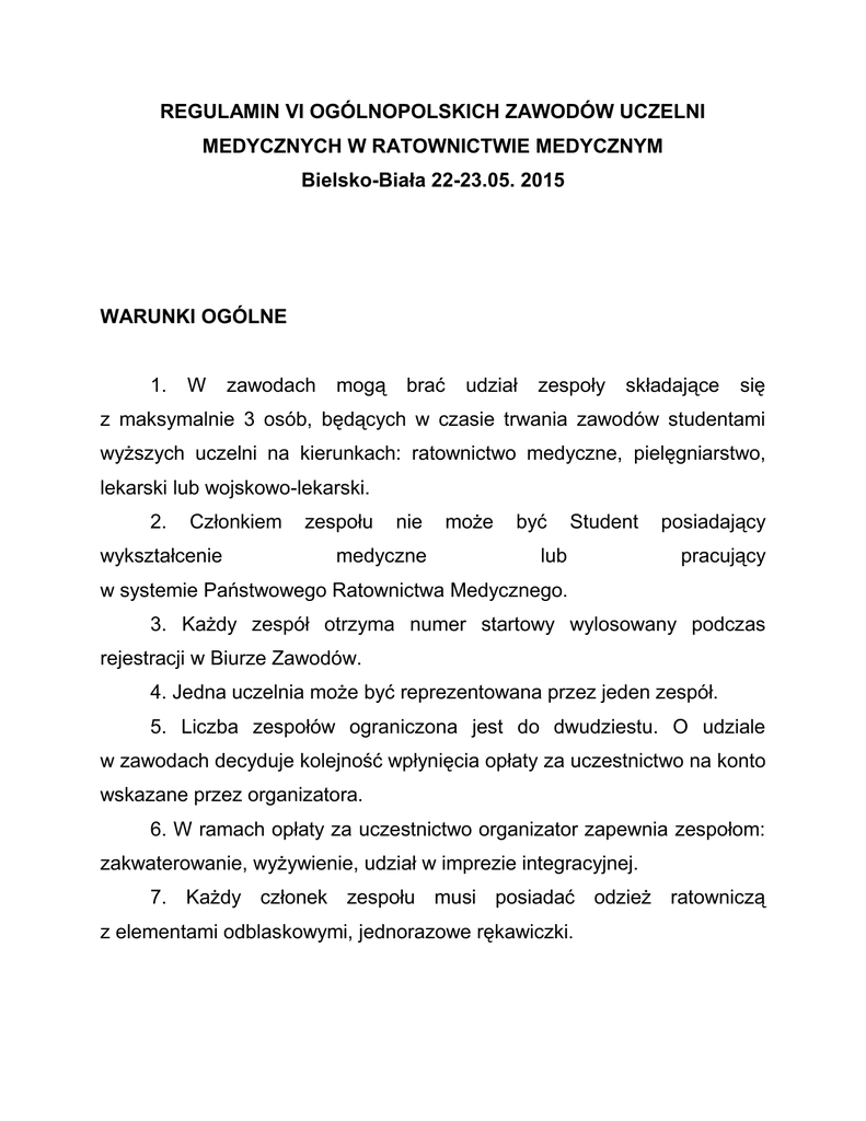 REGULAMIN VI OGÓLNOPOLSKICH ZAWODÓW UCZELNI MEDYCZNYCH W RATOWNICTWIE MEDYCZNYM Bielsko-Biała 22-23.05. 2015 WARUNKI OGÓLNE 1. W zawodach mogą brać udział zespoły składające się z maksymalnie 3 osób, będących w czasie trwania zawodów studentami wyższych uczelni na kierunkach: ratownictwo medyczne, pielęgniarstwo, lekarski lub wojskowo-lekarski. 2. Członkiem wykształcenie zespołu nie medyczne może być Student lub posiadający pracujący w systemie Państwowego Ratownictwa Medycznego. 3. Każdy zespół otrzyma numer startowy wylosowany podczas rejestracji w Biurze Zawodów. 4. Jedna uczelnia może być reprezentowana przez jeden zespół. 5. Liczba zespołów ograniczona jest do dwudziestu. O udziale w zawodach decyduje kolejność wpłynięcia opłaty za uczestnictwo na konto wskazane przez organizatora. 6. W ramach opłaty za uczestnictwo organizator zapewnia zespołom: zakwaterowanie, wyżywienie, udział w imprezie integracyjnej. 7. Każdy członek zespołu musi posiadać odzież ratowniczą z elementami odblaskowymi, jednorazowe rękawiczki. KONKURENCJE 1. Zawody polegają na wykonaniu konkurencji medycznych, będących symulowanymi akcjami ratunkowymi . 2. Konkurencje medyczne będą oceniane na podstawie aktualnie obowiązujących wytycznych Europejskiej Rady Resuscytacji, ALS, EPLS i ITLS. 3. Harmonogram konkurencji zostanie wręczony zespołom podczas rejestracji w Biurze Zawodów. 4. Treść wezwania będącego przedmiotem konkurencji zostanie wręczona zespołowi w formie pisemnej bezpośrednio przed rozpoczęciem zadania w Biurze Zawodów. 5. Na każdym stanowisku zespół jest oceniany przez sędziego głównego oraz sędziów pomocniczych. Zespoły zobowiązane są do przestrzegania poleceń sędziów.. 6. Na wykonanie każdego zadania zespół posiada określoną ilość czasu, o czasie przeznaczonym na wykonanie zadania zespół zostanie poinformowany bezpośrednio przed rozpoczęciem zadania przez sędziego. Rozpoczęcie wykonywania zadania i tym samym start pomiaru czasu sygnalizuje sędzia główny zadania słowami „Uwaga czas start!” 7. Sędzia zadania poinformuje zespół dwie minuty przed końcem wyznaczonego czasu słowami „Dwie minuty do końca zadania”, 8. Zadanie zostaje zakończone słowami sędziego „Dziękuję, czas upłynął”. 9. Jeżeli przed upływem wyznaczonego czasu zespół uzna, że wykonał wszystkie konieczne czynności ratunkowe, może zakończyć zadanie w dowolnym momencie na własne życzenie informując o tym sędziego głównego zadania. 10. Po upływie czasu, na polecenie sędziego, zespół ma obowiązek niezwłocznie opuścić miejsce wykonywania zadania, zabierając swój sprzęt. 11. Parametry życiowe poszkodowanego podawane są zespołowi przez sędziów, po prawidłowym wykonaniu ich pomiaru. Sędzia bezpośrednio przed rozpoczęciem zadania poinformuje zespół, iż badanie odbywa się w warunkach realnych na pozorancie lub na fantomie symulującym osobę poszkodowaną. 12. W czasie wykonywania zadań zabrania się zespołom oraz opiekunom drużyn korzystania ze środków łączności w postaci telefonów, radiostacji, pagerów, krótkofalówek oraz wszelkich innych urządzeń służących do komunikacji (z wyłączeniem stosowanych w celu wykonania zadania) Korzystanie z w/w środków łączności oznaczać będzie dyskwalifikację zespołu. 13. Podczas wykonywania zadania, na jego terenie mogą znajdować się tylko osoby dopuszczone przez organizatora (zespół, sędziowie, opiekun drużyny, przedstawiciele organizatora, media lub inne osoby posiadające zgodę sędziego głównego). 14. Na miejscu rozgrywania konkurencji nie wolno przebywać zawodnikom i opiekunom drużyn, które w tym czasie nie wykonują danego zadania. 15. Zespół może korzystać jedynie z takiej ilości sprzętu, jaką jest w stanie samodzielnie nieść, bez wykorzystania pojazdów ani pomocy osób trzecich, w tym opiekuna drużyny. BEZPIECZEŃSTWO 1. Podczas zawodów obowiązuje zakaz spożywania alkoholu oraz środków odurzających. Organizator zastrzega sobie prawo kontroli trzeźwości. Uczestnik zawodów, który stawi się do wykonywania zadań w stanie nietrzeźwości wraz ze swoim zespołem zostanie zdyskwalifikowany z dalszego udziału w zawodach oraz o zdarzeniu zostaną poinformowane władze macierzystej Uczelni. 2. Podczas wykonywania zadań i podczas części oficjalnej zawodów obowiązuje zakaz palenia. 3. Poważne naruszenie zasad bezpieczeństwa podczas trwania zawodów będzie karane wykluczeniem zespołu z dalszej rywalizacji. OPIEKUN DRUŻYNY 1. Każdemu zespołowi w czasie realizacji zadań może towarzyszyć tylko jeden opiekun. 2. Opiekun drużyny może przebywać w miejscu konkurencji tylko towarzysząc własnemu zespołowi. 3. Organizator zapewnia opiekunowi drużyny zakwaterowanie, wyżywienie oraz możliwość uczestnictwa w imprezach towarzyszących zawodom, po wcześniejszym zgłoszeniu i opłaceniu pobytu. 4. Opiekun drużyny nie może pomagać zespołowi w przenoszeniu ekwipunku na miejsce zdarzenia. 5. W trakcie wykonywania zadania opiekun drużyny nie może w żadnej formie nawiązywać kontaktu z zespołem, któremu towarzyszy. 6. Podczas zadań opiekun drużyny może dokonywać rejestracji działań zespołu przy użyciu kamer wideo, aparatów fotograficznych lub innych urządzeń, jednak zarejestrowany materiał nie może być podstawą do wysuwania roszczeń wobec organizatorów lub sędziów. 7. Opiekun drużyny nie może być sędzią pomocniczym danej konkurencji. PUNKTACJA 1. Zadanie może posiadać w swoim scenariuszu procedurę, której wykonanie, błędne wykonanie lub zaniechanie stanowi błąd krytyczny. W wypadku popełnienia błędu krytycznego zespół uzyskuje za zadanie tylko punkty zdobyte przed jego popełnieniem. O błędzie krytycznym zespół nie jest informowany w trakcie zawodów. 2. Sędzia może zadawać zespołowi dodatkowe punktowane pytania, dotyczące decyzji o 