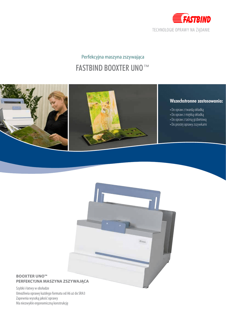 technologie oprawy na żądanie Perfekcyjna maszyna zszywająca Fastbind BooXTer UNO™ Wszechstronne zastosowania: • Do opraw z twardą okładką • Do opraw z miękką okładką • Do opraw z taśmą grzbietową • Do prostej oprawy zszywkami BooXTer uno™ perfekcyjna maszyna zszywająca Szybki i łatwy w obsłudze Umożliwia oprawę każdego formatu od A6 aż do SRA3 Zapewnia wysoką jakość oprawy Ma niezwykle ergonomiczną konstrukcję Fastbind BooXTer UNO™ Prostota obsługi i wysoka jakość oprawy Nowatorski Fastbind BooXTer Uno™ jest najlepszą maszyną do oprawy. Jej potężny elektroniczny moduł zszywający zapewnia uzyskanie doskonałego rezultatu procesu oprawy, przy zastosowaniu dowolnych materiałów; maszyna radzi sobie z papierem fotograficznym oraz papierem powlekanym tak samo dobrze jak ze standardowym papierem ksero. BooXTer Uno™ może zostać rozbudowany o opcjonalny Cover Setter™ - proste w użyciu narzędzie pozycjonujące, ułatwiające dołączanie twardej okładki do bloku kartek. Cover Setter™ można zainstalować na BooXTer Uno™ lub postawić obok jako osobną jednostkę. Szybkość i niezawodność pracy Kompaktowy i bezgłośny BooXTer Uno™ jest gotowy do pracy natychmiast po włączeniu. Wbudowane półki w tylnej części maszyny sprawiają, że wszystkie materiały eksploatacyjne są na wyciągnięcie ręki. Dzięki stabilnej powierzchni pozycjonującej oraz regulowanym podparciu bloku, typowy plik kartek w formacie A4 możesz zszyć w czasie krótszym niż 10 sekund. Blok kartek układa się grzbietem do dołu, dzięki czemu grawitacja pomaga Ci w perfekcyjnym uporządkowaniu kartek. Elektryczny moduł zszywający radzi sobie doskonale zarówno z papierem fotograficznym, powlekanym jak i standardowym papierem ksero. Unikalna metoda bocznego szycia gwarantuje równe rozmieszczenie zszywek wzdłuż grzbietu bloku. Rezultat jest zawsze ten sam – trwała, foremna, perfekcyjnie oprawiona książka. Fastbind BooXTer Uno™ to jedna z najbardziej wszechstronnych maszyn do oprawy na rynku. Kompletne rozwiązania w zakresie oprawy System Fastbind zapewnia szeroką gamę doskonałych urządzeń oraz materiałów eksploatacyjnych, abyś mógł w pełni korzystać z funkcjonalności BooXTer Uno™. Skorzystaj także z innych produktów Fastbind, aby jeszcze bardziej poszerzyć swoje możliwości w zakresie wykonywania opraw: • użyj stanowiska do montażu personalizowanych okładek twardych Fastbind Casematic • użyj maszyn bigujących Fastbind - wykonaj perfekcyjne miękkie okładki Najszerszy wachlarz rozwiązań w zakresie metod opraw na rynku: • oprawa z personalizowaną okładką twardą • oprawa z personalizowaną okładką miękką • oprawa ze standardową okładką twardą • oprawa z taśmą grzbietową, bezokładkowa, etc... • użyj kartonów montażowych Fastbind End Sheet, aby połączyć okładkę z blokiem kartek Dane techniczne Metoda oprawy Precyzyjne zszywanie boczne Obsługiwane typy oprawy oprawa z taśmą grzbietową, miękka okładka, oprawa zszywkami Opcjonalne typy oprawy Standardowe i personalizowane twarde okładki (cover setter sprzedawany oddzielnie) Wydajność produkcji: sztuk na godzinę 1) bez okładek: z okładkami: 2 zszywki, z jednej strony: 7 zszywek, z jednej strony: taśma grzbietowa (A4 pion): twarda okładka (A4 poziom): miękka okładka (A4 poziom): do 800 do 450 do 140 do 100 do 90 Wymiary bloku 105-450 mm (długość grzbietu) x 105-450 mm (szerokość) Maksymalna grubość oprawy 2) papier ksero 8 mm / papier powlekany 5 mm Specyfikacja części elektrycznych 100-240 VAC, 50/60 Hz, 1.3 A, bezpiecznik 4A(T) Wymiary maszyny (szer. x dł. x wys.) 45 x 45 x 34 cm Waga brutto 15 kg Wymiary opakowania (szer. x dł. x wys.) 56 x 56 x 40 cm Certyfikaty CE typowy plik kartek w formacie A4 możesz zszyć w czasie krótszym niż 10 sekund. 1) Uwzględniono szycie oraz montaż okładki do bloku - rzeczywista wydajność może się różnić, w zależności od operatora 2) Maksymalna grubość oprawy może się różnić w zależności od właściwości szytego materiału Objęte patentem: BooXTer Uno™, kartony montażowe End Sheets oraz taśma grzbietowa. Informacje aktualne na miesiąc czerwiec 2010 – mogą ulec zmianie bez uprzedniego powiadomienia. Przedstawiciel w Polsce: TOMACO-INTRO 97-500 Radomsko, ul. Krasickiego 108 Tel: 044 6821600 • Fax: 044 6821019 [email protected] • www.fastbindpolska.pl BooXTer Uno™ może zostać rozbudowany o opcjonalny Cover Setter™. Użyj maszyn typu Fastbind Casematic do wykonywania okładek twardych. Producent: Maping Co Kuusiniemi 10, 02710 Espoo, FINLAND Tel: +358 9 562 6022 • Fax: +358 9 562 6215 [email protected] • www.fastbind.com