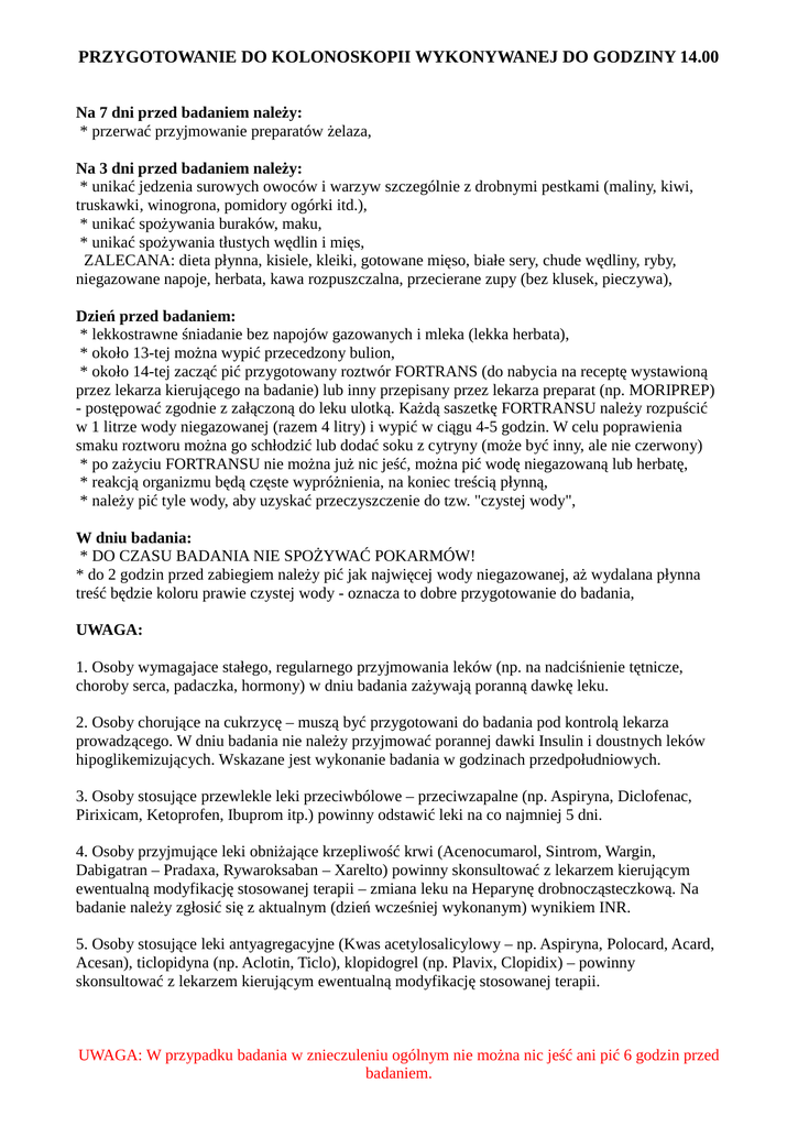 PRZYGOTOWANIE DO KOLONOSKOPII WYKONYWANEJ DO GODZINY 14.00 Na 7 dni przed badaniem należy: * przerwać przyjmowanie preparatów żelaza, Na 3 dni przed badaniem należy: * unikać jedzenia surowych owoców i warzyw szczególnie z drobnymi pestkami (maliny, kiwi, truskawki, winogrona, pomidory ogórki itd.), * unikać spożywania buraków, maku, * unikać spożywania tłustych wędlin i mięs, ZALECANA: dieta płynna, kisiele, kleiki, gotowane mięso, białe sery, chude wędliny, ryby, niegazowane napoje, herbata, kawa rozpuszczalna, przecierane zupy (bez klusek, pieczywa), Dzień przed badaniem: * lekkostrawne śniadanie bez napojów gazowanych i mleka (lekka herbata), * około 13-tej można wypić przecedzony bulion, * około 14-tej zacząć pić przygotowany roztwór FORTRANS (do nabycia na receptę wystawioną przez lekarza kierującego na badanie) lub inny przepisany przez lekarza preparat (np. MORIPREP) - postępować zgodnie z załączoną do leku ulotką. Każdą saszetkę FORTRANSU należy rozpuścić w 1 litrze wody niegazowanej (razem 4 litry) i wypić w ciągu 4-5 godzin. W celu poprawienia smaku roztworu można go schłodzić lub dodać soku z cytryny (może być inny, ale nie czerwony) * po zażyciu FORTRANSU nie można już nic jeść, można pić wodę niegazowaną lub herbatę, * reakcją organizmu będą częste wypróżnienia, na koniec treścią płynną, * należy pić tyle wody, aby uzyskać przeczyszczenie do tzw. "czystej wody", W dniu badania: * DO CZASU BADANIA NIE SPOŻYWAĆ POKARMÓW! * do 2 godzin przed zabiegiem należy pić jak najwięcej wody niegazowanej, aż wydalana płynna treść będzie koloru prawie czystej wody - oznacza to dobre przygotowanie do badania, UWAGA: 1. Osoby wymagajace stałego, regularnego przyjmowania leków (np. na nadciśnienie tętnicze, choroby serca, padaczka, hormony) w dniu badania zażywają poranną dawkę leku. 2. Osoby chorujące na cukrzycę – muszą być przygotowani do badania pod kontrolą lekarza prowadzącego. W dniu badania nie należy przyjmować porannej dawki Insulin i doustnych leków hipoglikemizujących. Wskazane jest wykonanie badania w godzinach przedpołudniowych. 3. Osoby stosujące przewlekle leki przeciwbólowe – przeciwzapalne (np. Aspiryna, Diclofenac, Pirixicam, Ketoprofen, Ibuprom itp.) powinny odstawić leki na co najmniej 5 dni. 4. Osoby przyjmujące leki obniżające krzepliwość krwi (Acenocumarol, Sintrom, Wargin, Dabigatran – Pradaxa, Rywaroksaban – Xarelto) powinny skonsultować z lekarzem kierującym ewentualną modyfikację stosowanej terapii – zmiana leku na Heparynę drobnocząsteczkową. Na badanie należy zgłosić się z aktualnym (dzień wcześniej wykonanym) wynikiem INR. 5. Osoby stosujące leki antyagregacyjne (Kwas acetylosalicylowy – np. Aspiryna, Polocard, Acard, Acesan), ticlopidyna (np. Aclotin, Ticlo), klopidogrel (np. Plavix, Clopidix) – powinny skonsultować z lekarzem kierującym ewentualną modyfikację stosowanej terapii. UWAGA: W przypadku badania w znieczuleniu ogólnym nie można nic jeść ani pić 6 godzin przed badaniem.