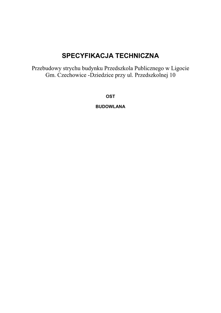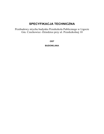SPECYFIKACJA TECHNICZNA Przebudowy strychu budynku Przedszkola Publicznego w Ligocie Gm. Czechowice -Dziedzice przy ul. Przedszkolnej 10 OST BUDOWLANA 2 ROZDZIAŁ 1 – OKREŚLENIA I POJĘCIA WSTĘPNE 1. Gdziekolwiek w tekście niniejszego opracowania pojawia się skrót ST oznacza to specyfikację techniczną wykonania i odbioru robót, jako element składowy inwestorskiej dokumentacji projektowej, określoną Rozporządzeniem ministra Spraw Wewnętrznych i Administracji z dnia 26 lutego 1999 r. w sprawie metod i podstaw sporządzania kosztorysu inwestorskiego (Dz. U. Nr 26, poz. 235 z późniejszymi zmianami). 2. Gdziekolwiek w tekście niniejszego opracowania pojawia się określenie prawo budowlane oznacza to ustawę z dnia 7 lipca 1994 ze zmianami z dnia 27 marca 2003 r. (Dz. U. Nr 80, poz. 718 z dnia 10 maja 2003). 3. Gdziekolwiek w tekście niniejszego opracowania pojawia się określenie warunki techniczne oznacza to Rozporządzenie Ministra Infrastruktury z dnia 12 kwietnia 2002 r. w sprawie warunków technicznych, jakim powinny odpowiadać budynki i ich usytuowanie (Dz. U. Nr 75, poz. 690 z dnia 15 czerwca 2002 z późniejszymi zmianami). 4. Gdziekolwiek w tekście niniejszego opracowania pojawia się określenie WTWiOR oznacza to Warunki techniczne wykonania i odbioru robót budowlano-montażowych. Wydawnictwo ARKADY, Warszawa 1990. 5. Gdziekolwiek w tekście niniejszego opracowania pojawia się określenie norma oznacza to stosowne określenie standardu technicznego w postaci opracowania normowego, z zakresu norm aktualnie obowiązujących, wg spisu przedstawionego w Rozdziale II. 6. Gdziekolwiek w tekście niniejszego opracowania pojawia się określenie przepisy oznacza to stosowne przepisy techniczno-budowlane, z zakresu przepisów aktualnie obowiązujących, wg spisu przedstawionego w Rozdziale III. 7. Gdziekolwiek w tekście niniejszego opracowania pojawia się określenie Generalny Wykonawca oznacza to również wszelkich podwykonawców oraz dostawców materiałów i usług objętych kontraktem Generalnego Wykonawcy. 8. Gdziekolwiek w tekście niniejszego opracowania pojawia się określenie dostarczenie lub dostawa materiału lub usługi, oznacza to zakup, transport, składowanie, dostarczenie na budowę oraz w koniecznych przypadkach prawidłowe zainstalowanie techniczne w obiekcie. 9. Gdziekolwiek w tekście niniejszego opracowania pojawia się określenie Inspektor Nadzoru oznacza to inspektora nadzoru na mocy przepisów prawa budowlanego, działającego z upoważnienia i na zlecenie Zamawiającego. 10. Gdziekolwiek w tekście niniejszego opracowania pojawia się określenie Zamawiający, oznacza to inwestora przedsięwzięcia. 11. Gdziekolwiek w tekście niniejszego opracowania pojawia się określenie biuro architektoniczne lub Główny Projektant, oznacza to Przedsiębiorstwo Projektowo Budowlane INWEST-BUD J. Stawowczyk Czechowice-Dziedzice Niepodległości 48. 12. Gdziekolwiek w tekście niniejszego opracowania pojawia się określenie dokumenty budowy, oznacza to wszystkie wymagane przepisami dokumenty formalno-prawne pozwalające na rozpoczęcie i zgodną z prawem kontynuację prac budowlanych. 13. Gdziekolwiek w tekście niniejszego opracowania pojawia się określenie dokumentacja projektowa, oznacza Przebudowy strychu budynku Przedszkola Publicznego w Ligocie Gm. Czechowice -Dziedzice przy ul. Przedszkolnej 10 Gdziekolwiek w tekście niniejszego opracowania pojawia się określenie plac budowy lub budowa, oznacza to Ligota Gm. Czechowice -Dziedzice przy ul. Przedszkolnej 10 14. Wszystkie nieopisane zasady wykonawstwa i odbioru robót należy wykonywać zgodnie z zasadami sztuki budowlanej oraz WTWiOR a także wg procedur technologicznych dla poszczególnych, przyjętych i uzgodnionych metod wykonawstwa. 15. Wykonawcy robót ogólnobudowlanych otrzymują wynagrodzenie ryczałtowe w wysokości faktycznie zakontraktowanego zakresu prac, potwierdzonego przez Inspektora Nadzoru. Ceny jednostkowe w kosztorysie ofertowym są stałe w trakcie trwania umowy. 3 ROZDZIAŁ 2 – ZESTAWIENIE OBOWIĄZUJĄCYCH NORM Nr normy PN PN-62/B-02356 PN ISO 9699:2003 PN-85/B-01805 PN-86/B-01806 ŚCIANY PN-70/B-100026 PN-EN 12179:2002U PN-EN 13116:2002U PN-EN 12153:2002U PN-EN 12153:2002U PN-EN 12155:2002U PN-EN 13051:2002U PN-EN 12154:2002U PN-EN 845-1:2002 PN-EN 845-2:2002 PN-EN 845-3:2002 PN-EN 846-4 Zastępuje: PN-EN 846-4:2002U PN-EN 846-10:2002 PN-EN 846-13:2003 Zastępuje: PN-EN 846-4:2002 DRZWI I OKNA PN-EN 107:2002 PN-EN 13115:2002 Tytuł normy PN Koordynacja wymiarowa w budownictwie – Tolerancje wymiarów elementów budowlanych z betonów Właściwe użytkowanie w budownictwie – Wykaz zagadnień do przeglądu uwarunkowań przedsięwzięcia – Zawartość karty przedsięwzięcia przygotowanej dla projektu budowlanego Antykorozyjne zabezpieczenia w budownictwie – Ogólne zasady ochrony Antykorozyjne zabezpieczenia w budownictwie – Ogólne zasady użytkowania, konserwacji i napraw Ściany monolityczne z lekkich betonów z kruszywa mineralnego porowatego – Wymagania i badania Ściany osłonowe – Odporność na napór wiatru – Metoda badania Ściany osłonowe – Odporność na obciążenie wiatrem – Wymagania eksploatacyjne Ściany osłonowe – Przepuszczalność powietrza – Wymagania eksploatacyjne i klasyfikacja Ściany osłonowe – Przepuszczalność powietrza – Metoda badania Ściany osłonowe – Wodoszczelność – Badania laboratoryjne pod ciśnieniem stałym Ściany osłonowe – Wodoszczelność – Badania poligonowe Ściany osłonowe – Wodoszczelność – Wymagania eksploatacyjne i klasyfikacja Specyfikacja techniczna wyrobów dodatkowych do wznoszenia murów – Część 1: Kotwy, listwy kotwiące, wieszaki i wsporniki Specyfikacja techniczna wyrobów dodatkowych do wznoszenia murów – Część 2: Nadproża Specyfikacja techniczna wyrobów dodatkowych do wznoszenia murów – Część 3: Stalowe zbrojenie do spoin wspornych Metody bada