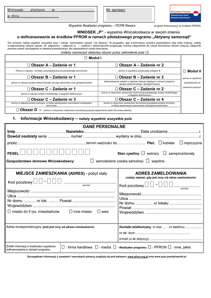 W ni osek złożono w ........................ Nr sprawy : w dni u . . . . . . . . . . . . . . . . . . . . . . . . . . . . Wypełnia Realizator programu – PCPR Rawicz program finansowany ze środków PFRON WNIOSEK „P” - wypełnia Wnioskodawca w swoim imieniu o dofinansowanie ze środków PFRON w ramach pilotażowego programu „Aktywny samorząd” We wniosku należy wypełnić wszystkie pola i rubryki, ewentualnie wpisać ”nie dotyczy”. W przypadku, gdy w formularzu wniosku przewidziano zbyt mało miejsca, należy w odpowiedniej rubryce wpisać „W załączeniu – załącznik nr ..”, czytelnie i jednoznacznie przypisując numery załączników do rubryk formularza, których dotyczą. Załączniki powinny zostać sporządzone w układzie przewidzianym dla odpowiednich rubryk formularza. (należy zaznaczyć właściwy obszar przez zakreślenie pola ) Moduł I Obszar A – Zadanie nr 1 Obszar A – Zadanie nr 2 Pomoc w zakupie i montażu oprzyrządowania do posiadanego samochodu Obszar B – Zadanie nr 1 Obszar B – Zadanie nr 2 pomoc w zakupie sprzętu elektronicznego lub jego elementów oraz oprogramowania wykształcenia na poziomie wyższym Obszar C – Zadanie nr 2 pomoc w utrzymaniu sprawności technicznej posiadanego wózka inwalidzkiego o napędzie elektrycznym Obszar C – Zadanie nr 3 Obszar C – Zadanie nr 4 pomoc w zakupie protezy kończyny, w której zastosowano nowoczesne rozwiązania techniczne 1. pomoc w uzyskaniu dofinansowanie szkoleń w zakresie obsługi nabytego w ramach programu sprzętu elektronicznego i oprogramowania Obszar C – Zadanie nr 1 pomoc w zakupie wózka inwalidzkiego o napędzie elektrycznym Obszar D – Moduł II pomoc w uzyskaniu prawa jazdy kategorii B pomoc w utrzymaniu sprawności technicznej posiadanej protezy kończyny, w której zastosowano nowoczesne rozwiązania techniczne pomoc w utrzymaniu aktywności zawodowej poprzez zapewnienie opieki dla osoby zależnej Informacje Wnioskodawcy – należy wypełnić wszystkie pola DANE PERSONALNE Imię.................................................. Nazwisko....................................................... Data urodzenia ..............................r. Dowód osobisty seria ...................... numer ............................... wydany w dniu.........................................................r. przez....................................................................termin ważności do…………………... Płeć: PESEL Stan cywilny: Gospodarstwo domowe Wnioskodawcy: samodzielne (osoba samotna) MIEJSCE ZAMIESZKANIA (ADRES) - pobyt stały Kod pocztowy - kobieta wolna/y mężczyzna zamężna/żonaty wspólne ADRES ZAMELDOWANIA (należy wpisać, gdy jest inny niż adres zamieszkania) ............................................ (poczta) Kod pocztowy - ....................... (poczta) Miejscowość ....................................................................... Miejscowość .......................................................... Ulica .................................................................................. Ulica ....................................................................... Nr domu ........... nr lok. ......... Powiat ....................................... Nr domu ................. nr lokalu ................................ Województwo ..................................................................... Powiat .................................................................... miasto do 5 tys. mieszkańców inne miasto wieś Województwo ........................................................ Adres korespondencyjny (jeśli jest inny od adresu zamieszkania): Kontakt telefoniczny: nr kier. ... ..nr telefonu................... nr tel. kom:.......................................................... e’mail (o ile dotyczy): ....................................................... Źródło informacji o możliwości uzyskania dofinansowania w ramach programu - firma handlowa - media - Realizator programu - PFRON - inne, jakie: Szczegółowe informacje o zasadach i warunkach pomocy znajdują się pod adresem: www.pfron.org.pl oraz www.pcpr.powiatrawicki.pl W n io s e k „P” d o t y c z ą c y d o f in a n s o w a n ia w r a ma c h p ilo t a ż o w e g o p r o g r a mu „Ak t y w n y s a mo r z ą d ” STRONA 2 STAN PRAWNY DOT. NIEPEŁNOSPRAWNOŚCI całkowita niezdolność do pracy i do samodzielnej egzystencji lub całkowita niezdolność do samodzielnej egzystencji całkowita niezdolność do pracy częściowa niezdolność do pracy Orzeczenie dot. niepełnosprawności ważne jest: znaczny stopień I grupa inwalidzka umiarkowany stopień II grupa inwalidzka lekki stopień III grupa inwalidzka okresowo do dnia: .............................................. bezterminowo RODZAJ NIEPEŁNOSPRAWNOŚCI NARZĄD RUCHU 05-R, w zakresie: obu kończyn górnych jednej kończyny górnej obu kończyn dolnych jednej kończyny dolnej innym Wnioskodawca nie porusza się przy pomocy wózka inwalidzkiego: Wnioskodawca porusza się samodzielnie przy pomocy wózka inwalidzkiego: Wnioskodawca porusza się niesamodzielnie przy pomocy wózka inwalidzkiego: NARZĄD WZROKU 04-O osoba niewidoma Lewe oko: Prawe oko: Ostrość wzoru (w korekcji):........................... Ostrość wzoru (w korekcji):........................... Zwężenie pola widzenia: ................... stopni Zwężenie pola widzenia: .................... stopni osoba głuchoniewidoma INNE PRZYCZYNY niepełnosprawności wynikające z orzeczenia (proszę zaznaczyć właściwy kod/symbol ): 01-U upośledzenie umysłowe 03-L zaburzenia głosu, mowy i choroby słuchu 07-S choroby układu oddechowego i krążenia 09-M choroby układu moczowo płciowego 08-T choroby układu pokarmowego 10-N choroby neurologiczne 11-I inne - OSOBA GŁUCHA 02-P choroby psychiczne 06-E epilepsja 12-C całościowe zaburzenia rozwojowe AKTYWNOŚĆ ZAWODOWA niezatrudniona/y: od dnia:........................................