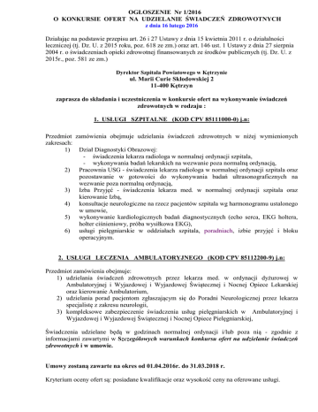 OGŁOSZENIE Nr 1/2016 O KONKURSIE OFERT NA UDZIELANIE ŚWIADCZEŃ ZDROWOTNYCH z dnia 16 lutego 2016 Działając na podstawie przepisu art. 26 i 27 Ustawy z dnia 15 kwietnia 2011 r. o działalności leczniczej (tj. Dz. U. z 2015 roku, poz. 618 ze zm.) oraz art. 146 ust. 1 Ustawy z dnia 27 sierpnia 2004 r. o świadczeniach opieki zdrowotnej finansowanych ze środków publicznych (tj. Dz. U. z 2015r., poz. 581 ze zm.) Dyrektor Szpitala Powiatowego w Kętrzynie ul. Marii Curie Skłodowskiej 2 11-400 Kętrzyn zaprasza do składania i uczestniczenia w konkursie ofert na wykonywanie świadczeń zdrowotnych w rodzaju : 1. USŁUGI SZPITALNE (KOD CPV 85111000-0) j.n: Przedmiot zamówienia obejmuje udzielania świadczeń zdrowotnych w niżej wymienionych zakresach: 1) Dział Diagnostyki Obrazowej: - świadczenia lekarza radiologa w normalnej ordynacji szpitala, - wykonywania badań lekarskich na wezwanie poza normalną ordynacją, 2) Pracownia USG - świadczenia lekarza radiologa w normalnej ordynacji szpitala oraz pozostawanie w gotowości do wykonywania badań ultrasonograficznych na wezwanie poza normalną ordynacją, 3) Izba Przyjęć - świadczenia lekarza med. w normalnej ordynacji szpitala oraz kierowanie Izbą, 4) konsultacje neurologiczne na rzecz pacjentów szpitala wg harmonogramu ustalonego w umowie, 5) wykonywanie kardiologicznych badań diagnostycznych (echo serca, EKG holtera, holter ciśnieniowy, próba wysiłkowa EKG), 6) usługi pielęgniarskie w oddziałach szpitala, poradniach, izbie przyjęć i bloku operacyjnym. 2. USŁUGI LECZENIA AMBULATORYJNEGO (KOD CPV 85112200-9) j.n: Przedmiot zamówienia obejmuje: 1) udzielania świadczeń zdrowotnych przez lekarza med. w ordynacji dyżurowej w Ambulatoryjnej i Wyjazdowej i Wyjazdowej Świątecznej i Nocnej Opiece Lekarskiej oraz kierowanie Ambulatorium, 2) udzielania porad pacjentom zgłaszającym się do Poradni Neurologicznej przez lekarza specjalistę z zakresu neurologii, 3) kompleksowe zabezpieczenie świadczenia usług pielęgniarskich w Ambulatoryjnej i Wyjazdowej i Wyjazdowej Świątecznej i Nocnej Opiece Pielęgniarskiej, Świadczenia udzielane będą w godzinach normalnej ordynacji i/lub poza nią - zgodnie z informacjami zawartymi w Szczegółowych warunkach konkursu ofert na udzielanie świadczeń zdrowotnych i w umowie. Umowy zostaną zawarte na okres od 01.04.2016r. do 31.03.2018 r. Kryterium oceny ofert są: posiadane kwalifikacje oraz wysokość ceny na oferowane usługi. Oferty w zamkniętych, nieprzezroczystych kopertach oznakowanych napisem: Szpital Powiatowy w Kętrzynie 11-400 Kętrzyn ul. M.C. Skłodowskiej 2 „Konkurs ofert” należy składać w sekretariacie Szpitala na udostępnionym w siedzibie oraz na stronie internetowej Szpitala formularzu do godz. 15:00 dnia 1 marca 2016 r. Ostatecznym terminem złożenia oferty jest wpłynięcie jej do siedziby SP w Kętrzynie najpóźniej przed wyznaczonym terminem otwarcia ofert, tj. do godz. 15:00 dnia 1 marca 2016 r.. Otwarcie ofert odbędzie się w siedzibie Szpitala Powiatowego w Kętrzynie 11-400 Kętrzyn ul. M.C. Skłodowskiej 2 w dniu 2 marca 2016 r. o godz. 11:00. Oferenci są związani ofertą do 30 dni od dnia upływu terminu składania ofert. Ogłoszenie o rozstrzygnięciu konkursu ofert zostanie umieszczone na stronie internetowej SP w Kętrzynie www.szpital-ketrzyn.pl oraz tablicy ogłoszeń Szpitala Powiatowego w Kętrzynie do dnia 11 marca 2016 roku. Udzielający zamówienie zastrzega sobie prawo do odwołania konkursu oraz przesunięcia terminu składania ofert i ich rozstrzygnięcia bez podania przyczyny. Oferent może w toku postępowania konkursowego, do czasu zakończenia postępowania złożyć do komisji konkursowej umotywowany protest w terminie 7 dni roboczych od dnia dokonania zaskarżonej czynności, który komisja rozpatrzy w ciągu 7 dni od jego otrzymania. Ze wzorem umowy można zapoznać się w Sekcji Kadr, która również udziela szczegółowych informacji o konkursie - tel. 664 357 251 - od poniedziałku do piątku w godz. w godzinach 8:00 14:30. Załączniki: 1) formularz ofertowy; 2) szczegółowe warunki konkursu ofert; ZATWIERDZIŁ: DYREKTOR SZPITALA POWIATOWEGO w Kętrzynie dr n. med. Krzysztof Tytman (-)_______________________________ (Podpis Dyrektora) Kętrzyn, dn.16 lutego 2016r.