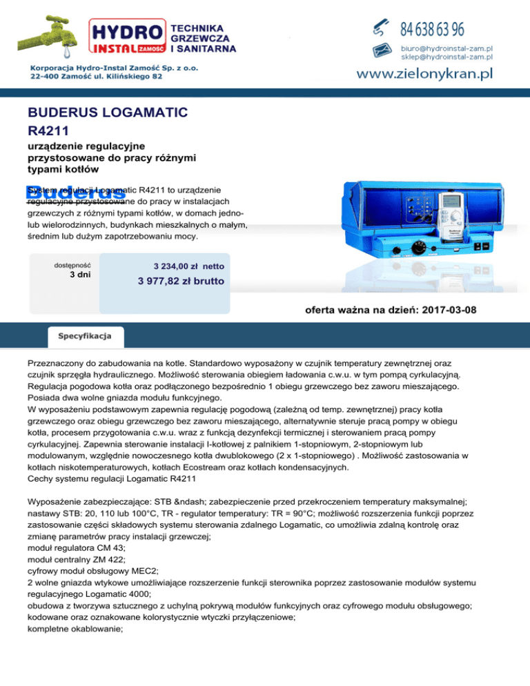 BUDERUS LOGAMATIC R4211 urządzenie regulacyjne przystosowane do pracy różnymi typami kotłów System regulacji Logamatic R4211 to urządzenie regulacyjne przystosowane do pracy w instalacjach grzewczych z różnymi typami kotłów, w domach jednolub wielorodzinnych, budynkach mieszkalnych o małym, średnim lub dużym zapotrzebowaniu mocy. dostępność 3 dni 3 234,00 zł netto 3 977,82 zł brutto oferta ważna na dzień: 2017-03-08 Przeznaczony do zabudowania na kotle. Standardowo wyposażony w czujnik temperatury zewnętrznej oraz czujnik sprzęgła hydraulicznego. Możliwość sterowania obiegiem ładowania c.w.u. w tym pompą cyrkulacyjną. Regulacja pogodowa kotła oraz podłączonego bezpośrednio 1 obiegu grzewczego bez zaworu mieszającego. Posiada dwa wolne gniazda modułu funkcyjnego. W wyposażeniu podstawowym zapewnia regulację pogodową (zależną od temp. zewnętrznej) pracy kotła grzewczego oraz obiegu grzewczego bez zaworu mieszającego, alternatywnie steruje pracą pompy w obiegu kotła, procesem przygotowania c.w.u. wraz z funkcją dezynfekcji termicznej i sterowaniem pracą pompy cyrkulacyjnej. Zapewnia sterowanie instalacji I-kotłowej z palnikiem 1-stopniowym, 2-stopniowym lub modulowanym, względnie nowoczesnego kotła dwublokowego (2 x 1-stopniowego) . Możliwość zastosowania w kotłach niskotemperaturowych, kotłach Ecostream oraz kotłach kondensacyjnych. Cechy systemu regulacji Logamatic R4211 Wyposażenie zabezpieczające: STB – zabezpieczenie przed przekroczeniem temperatury maksymalnej; nastawy STB: 20, 110 lub 100°C, TR - regulator temperatury: TR = 90°C; możliwość rozszerzenia funkcji poprzez zastosowanie części składowych systemu sterowania zdalnego Logamatic, co umożliwia zdalną kontrolę oraz zmianę parametrów pracy instalacji grzewczej; moduł regulatora CM 43; moduł centralny ZM 422; cyfrowy moduł obsługowy MEC2; 2 wolne gniazda wtykowe umożliwiające rozszerzenie funkcji sterownika poprzez zastosowanie modułów systemu regulacyjnego Logamatic 4000; obudowa z tworzywa sztucznego z uchylną pokrywą modułów funkcyjnych oraz cyfrowego modułu obsługowego; kodowane oraz oznakowane kolorystycznie wtyczki przyłączeniowe; kompletne okablowanie; stopień ochrony elektrycznej sterownika IP40; obudowa wykonana z tworzywa sztucznego, nadającego się do powtórnej przeróbki zastosowany system szybkiego montażu; w zestawie znajdują się czujniki temperatury: zewnętrznej oraz wody grzewczej w kotle. kod producenta: 30004836 montaż regulatora: zabudowa na kotle zastosowanie: instalacje grzewcze z różnymi typami kotłów czujniki: temperatury zewnętrznej oraz sprzęgła hydraulicznego gwarancja: 24 m-ce Opiekun produktu: Andrzej Iwicki [email protected] 609 700 070