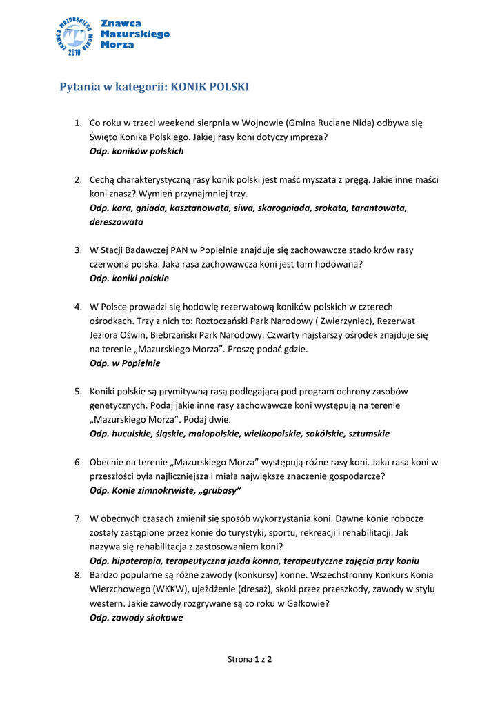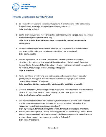 Pytania w kategorii: KONIK POLSKI 1. Co roku w trzeci weekend sierpnia w Wojnowie (Gmina Ruciane Nida) odbywa się Święto Konika Polskiego. Jakiej rasy koni dotyczy impreza? Odp. koników polskich 2. Cechą charakterystyczną rasy konik polski jest maśd myszata z pręgą. Jakie inne maści koni znasz? Wymieo przynajmniej trzy. Odp. kara, gniada, kasztanowata, siwa, skarogniada, srokata, tarantowata, dereszowata 3. W Stacji Badawczej PAN w Popielnie znajduje się zachowawcze stado krów rasy czerwona polska. Jaka rasa zachowawcza koni jest tam hodowana? Odp. koniki polskie 4. W Polsce prowadzi się hodowlę rezerwatową koników polskich w czterech ośrodkach. Trzy z nich to: Roztoczaoski Park Narodowy ( Zwierzyniec), Rezerwat Jeziora Oświn, Biebrzaoski Park Narodowy. Czwarty najstarszy ośrodek znajduje się na terenie „Mazurskiego Morza”. Proszę podad gdzie. Odp. w Popielnie 5. Koniki polskie są prymitywną rasą podlegającą pod program ochrony zasobów genetycznych. Podaj jakie inne rasy zachowawcze koni występują na terenie „Mazurskiego Morza”. Podaj dwie. Odp. huculskie, śląskie, małopolskie, wielkopolskie, sokólskie, sztumskie 6. Obecnie na terenie „Mazurskiego Morza” występują różne rasy koni. Jaka rasa koni w przeszłości była najliczniejsza i miała największe znaczenie gospodarcze? Odp. Konie zimnokrwiste, „grubasy” 7. W obecnych czasach zmienił się sposób wykorzystania koni. Dawne konie robocze zostały zastąpione przez konie do turystyki, sportu, rekreacji i rehabilitacji. Jak nazywa się rehabilitacja z zastosowaniem koni? Odp. hipoterapia, terapeutyczna jazda konna, terapeutyczne zajęcia przy koniu 8. Bardzo popularne są różne zawody (konkursy) konne. Wszechstronny Konkurs Konia Wierzchowego (WKKW), ujeżdżenie (dresaż), skoki przez przeszkody, zawody w stylu western. Jakie zawody rozgrywane są co roku w Gałkowie? Odp. zawody skokowe Strona 1 z 2 9. W wielu ośrodkach turystycznych można skorzystad z rekreacyjnej jazdy konnej. Czym się charakteryzuje jazda rekreacyjna? Odp. Współzawodnictwo nie jest najistotniejszą sprawą i nie podlega ścisłym regułom 10. Teren LGD jest w znacznej części terenem leśnym. Jakie są zasady poruszania się konno po lesie? Odp. Jazda konna na terenach leśnych jest dozwolona po drogach publicznych lub wyznaczonych szlakach. Strona 2 z 2