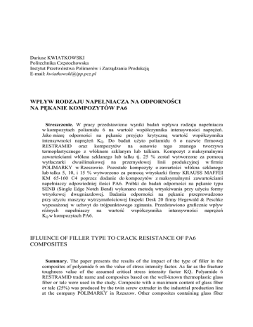 Dariusz KWIATKOWSKI Politechnika Częstochowska Instytut Przetwórstwa Polimerów i Zarządzania Produkcją E-mail: [email protected] WPŁYW RODZAJU NAPEŁNIACZA NA ODPORNOŚCI NA PĘKANIE KOMPOZYTÓW PA6 Streszczenie. W pracy przedstawiono wyniki badań wpływu rodzaju napełniacza w kompozytach poliamidu 6 na wartość współczynnika intensywności napręŜeń. Jako miarę odporności na pękanie przyjęto krytyczną wartość współczynnika intensywności napręŜeń KQ. Do badań uŜyto poliamidu 6 o nazwie firmowej RESTRAMID oraz kompozytów na osnowie tego znanego tworzywa termoplastycznego z włóknem szklanym lub talkiem. Kompozyt z maksymalnymi zawartościami włókna szklanego lub talku tj. 25 % został wytworzone za pomocą wytłaczarki dwuślimakowej na przemysłowej linii produkcyjnej w firmie POLIMARKY w Rzeszowie. Pozostałe kompozyty o zawartości włókna szklanego lub talku 5, 10, i 15 % wytworzono za pomocą wtryskarki firmy KRAUSS MAFFEI KM 65-160 C4 poprzez dodanie do kompozytów z maksymalnymi zawartościami napełniaczy odpowiedniej ilości PA6. Próbki do badań odporności na pękanie typu SENB (Single Edge Notch Bend) wykonano metodą wtryskiwania przy uŜyciu formy wtryskowej dwugniazdowej. Badania odporności na pękanie przeprowadzono przy uŜyciu maszyny wytrzymałościowej Inspekt Desk 20 firmy Hegewald & Peschke wyposaŜonej w uchwyt do trójpunktowego zginania. Przedstawiono graficznie wpływ róŜnych napełniaczy na wartość współczynnika intensywności napręŜeń KQ w kompozytach PA6. IFLUENCE OF FILLER TYPE TO CRACK RESISTANCE OF PA6 COMPOSITES Summary. The paper presents the results of the impact of the type of filler in the composites of polyamide 6 on the value of stress intensity factor. As far as the fracture toughness value of the assumed critical stress intensity factor KQ. Polyamide 6 RESTRAMID trade name and composites based on the well-known thermoplastic glass fiber or talc were used in the study. Composite with a maximum content of glass fiber or talc (25%) was produced by the twin screw extruder in the industrial production line at the company POLIMARKY in Rzeszow. Other composites containing glass fiber Wpływ rodzaju napełniacza ... 191 or talc 5, 10, and 15% were prepared by injection molding company KRAUSS MAFFEI KM 65-160 C4 by adding to the composites with the maximum yields enough PA6 fillers. Samples for testing crack resistance SENB (Single Edge Notch Bend) was performed by injection molding using a mold dual-socket. Fracture toughness tests were carried out using a testing machine Inspekt Desk 20 Hegewald & Peschke equipped to handle three - point bending. Graphically presents the impact of various fillers on the stress intensity coefficient KQ PA6 in the composites. 1. WSTĘP Wytrzymałość teoretyczna kompozytów polimerowych jest o wiele niŜsza niŜ wytrzymałość oznaczona eksperymentalnie. RóŜnica ta jest uwarunkowana obecnością w strukturze kompozytów polimerowych defektów, uwarunkowanych metodą otrzymania tego kompozytu i defektów powstających w rezultacie wytwarzania próbki do badań. W ostatnim przypadku najczęściej powstają defekty powierzchniowe. One są najbardziej niebezpieczne. Przyczyna obniŜenia wytrzymałości próbki nie polega na tym, Ŝe defekt zmniejsza jej przekrój poprzeczny rzeczywisty, a polega na tym, Ŝe w wierzchołku defektu koncentrują się dodatkowe nadmierne napręŜenia wewnętrzne. Im bardziej ostry jest wierzchołek defektu, tym większe jest napręŜenie. W ten sposób dochodzi do tworzenia się lokalnych napręŜeń, duŜo większych od średniego napręŜenia przeliczonego na całą powierzchnię przekroju badanej próbki. Początkiem zniszczenie badanej próbki jest z reguły największy defekt, który staje się początkiem lokalnego rozchodzenia się pęknięcia i rozerwania próbki, zanim jeszcze napręŜenie osiągnie wielkość wynikającą z sił spójności występujących w danym kompozycie polimerowym [1-5]. Do waŜniejszych tworzyw termoplastycznych zaliczamy poliamid 6. Jest on polimerem z grupy tworzyw konstrukcyjnych o stopniu krystaliczności wynoszącym od 30 do 50 %. Obecność fazy krystalicznej powoduje wzrost wytrzymałość na rozciąganie, wysoki moduł Younga, duŜą twardość i odporność na ścieranie. Występowanie giętkich makrocząsteczek w obszarach bezpostaciowych zapewnia poliamidom korzystną udarność, wydłuŜenie, odporność na cykle zmęczeniowe czy odp. Stosunkowo dobre właściwości mechaniczne poliamidów moŜna zwiększyć poprzez dodanie napełniaczy, jak np. włókno szklane czy talk. Kompozyty na osnowie poliamidu z włóknem szklanym cechuje bardzo wysoka sztywność, podwyŜszona odporność na pełzanie czy wysoka stabilność wymiarowa [8]. Celem niniejszych badań jest określenie wpływu rodzaju napełniacza na odporność na pękanie poliamidu 6. 192 D. Kwiatkowski Do modyfikacji fizycznej PA6 wytypowano dwa rodzaje napełniaczy: • napełniacz włóknisty w postaci włókna szklanego ciętego typu E, • napełniacz proszkowy, którego reprezentantem jest talk. Odporność na pękanie oznaczono na podstawie współczynnika intensywności napręŜeń WIN. 2. MATERIAŁY, APARATURA I METODYKA BADAŃ Badaniom poddano kompozyty na osnowie polipropylenu o nazwie handlowej RESTRAMID wyprodukowanego w firmie POLIMARKY. Poliamid 6 modyfikowano fizycznie dwoma rodzajami napełniaczy: • napełniaczem włóknistym w postaci włókna szklanego ciętego typu E ze szkła bezalkalicznego boro – glino - krzemowego o zawartości tlenków alkalicznych poniŜej 1 %. • napełniaczem proszkowym - talk. Kompozyty z maksymalnymi zawartościami napełniaczy (włókno szklane cięte lub talk) tj. 25 % zostały wytworzone za pomocą wytłaczarki dwuślimakowej na przemysłowej linii produkcyjnej w firmie POLIMARKY w Rzeszowie. Pozostałe kompozyty o zawartości włókna szklanego lub talku 5, 10 i 15 % wytworzono uŜywając wtrys
