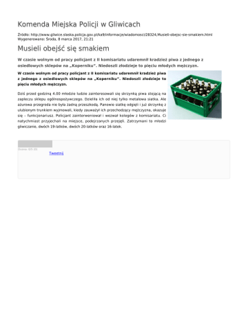 Komenda Miejska Policji w Gliwicach Źródło: http://www.gliwice.slaska.policja.gov.pl/ka9/informacje/wiadomosci/28324,Musieli-obejsc-sie-smakiem.html Wygenerowano: Środa, 8 marca 2017, 21:21 Musieli obejść się smakiem W czasie wolnym od pracy policjant z II komisariatu udaremnił kradzież piwa z jednego z osiedlowych sklepów na „Koperniku”. Niedoszli złodzieje to pięciu młodych mężczyzn. W czasie wolnym od pracy policjant z II komisariatu udaremnił kradzież piwa z jednego z osiedlowych sklepów na „Koperniku”. Niedoszli złodzieje to pięciu młodych mężczyzn. Dziś przed godziną 4.00 młodzie ludzie zainteresowali się skrzynką piwa stojącą na zapleczu sklepu ogólnospożywczego. Dzieliła ich od niej tylko metalowa siatka. Ale ażurowa przegroda nie była żadną przeszkodą. Panowie siatkę odgięli i już skrzynkę z ulubionym trunkiem wyjmowali, kiedy zauważył ich przechodzący mężczyzna, okazuje się – funkcjonariusz. Policjant zainterweniował i wezwał kolegów z komisariatu. Ci natychmiast przyjechali na miejsce, podejrzanych przejęli. Zatrzymani to młodzi gliwiczanie, dwóch 19-latków, dwóch 20-latków oraz 16-latek. Ocena: 0/5 (0) Tweetnij
