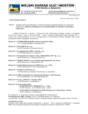\\mzuimserver3\2016\SPRAWY_2016\7040\003_Budowa ścieżki pieszo-rowerowej pomiędzy ul. Gałeczki i Castoramą\003_06_informacja o wyborze najkorzystniejszej oferty_na stronę.doc TW Chorzów, dnia 4 marca 2016r. GI/ZP/7040/003_06/061/16 Dotyczy: postępowania prowadzonego w trybie przetargu nieograniczonego na wykonanie zadania pn: „Budowa ścieżki pieszo-rowerowej pomiędzy ul. Gałeczki i Castoramą w Chorzowie”. Miejski Zarząd Ulic i Mostów w Chorzowie, jako Zamawiający działając zgodnie z wymogami art. 92 ust.2 ustawy z dnia 29 stycznia 2004r. – Prawo zamówień publicznych (tekst jednolity Dz. U. z 2015r. poz. 2164) informuje, że w w/w postępowaniu w wyznaczonym terminie składania ofert, oferty przetargowe złożyli następujący Wykonawcy: Oferta Nr 1: ENERGOBUD Spółka Jawna Gomoluch Polak 41-711 Ruda Śląska, ul. Kokotka 229 Oferta Nr 2: POL-BRUK Sp. z o.o. 42-262 Poczesna, ul. Bociania Górka 13 Oferta Nr 3: Przedsiębiorstwo DRO –SAB Sp. z o.o. 41-700 Ruda Śląska, ul. Na łąkach 8 Oferta Nr 4: Przedsiębiorstwo Budowy Dróg „DROGOPOL-ZW” Sp. z o.o. 40-301 Katowice, ul. Siemianowicka 52d Oferta Nr 5: ZRDITZ ROMUS Jerzy Musiał, Maciej Rotyński Sp. Jawna 40-389 Katowice, ul. Roździeńska 27B Oferta Nr 6: Zakład Robót Drogowych ORFIN Sp. z o.o. SP.K. 41-922 Radzionków, ul. Gen. Sikorskiego 5A Oferta Nr 7: EUROVIA POLSKA S.A. 55-040 Kobierzyce, Bielany Wrocławskie, ul. Szwedzka 5 Oferta Nr 8: PIDP Przedsiębiorstwo Inżynieryjno-Drogowe Józef Pietryga 41-922 Radzionków, ul. Zofii Nałkowskiej 28 Oferta Nr 9: P.U.H. „DOMAX” Arkadiusz Mika 42-283 Boronów, ul. Grabińska 8 Oferta Nr 10: Konsorcjum Firm: 1. ELEKTROWNIA CHORZÓW S.A. – Lider 41-503 Chorzów, ul. M. Skłodowskiej – Curie 3 2. Wojewódzkie Przedsiębiorstwo Robót Drogowych w Katowicach - Partner 40-321 Katowice, ul. Miedziana 5 Do realizacji w.w. zamówienia wybrana została oferta Nr 3 złożona przez: Przedsiębiorstwo DRO –SAB Sp. z o.o., 41-700 Ruda Śląska, ul. Na łąkach 8 za cenę brutto: 216 436,79 zł (słownie: dwieście szesnaście tysięcy czterysta trzydzieści sześć zł 79/100) Uzasadnienie wyboru: Wybrana oferta odpowiada zasadom określonym w ustawie – Prawo zamówień publicznych i wymogom SIWZ oraz otrzymała największą ilość punktów na podstawie kryteriów określonych w SIWZ. 1 2. Streszczenie oceny i porównanie złożonych ofert (nie podlegających odrzuceniu) Numer oferty Liczba pkt w kryterium Cena (waga 95% - max 95pkt) 1 2 3 4 5 6 7 8 9 10 62,12 79,92 95,00 88,07 76,61 72,20 60,97 58,55 77,57 91,86 Liczba pkt w kryterium Gwarancja Razem (waga 5% - max 5pkt) 5,00 0,00 2,78 0,00 1,67 5,00 0,00 0,00 0,00 5,00 67,12 79,92 97,78 88,07 78,28 77,20 60,97 58,55 77,57 96,86 Zamawiający: Dyrektor MZUiM ……………………….. mgr inż. Piotr Wojtala 2