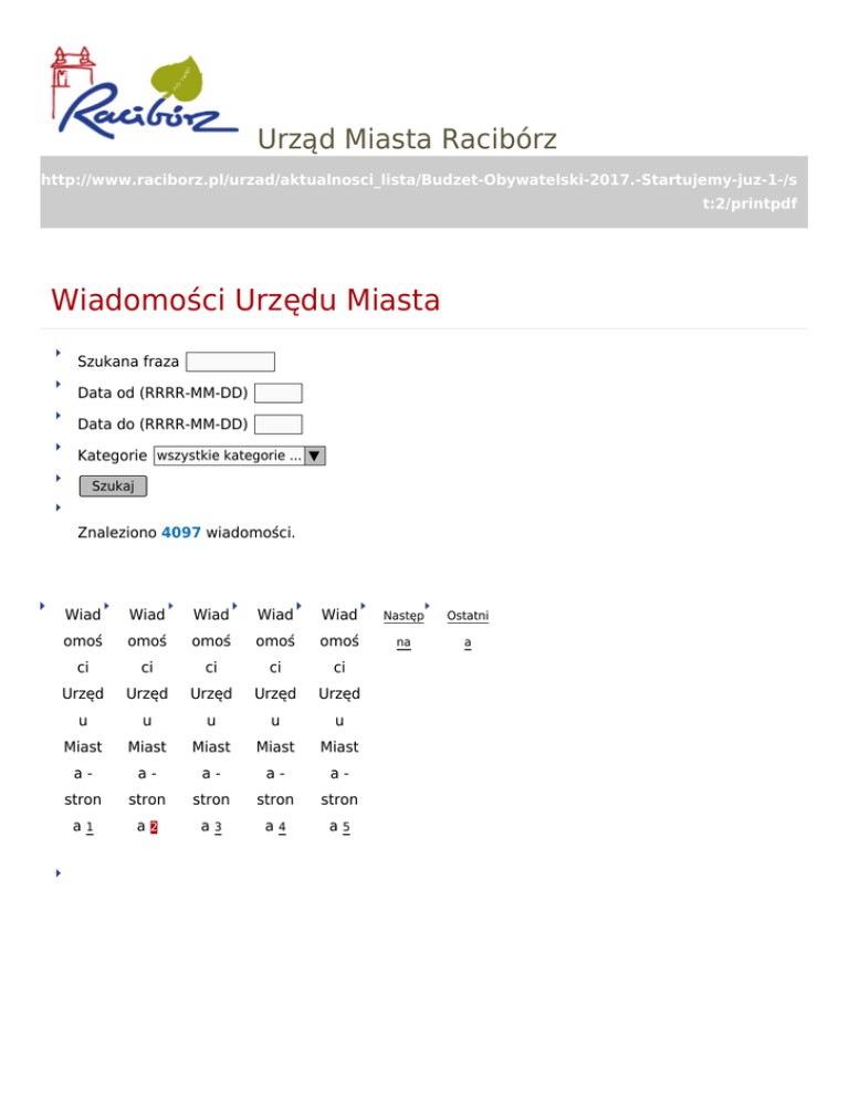 Urząd Miasta Racibórz http://www.raciborz.pl/urzad/aktualnosci_lista/Budzet-Obywatelski-2017.-Startujemy-juz-1-/s t:2/printpdf Wiadomości Urzędu Miasta Szukana fraza Data od (RRRR-MM-DD) Data do (RRRR-MM-DD) Kategorie wszystkie kategorie ... ▼ Szukaj Znaleziono 4097 wiadomości. Wiad Wiad Wiad Wiad Wiad Następ Ostatni omoś omoś omoś omoś omoś na a ci ci ci ci ci Urzęd Urzęd Urzęd Urzęd Urzęd u u u u u Miast Miast Miast Miast Miast a- a- a- a- a- stron stron stron stron stron a1 a2 a3 a4 a5 2017-03-06 Raciborska firma umacnia swoją pozycję w regionie kategoria: Wiadomości i wydarzenia Na uroczystości otwarcia centrum dystrybucji pojawili się: Prezes "Mieszka" Igor Jedliński, Prezydent Raciborza Mirosław Lenk, dyrektor generalny IDLogistics PolskaYann Belgy, wiceprezydent Gliwic Adam Neumann i wicestarosta Marek Kurpis. 2017-03-02 Powódź - to już 20 lat! Prosimy, podzielcie się swoimi zdjęciami z tamtych dni. kategoria: Wiadomości i wydarzenia Często jedno zdjęcie pozostawia po sobie nieskończenie więcej niż tysiące słów. Na fotografii jak na dłoni widać rozpacz, ulgę, smutek, radość. 2017-03-02 Marzec w Inkubatorze Przedsiębiorczości kategoria: Wiadomości i wydarzenia Korzystający z usług naszego Inkubatora będą mogli się dowiedzieć m.in. jak promować się w mediach społecznościowych. 2017-03-02 kategoria: Racibórz cyfrowo Wiadomości i wydarzenia W ramach projektu wdrożone zostaną: e-deklaracje, e-decyzje, e-podatki, e-odpady, e-zezwolenia, e-rejestry, e-rada, e-tablica oraz e-Mienie Gminy wraz z integracją e-usług z zewnętrznymi platformami informatycznymi. 2017-03-02 Nowe tytuły na Ibuk Libra w raciborskiej bibliotece. Promocja potrwa do 12 marca. kategoria: Wiadomości i wydarzenia W okresie 1-14 marca raciborscy czytelnicy, którzy korzystają z IBUK Libra, otrzymają dostęp do pełnej treści niemal 6000 książek. 2017-03-01 Spotkanie kapitanów drużyn turnieju siatkarskiego kategoria: Wiadomości i wydarzenia Organizatorami turnieju są: Ośrodek Sportu i Rekreacji, Urząd Miasta Racibórz, SGL Carbon S.A. oraz Raciborskie Centrum Kultury. 2017-03-01 Raciborzanin z Oscarem kategoria: Wiadomości i wydarzenia Piotr Szuter brał udział w produkcji Księgi Dżungli - produkcji nagrodzonej Nagrodą Akademii Filmowej. Racibórz składa gratulacje artyście. 2017-03-01 kategoria: 1 procent podatku tak mało tak wiele. Pamiętajcie, że można pomóc! Wiadomości i wydarzenia Możecie pomóc instytucji artystycznej, hospicjum, w którym znajdują się konający, stowarzyszeniom zajmującym się pomocą alkoholikom i narkomanom, schroniskom zwierząt, młodym i zdolnym uczniom z patologicznych rodzin i wielu, wielu innym. 2017-03-01 1 marca dzień żołnierzy wyklętych. kategoria: Wiadomości i wydarzenia Żołnierze Wyklęci to zbiorcza nazwa dla antykomunistycznego narodowego podziemia, które wywodziło się z takich organizacji polskiego państwa podziemnego jak Armia Krajowa, Wolność i Niezawisłość, Wolność i Sprawiedliwość, Narodowe Siły Zbrojne. 2017-02-27 Strefa ograniczonego parkowania - pamiętajmy o zasadach kategoria: Wiadomości i wydarzenia Kierowca korzystający z parkingu zobowiązany jest do umieszczenia za przednią szybą pojazdu karty parkingowej i ustawienia na jej tarczy godziny rozpoczęcia postoju, by była ona widoczna dla kontrolujących. Wiad Wiad Wiad Wiad Wiad Następ Ostatni omoś omoś omoś omoś omoś na a ci ci ci ci ci Urzęd Urzęd Urzęd Urzęd Urzęd u u u u u Miast Miast Miast Miast Miast a- a- a- a- a- stron stron stron stron stron a1 a2 a3 a4 a5