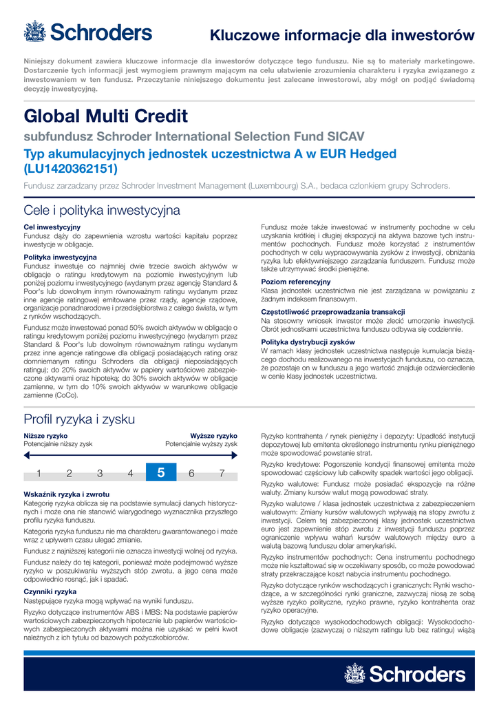 Kluczowe informacje dla inwestorów Niniejszy dokument zawiera kluczowe informacje dla inwestorów dotyczące tego funduszu. Nie są to materiały marketingowe. Dostarczenie tych informacji jest wymogiem prawnym mającym na celu ułatwienie zrozumienia charakteru i ryzyka związanego z inwestowaniem w ten fundusz. Przeczytanie niniejszego dokumentu jest zalecane inwestorowi, aby mógł on podjąć świadomą decyzję inwestycyjną. Global Multi Credit subfundusz Schroder International Selection Fund SICAV Typ akumulacyjnych jednostek uczestnictwa A w EUR Hedged (LU1420362151) Fundusz zarzadzany przez Schroder Investment Management (Luxembourg) S.A., bedaca czlonkiem grupy Schroders. Cele i polityka inwestycyjna Cel inwestycyjny Fundusz dąży do zapewnienia wzrostu wartości kapitału poprzez inwestycje w obligacje. Polityka inwestycyjna Fundusz inwestuje co najmniej dwie trzecie swoich aktywów w obligacje o ratingu kredytowym na poziomie inwestycyjnym lub poniżej poziomu inwestycyjnego (wydanym przez agencję Standard & Poor's lub dowolnym innym równoważnym ratingu wydanym przez inne agencje ratingowe) emitowane przez rządy, agencje rządowe, organizacje ponadnarodowe i przedsiębiorstwa z całego świata, w tym z rynków wschodzących. Fundusz może inwestować ponad 50% swoich aktywów w obligacje o ratingu kredytowym poniżej poziomu inwestycyjnego (wydanym przez Standard & Poor's lub dowolnym równoważnym ratingu wydanym przez inne agencje ratingowe dla obligacji posiadających rating oraz domniemanym ratingu Schroders dla obligacji nieposiadających ratingu); do 20% swoich aktywów w papiery wartościowe zabezpieczone aktywami oraz hipoteką; do 30% swoich aktywów w obligacje zamienne, w tym do 10% swoich aktywów w warunkowe obligacje zamienne (CoCo). Fundusz może także inwestować w instrumenty pochodne w celu uzyskania krótkiej i długiej ekspozycji na aktywa bazowe tych instrumentów pochodnych. Fundusz może korzystać z instrumentów pochodnych w celu wypracowywania zysków z inwestycji, obniżania ryzyka lub efektywniejszego zarządzania funduszem. Fundusz może także utrzymywać środki pieniężne. Poziom referencyjny Klasa jednostek uczestnictwa nie jest zarządzana w powiązaniu z żadnym indeksem finansowym. Częstotliwość przeprowadzania transakcji Na stosowny wniosek inwestor może zlecić umorzenie inwestycji. Obrót jednostkami uczestnictwa funduszu odbywa się codziennie. Polityka dystrybucji zysków W ramach klasy jednostek uczestnictwa następuje kumulacja bieżącego dochodu realizowanego na inwestycjach funduszu, co oznacza, że pozostaje on w funduszu a jego wartość znajduje odzwierciedlenie w cenie klasy jednostek uczestnictwa. Profil ryzyka i zysku Niższe ryzyko Potencjalnie niższy zysk 1 2 Wyższe ryzyko Potencjalnie wyższy zysk 3 4 5 6 7 Wskaźnik ryzyka i zwrotu Kategorię ryzyka oblicza się na podstawie symulacji danych historycznych i może ona nie stanowić wiarygodnego wyznacznika przyszłego profilu ryzyka funduszu. Kategoria ryzyka funduszu nie ma charakteru gwarantowanego i może wraz z upływem czasu ulegać zmianie. Fundusz z najniższej kategorii nie oznacza inwestycji wolnej od ryzyka. Fundusz należy do tej kategorii, ponieważ może podejmować wyższe ryzyko w poszukiwaniu wyższych stóp zwrotu, a jego cena może odpowiednio rosnąć, jak i spadać. Czynniki ryzyka Następujące ryzyka mogą wpływać na wyniki funduszu. Ryzyko dotyczące instrumentów ABS i MBS: Na podstawie papierów wartościowych zabezpieczonych hipotecznie lub papierów wartościowych zabezpieczonych aktywami można nie uzyskać w pełni kwot należnych z ich tytułu od bazowych pożyczkobiorców. Ryzyko kontrahenta / rynek pieniężny i depozyty: Upadłość instytucji depozytowej lub emitenta określonego instrumentu rynku pieniężnego może spowodować powstanie strat. Ryzyko kredytowe: Pogorszenie kondycji finansowej emitenta może spowodować częściowy lub całkowity spadek wartości jego obligacji. Ryzyko walutowe: Fundusz może posiadać ekspozycje na różne waluty. Zmiany kursów walut mogą powodować straty. Ryzyko walutowe / klasa jednostek uczestnictwa z zabezpieczeniem walutowym: Zmiany kursów walutowych wpływają na stopy zwrotu z inwestycji. Celem tej zabezpieczonej klasy jednostek uczestnictwa euro jest zapewnienie stóp zwrotu z inwestycji funduszu poprzez ograniczenie wpływu wahań kursów walutowych między euro a walutą bazową funduszu dolar amerykański. Ryzyko instrumentów pochodnych: Cena instrumentu pochodnego może nie kształtować się w oczekiwany sposób, co może powodować straty przekraczające koszt nabycia instrumentu pochodnego. Ryzyko dotyczące rynków wschodzących i granicznych: Rynki wschodzące, a w szczególności rynki graniczne, zazwyczaj niosą ze sobą wyższe ryzyko polityczne, ryzyko prawne, ryzyko kontrahenta oraz ryzyko operacyjne. Ryzyko dotyczące wysokodochodowych obligacji: Wysokodochodowe obligacje (zazwyczaj o niższym ratingu lub bez ratingu) wiążą Schroder International Selection Fund SICAV Global Multi Credit się zasadniczo z wyższym ryzykiem rynkowym, kredytowym oraz ryzykiem płynności. Ryzyko stopy procentowej: Wzrost stóp procentowych powoduje zazwyczaj spadek cen obligacji. Ryzyko dźwigni finansowej: Fundusz wykorzystuje instrumenty pochodne bazujące na dźwigni finansowej, co zwiększa jego podatność na określone zmiany rynkowe lub zmiany stóp procentowych i może wpływać na ponadprzeciętną zmienność oraz ryzyko zanotowania straty. Ryzyko płynności: W trudnych warunkach rynkowych fundusz może nie być w stanie dokonać sprzedaży papierów wartościowych w pełnej wartości lub wcale. Może to wpływać na wyniki funduszu i wymuszać na funduszu konieczność odroczenia lub zawieszenia operacji umarzania tytułów uczestnictwa. Ryzyko operacyjne: Awarie u dostawców usług mogą prowadzić do strat lub zakłóceń w działalności funduszu. Opłaty Opłat