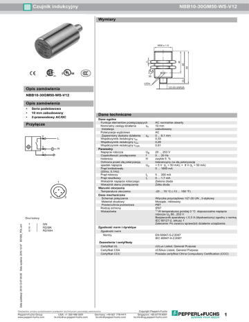 Czujnik indukcyjny NBB10-30GM50-WS-V12 Wymiary 60 5 40 50 M30 x 1.5 S 10 36 LEDs 1/2-20 UNF2A Opis zamówienia NBB10-30GM50-WS-V12 Opis zamówienia • • • Seria podstawowa 10 mm zabudowany 2-przewodowy AC/DC Przyłącze 2 L 3 N 1 1 2 3 Dane techniczne Dane ogólne Funkcja elementów przełączających Nominalny zasięg działania sn Instalacja Polaryzacja wyjżciowa Zapewniony dystans działania sa Współczynnik redukcyjny rAl Współczynnik redukcyjny rCu Współczynnik redukcyjny rV2A Parametry Napięcie robocze UB Częstotliwożć przełączania f histereza H Ochrona przed złą polaryzacją spadek napięcia Ud Prąd krótkotrwały (20ms, 0,1Hz) Prąd roboczy IL Prąd resztkowy Ir Wskażnik napięcia roboczego Wskażnik stanu przełączenia Warunki otoczenia Temperatura otoczenia Dane mechaniczne Schemat połączenia Materiał obudowy Powierzchnia pomiarowa Rodzaj ochrony Wskazówka 1 2 3 GN RD/BK RD/WH Zgodność norm i dyrektyw Zgodnożć norm Normy Zezwolenia i certyfikaty Certyfikat UL Certyfikat CSA Certyfikat CCC 20 ... 253 V 0 ... 20 Hz zwykle 5 % tolerancyjny na złą polaryzację < 5 V (IL > 50 mA); < 8 V (IL < 50 mA) 0 ... 1600 mA 5 ... 200 mA 0 ... 1,7 mA Zielona dioda Żółta dioda -25 ... 70 °C (-13 ... 158 °F) Wtyczka przyrządowa 1/2"-20 UN , 3-stykowy Mosiądz, niklowany PBT IP67 1) W temperaturze poniżej 0 °C dopuszczalne napięcie robocze Ub 80...253 V Bezpiecznik aparatowy ≤ 0,3 A (błyskawiczny) zgodny z normą IEC 60127-2, arkusz 1 Zalecenie: Po zwarciu sprawdzić działanie urządzenia. EN 60947-5-2:2007 IEC 60947-5-2:2007 cULus Listed, General Purpose cCSAus Listed, General Purpose Posiada certyfikat China Compulsory Certification (CCC) Data publikacji: 2010-12-07 09:58 Data wydania: 2010-12-07 801693_POL.xml Drut kolory AC normalnie otwarty 10 mm zabudowany AC 0 ... 8,1 mm 0,33 0,28 0,81 Niezbêdne zmiany podyktowane postêpem technicznym pozostaj¹ zastrze¿one Pepperl+Fuchs Group USA: +1 330 486 0001 Germany: +49 621 776-4411 www.pepperl-fuchs.com [email protected] [email protected] Copyright Pepperl+Fuchs Singapore: +65 6779 9091 [email protected] 1