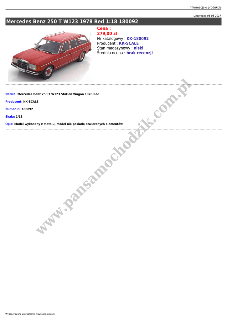 Informacje o produkcie Utworzono 08-03-2017 Mercedes Benz 250 T W123 1978 Red 1:18 180092 Cena : 279,00 zł .p l Nr katalogowy : KK-180092 Producent : KK-SCALE Stan magazynowy : niski Średnia ocena : brak recenzji Producent: KK-SCALE Numer id: 180092 Skala: 1/18 w w w .p an sa m oc ho dz ik Opis: Model wykonany z metalu, model nie posiada otwieranych elementów .c om Nazwa: Mercedes Benz 250 T W123 Station Wagon 1978 Red Wygenerowano w programie www.oscGold.com