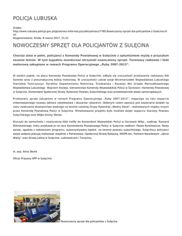 POLICJA LUBUSKA Źródło: http://www.lubuska.policja.gov.pl/go/serwis-informacyjny/aktualnosci/7760,Nowoczesny-sprzet-dla-policjantow-z-Sulecina.ht ml Wygenerowano: Środa, 8 marca 2017, 21:21 NOWOCZESNY SPRZĘT DLA POLICJANTÓW Z SULĘCINA Chociaż zima w pełni, policjanci z Komendy Powiatowej w Sulęcinie z optymizmem myślą o przyszłym sezonie letnim. W tym tygodniu mundurowi otrzymali nowoczesny sprzęt. Terenowy radiowóz i łódź motorową zakupiono w ramach Programu Operacyjnego „Ryby 2007-2013”. W ostatni piątek, na placu Komendy Powiatowej Policji w Sulęcinie, odbyła się uroczystość przekazania radiowozu KIA Sorento wraz z pneumatyczną łodzią motorową. W uroczystości udział wziął Wicemarszałek Województwa Lubuskiego Stanisław Tomczyszyn, Dyrektor Departamentu Rolnictwa, Środowiska i Rozwoju Wsi Urzędu Marszałkowskiego Województwa Lubuskiego Wojciech Kozieja, kierownictwo Komendy Wojewódzkiej Policji w Gorzowie i Komendy Powiatowej w Sulęcinie, Komendant Społecznej Straży Rybackiej Powiatu Sulęcińskiego oraz przedstawiciele władz samorządowych. Przekazany sprzęt zakupiono w ramach Programu Operacyjnego „Ryby 2007-2013”, mającego na celu wsparcie zrównoważonego rozwoju sektora rybołówstwa i obszarów rybackich. Głównym celem operacji jest wspieranie działań na rzecz zwalczania kłusownictwa wodnego na terenie Lokalnej Grupy Rybackiej „Wodny Świat”, realizowanych między innymi przez Komendę Powiatową Policji w Sulęcinie. Sfinalizowanie projektu było możliwe dzięki wsparciu Starosty Powiatu Sulęcińskiego oraz Wójta Gminy Słońsk. Kluczyki do samochodu i nowoczesna łódź trafiły do Komendant Wojewódzki Policji w Gorzowie Wlkp., nadinsp. Ryszard Wiśniewskiego, który przekazał je na ręce Komendanta Powiatowego Policji w Sulęcinie nadkom. Pawła Rynkiewicza. Nowy sprzęt, zgodnie z założeniami programu, wykorzystywany będzie na terenie powiatu sulęcińskiego. Sulęcińscy policjanci swoje zadania planują realizować wspólnie z Państwową i Społeczną Strażą Rybacką, WOPR-em, Parkiem Narodowym „Ujście Warty” oraz Strażą Leśną w Sulęcinie, Lubniewicach i Torzymiu. st. asp. Alina Słonik Oficer Prasowy KPP w Sulęcinie Nowoczesny sprzęt dla policjantów z Sulęcina Nowoczesny sprzęt dla policjantów z Sulęcina Nowoczesny sprzęt dla policjantów z Sulęcina Nowoczesny sprzęt dla policjantów z Sulęcina Nowoczesny sprzęt dla policjantów z Sulęcina Nowoczesny sprzęt dla policjantów z Sulęcina Nowoczesny sprzęt dla policjantów z Sulęcina Nowoczesny sprzęt dla policjantów z Sulęcina Nowoczesny sprzęt dla policjantów z Sulęcina Nowoczesny sprzęt dla policjantów z Sulęcina Nowoczesny sprzęt dla policjantów z Sulęcina Nowoczesny sprzęt dla policjantów z Sulęcina Nowoczesny sprzęt dla policjantów z Sulęcina Nowoczesny sprzęt dla policjantów z Sulęcina Nowoczesny sprzęt dla policjantów z Sulęcina Nowoczesny sprzęt dla policjantów z Sulęcina Nowoczesny sprzęt dla policjantów z Sulęcina Nowoczesny sprzęt dla policjantów z Sulęcina Nowoczesny sprzęt dla policjantów z Sulęcina Nowoczesny sprzęt dla policjantów z Sulęcina Nowoczesny sprzęt dla policjantów z Sulęcina Ocena: 0/5 (0) Tweetnij