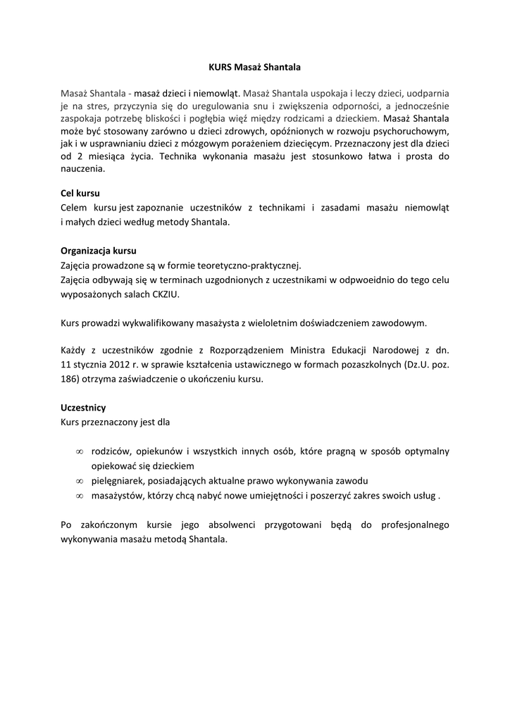 KURS Masaż Shantala Masaż Shantala - masaż dzieci i niemowląt. Masaż Shantala uspokaja i leczy dzieci, uodparnia je na stres, przyczynia się do uregulowania snu i zwiększenia odporności, a jednocześnie zaspokaja potrzebę bliskości i pogłębia więź między rodzicami a dzieckiem. Masaż Shantala może być stosowany zarówno u dzieci zdrowych, opóźnionych w rozwoju psychoruchowym, jak i w usprawnianiu dzieci z mózgowym porażeniem dziecięcym. Przeznaczony jest dla dzieci od 2 miesiąca życia. Technika wykonania masażu jest stosunkowo łatwa i prosta do nauczenia. Cel kursu Celem kursu jest zapoznanie uczestników z technikami i zasadami masażu niemowląt i małych dzieci według metody Shantala. Organizacja kursu Zajęcia prowadzone są w formie teoretyczno-praktycznej. Zajęcia odbywają się w terminach uzgodnionych z uczestnikami w odpwoeidnio do tego celu wyposażonych salach CKZIU. Kurs prowadzi wykwalifikowany masażysta z wieloletnim doświadczeniem zawodowym. Każdy z uczestników zgodnie z Rozporządzeniem Ministra Edukacji Narodowej z dn. 11 stycznia 2012 r. w sprawie kształcenia ustawicznego w formach pozaszkolnych (Dz.U. poz. 186) otrzyma zaświadczenie o ukończeniu kursu. Uczestnicy Kurs przeznaczony jest dla • • • rodziców, opiekunów i wszystkich innych osób, które pragną w sposób optymalny opiekować się dzieckiem pielęgniarek, posiadających aktualne prawo wykonywania zawodu masażystów, którzy chcą nabyć nowe umiejętności i poszerzyć zakres swoich usług . Po zakończonym kursie jego absolwenci przygotowani będą do profesjonalnego wykonywania masażu metodą Shantala.