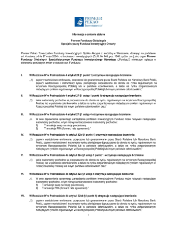 Informacja o zmianie statutu Pioneer Funduszy Globalnych Specjalistyczny Fundusz Inwestycyjny Otwarty Pioneer Pekao Towarzystwo Funduszy Inwestycyjnych Spółka Akcyjna z siedzibą w Warszawie, działając na podstawie art. 4 ustawy z dnia 27 maja 2004 r. o funduszach inwestycyjnych (Dz.U. Nr 146, poz. 1546 z późn. zm.) jako organ Pioneer Funduszy Globalnych Specjalistycznego Funduszu Inwestycyjnego Otwartego („Fundusz”) niniejszym ogłasza o dokonaniu poniższych zmian w statucie ww. Funduszu: I. W Rozdziale IV w Podrozdziale 4 artykuł 24 §1 punkt 1) otrzymuje następujące brzmienie: ,,1) papiery wartościowe emitowane, poręczone lub gwarantowane przez Skarb Państwa lub Narodowy Bank Polski, papiery wartościowe i instrumenty rynku pieniężnego dopuszczone do obrotu na rynku regulowanym na terytorium Rzeczypospolitej Polskiej lub w państwie członkowskim, a także na rynku zorganizowanym niebędącym rynkiem regulowanym w Rzeczypospolitej Polskiej lub innym państwie członkowskim;” II. W Rozdziale IV w Podrozdziale 4 artykuł 27 §1 ustęp 1 punkt 1) otrzymuje następujące brzmienie: „1) III. W Rozdziale IV w Podrozdziale 4 artykuł 27 §1 ustęp 4 otrzymuje następujące brzmienie: „4. IV. takie instrumenty pochodne są dopuszczone do obrotu na rynku regulowanym na terytorium Rzeczypospolitej Polskiej lub w państwie członkowskim, a także na rynku zorganizowanym niebędącym rynkiem regulowanym w Rzeczypospolitej Polskiej lub innym państwie członkowskim oraz” W Rozdziale IV w Podrozdziale 4a artykuł 32e §1 ustęp 4 otrzymuje następujące brzmienie: „4. VII. papiery wartościowe emitowane, poręczone lub gwarantowane przez Skarb Państwa lub Narodowy Bank Polski, papiery wartościowe i instrumenty rynku pieniężnego dopuszczone do obrotu na rynku regulowanym na terytorium Rzeczypospolitej Polskiej lub w państwie członkowskim, a także na rynku zorganizowanym niebędącym rynkiem regulowanym w Rzeczypospolitej Polskiej lub innym państwie członkowskim;” W Rozdziale IV w Podrozdziale 4a artykuł 32e §1 ustęp 1 punkt 1) otrzymuje następujące brzmienie: „1) VI. W celu zapewnienia sprawnego zarządzania portfelem inwestycyjnym Fundusz może nabywać następujące instrumenty pochodne, w tym niewystandaryzowane instrumenty pochodne: 1) Transakcje swap na stopę procentową. 2) Transakcje FRA (forward rate agreement).” W Rozdziale IV w Podrozdziale 4a artykuł 32b §1 punkt 1) otrzymuje następujące brzmienie: „1) V. takie instrumenty pochodne są dopuszczone do obrotu na rynku regulowanym na terytorium Rzeczypospolitej Polskiej lub w państwie członkowskim, a także na rynku zorganizowanym niebędącym rynkiem regulowanym w Rzeczypospolitej Polskiej lub innym państwie członkowskim oraz” W celu zapewnienia sprawnego zarządzania portfelem inwestycyjnym Fundusz może nabywać następujące instrumenty pochodne, w tym niewystandaryzowane instrumenty pochodne: 1) Transakcje swap na stopę procentową. 2) Transakcje FRA (forward rate agreement).” W Rozdziale IV w Podrozdziale 4b artykuł 32bb §1 punkt 1) otrzymuje następujące brzmienie: „1) papiery wartościowe emitowane, poręczone lub gwarantowane przez Skarb Państwa lub Narodowy Bank Polski, papiery wartościowe i instrumenty rynku pieniężnego dopuszczone do obrotu na rynku regulowanym na terytorium Rzeczypospolitej Polskiej lub w państwie członkowskim, a także na rynku zorganizowanym niebędącym rynkiem regulowanym w Rzeczypospolitej Polskiej lub innym państwie członkowskim,” 1 VIII. W Rozdziale IV w Podrozdziale 4b artykuł 32ee §1 ustęp 1 punkt 1) otrzymuje następujące brzmienie: „1) IX. W Rozdziale IV w Podrozdziale 4b artykuł 32ee §1 ustęp 4 otrzymuje następujące brzmienie: „4. X. papiery wartościowe emitowane, poręczone lub gwarantowane przez Skarb Państwa lub Narodowy Bank Polski, papiery wartościowe i instrumenty rynku pieniężnego dopuszczone do obrotu na rynku regulowanym na terytorium Rzeczypospolitej Polskiej lub w państwie członkowskim, a także na rynku zorganizowanym niebędącym rynkiem regulowanym w Rzeczypospolitej Polskiej lub innym państwie członkowskim,” W Rozdziale IV w Podrozdziale 4c artykuł 32eee §1 ustęp 1 punkt 1) otrzymuje następujące brzmienie: „1) XII. W celu zapewnienia sprawnego zarządzania portfelem inwestycyjnym Fundusz może nabywać następujące instrumenty pochodne, w tym niewystandaryzowane instrumenty pochodne: 1) Transakcje swap na stopę procentową. 2) Transakcje FRA (forward rate agreement).” W Rozdziale IV w Podrozdziale 4c artykuł 32bbb §1 punkt 1) otrzymuje następujące brzmienie: „1) XI. takie instrumenty pochodne są dopuszczone do obrotu na rynku regulowanym na terytorium Rzeczypospolitej Polskiej lub w państwie członkowskim, a także na rynku zorganizowanym niebędącym rynkiem regulowanym w Rzeczypospolitej Polskiej lub innym państwie członkowskim oraz” takie instrumenty pochodne są dopuszczone do obrotu na rynku regulowanym na terytorium Rzeczypospolitej Polskiej lub w państwie członkowskim, a także na rynku zorganizowanym niebędącym rynkiem regulowanym w Rzeczypospolitej Polskiej lub innym państwie członkowskim oraz” W Rozdziale IV w Podrozdziale 4c artykuł 32eee §1 ustęp 4 otrzymuje następujące brzmienie: „4. W celu zapewnienia sprawnego zarządzania portfelem inwestycyjnym Fundusz może nabywać następujące instrumenty pochodne, w tym niewystandaryzowane instrumenty pochodne: 1) Transakcje swap na stopę procentową. 2) Transakcje FRA (forward rate agreement).” XIII. W Rozdziale IV w Podrozdziale 4d artykuł 32lll §1 punkt 1) otrzymuje następujące brzmienie: „1) papiery wartościowe emitowane, poręczone lub gwarantowane przez Skarb Państwa lub Narodowy Bank Polski, papiery wartościowe i instrumenty rynku pieniężnego dopuszczone do obrotu na rynku regulowanym na terytorium Rzeczypospolitej Polskiej lub w państwie członkowskim, a także na rynk