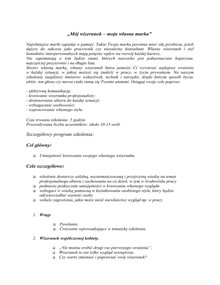 „Mój wizerunek – moja własna marka” Najsilniejsze marki zapadaj w pamięć. Także Twoja marka powinna mieć siłę przebicia, jeżeli dążysz do sukcesu jako pracownik czy niezależny konsultant. Własny wizerunek i styl kontaktów interpersonalnych mają potężny wpływ na rozwój każdej kariery. Nie zapominają o tym ludzie znani, których nazwisko jest jednoznacznie kojarzone, najczęściej pozytywnie i na długie lata. Stwórz własną markę, własny wizerunek która pomoże Ci wywierać najlepsze wrażenie w każdej sytuacji, w jakiej możesz się znaleźć w pracy, w życiu prywatnym. Na naszym szkoleniu znajdziesz mnóstwo wskazówek, technik i narzędzi, dzięki którym sposób bycia, ubiór, ton głosu czy mowa ciała staną się Twoimi atutami. Osiągaj swoje cele poprzez: - efektywną komunikację; - kreowanie wizerunku profesjonalisty; - dostosowanie ubioru do każdej sytuacji; - wzbogacanie osobowości; - wypracowanie własnego stylu. Czas trwania szkolenia: 5 godzin Przewidywana liczba uczestników: około 10-15 osób Szczegółowy program szkolenia: Cel główny: Umiejętność kreowania swojego własnego wizerunku. Cele szczegółowe: szkolenie dostarczy solidną, usystematyzowaną i przejrzystą wiedzę na temat profesjonalnego ubioru i zachowania na co dzień, w tym w środowisku pracy podniesie praktycznie umiejętności w kreowaniu własnego wyglądu wzbogaci w wiedzę pomocną w kształtowaniu osobistego stylu, który będzie odzwierciedlać wartość osoby wskaże zagrożenia, jakie może nieść niewłaściwy wygląd np. w pracy 1. Wstęp Powitanie, Ćwiczenie wprowadzające w tematykę szkolenia. 2. Wizerunek współczesnej kobiety. „Nie można zrobić drugi raz pierwszego wrażenia”, Wizerunek to nie tylko wygląd zewnętrzny, Czy warto zmieniać i poprawiać swój wizerunek? 3. Znaczenie wyglądu i etykiety. W życiu prywatnym, W życiu zawodowym, „Jak Cię widzą, tak…” 4. Kreowanie wizerunku w życiu zawodowym. Wygląd, czyli służbowy Dress Code, Biznesowy savoir vivre, Opinia 5. Autoprezentacja, wystąpienia publiczne, mowa ciała jako niezbędny element wizerunku. Sposób mówienia, sposób pisania, sposób słuchania, sposób myślenia, sposób prezentacji, Sposób bycia, sylwetka, gesty, przestrzeń, ułożenie ciała 6. Postawa i zachowanie. charyzma, zaufanie, pewność siebie, szacunek dla siebie 7. Zasady ubierania się w poszczególnych przypadkach, makijaż, fryzura – warsztat i konsultacje indywidualne ze specjalistami. 8. Podsumowanie – uczestnicy określają, które z umiejętności zdobytych na szkoleniu wprowadzą w życie od razu, a które będą wymagały jeszcze doszlifowania Szkolenie przeprowadzone jest metodą warsztatową z elementami prezentacji multimedialnej i przeplatane ćwiczeniami indywidualnymi, w grupach i w parach oraz możliwością skorzystania z porad ekspertów w dziedzinie wizażu, fryzjerstwa. Szkolenie przeprowadzi według autorskiego programu Piotr Hływka – coach, trener rozwoju osobistego.