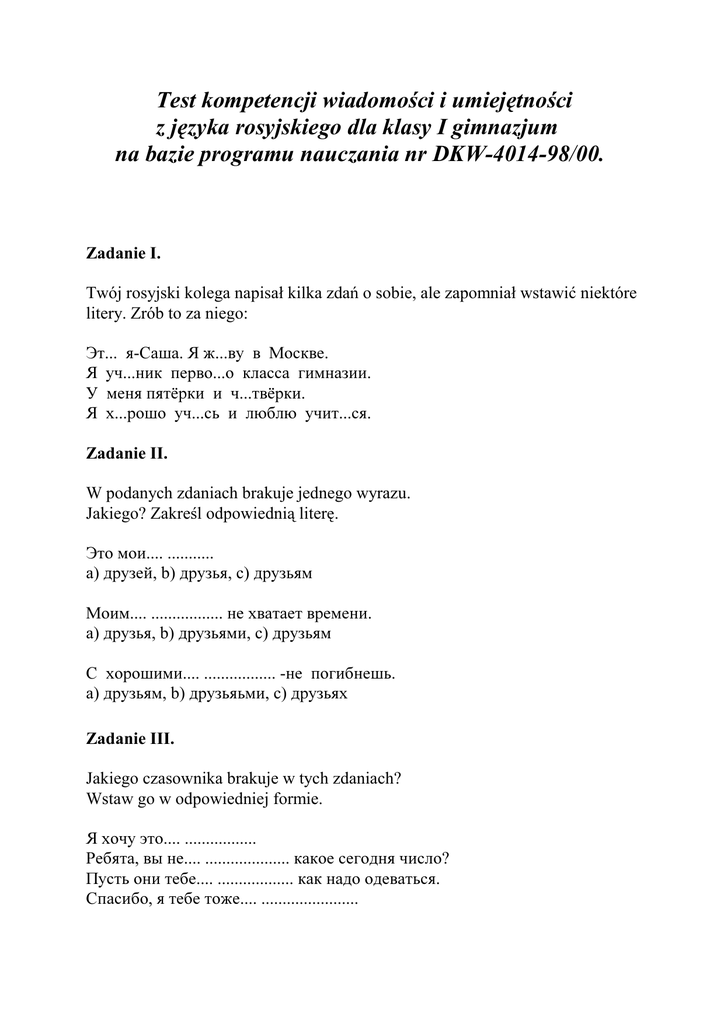 Test kompetencji wiadomości i umiejętności z języka rosyjskiego dla klasy I gimnazjum na bazie programu nauczania nr DKW-4014-98/00. Zadanie I. Twój rosyjski kolega napisał kilka zdań o sobie, ale zapomniał wstawić niektóre litery. Zrób to za niego: Эт... я-Саша. Я ж...ву в Москве. Я уч...ник перво...о класса гимназии. У меня пятёрки и ч...твёрки. Я х...рошо уч...сь и люблю учит...ся. Zadanie II. W podanych zdaniach brakuje jednego wyrazu. Jakiego? Zakreśl odpowiednią literę. Это мои.... ........... a) друзей, b) друзья, c) друзьям Моим.... ................. не хватает времени. a) друзья, b) друзьями, c) друзьям С хорошими.... ................. -не погибнешь. a) друзьям, b) друзьяьми, c) друзьях Zadanie III. Jakiego czasownika brakuje w tych zdaniach? Wstaw go w odpowiedniej formie. Я хочу это.... ................. Ребята, вы не.... .................... какое сегодня число? Пусть они тебе.... .................. как надо одеваться. Спасибо, я тебе тоже.... ....................... Zadanie IV. Wyobraź sobie, że jesteś w Rosji. Poczułeś się źle i udałeś się do lekarza. Jak wyglądałby dialog między Tobą a lekarzem? Zapisz go: - Доброе утро. -............................................... -............................................... -............................................... -............................................... -............................................... Zadanie V. Jak to powiesz po rosyjsku? Zapisz. Która teraz godzina? ................................................ Za pięć dwunasta. ................................................ Jest wpół do drugiej. ................................................ Jest za 15 pierwsza. ................................................ Zadanie VI. Podane zdania napisz po rosyjsku. Lena jest podobna do siostry. ................................................. Paweł jest podobny do ojca. ................................................. Zadanie VII. Następujące przymiotniki zapisz w stopniu wyższym. сильный-.... ................... умный-.... .................... красный-.... ................. весёлый-.... .................. молодой-.... ................. низкий-.... .................... Zadanie VIII. Jakie padły pytania? Napisz je po rosyjsku. -......................................................................... -Вокзал? Вот напротив. Это большое здание? -......................................................................... -Касса? Вот она. -........................................................................ - Поезд в Петербург. Нет не знаю. Zadanie IX. Podane liczebniki napisz słownie: 999-............................................................ 222-............................................................ 524-............................................................ 765-............................................................ Punktacja Zadanie I- 4p. Zadanie II- 3p. Zadanie III- 4p. Zadanie IV- 10p. Zadanie V- 8p. Zadanie VI- 6p. Zadanie VII- 6p. Zadanie VIII-6p. Zadanie IX- 8p. Opracowała: Dzięgelewska Bogumiła