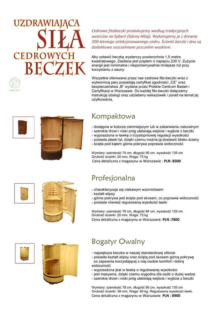 Cedrowe fitobeczki produkujemy według tradycyjnych wzorców na Syberii (Górny Ałtaj). Wykonujemy je z drewna 300-letniego selekcjonowanego cedru. Ścianki beczki i dno są dodatkowo uszczelniane pszczelim woskiem. Aby ustawić beczkę wystarczy powierzchnia 1,5 metra kwadratowego. Zasilana jest prądem o napięciu 230 V. Zużycie energii jest minimalne i nieporównywalnie mniejsze niż przy korzystaniu z sauny. Wszystkie oferowane przez nas cedrowe fito-beczki wraz z wytwornicą pary posiadają certyfikat zgodności „CE” oraz bezpieczeństwa „B” wydane przez Polskie Centrum Badań i Certyfikacji w Warszawie Do każdej fito-beczki dołączamy instrukcję obsługi oraz udzielamy wskazówek i porad na temat jej użytkowania. Kompaktowa - dostępna w kolorze ciemniejszym lub w zabarwieniu naturalnym - szerokie drzwi i niski próg ułatwiają wejście i wyjście z beczki - wyposażona w ławkę o trzystopniowej regulacji wysokości - posiada płaski tył, dzięki czemu można ją dostawić blisko ściany - ścięta pod kątem górna pokrywa poprawia widoczność Wymiary: szerokość 74 cm, długość 90 cm, wysokość 135 cm Grubość ścianki: 20 mm, Waga: 75 kg Cena detaliczna z magazynu w Warszawie : PLN :8300 Profesjonalna - charakteryzuje się ciekawym wzornictwem - kształt elipsy - górna pokrywa jest ścięta pod skosem, co poprawia widoczność - posiada również regulowaną wysokość ławki Wymiary: szerokość 76 cm, długość 84 cm, wysokość 135 cm Grubość ścianki: 20 mm, Waga: 75 kg Cena detaliczna z magazynu w Warszawie: PLN :7800 Bogatyr Owalny - największa beczka w naszej standardowej ofercie - posiada kształt elipsy oraz ściętą pod skosem górną pokrywę co zapewnia korzystającej z niej osobie komfort i dobrą widoczność - wyposażona jest w ławkę o regulowanej wysokości - jest masywna, dzięki czemu wygodna dla osób o dużej wadze - szerokie drzwi i niski próg ułatwiają wejście i wyjście z beczki Wymiary: szerokość 78 cm, długość 90 cm, wysokość 135 cm Grubość ścianki: 38 mm, Waga: 80 kg, Regulowana wysokość ławki. Cena detaliczna z magazynu w Warszawie PLN : 8900 Horyzontalna - doskonała dla osób, które szczególnie cenią sobie wygodę - imponująca w formie - wymaga trochę więcej miejsca Wymiary: szerokość 71 cm, długość 180 cm, wysokość 80 cm Grubość ścianki: 20 mm, Waga: 90 kg sprowadzana na indywidualne zamówienie Kwadratowa - posiada ścięty tył, co pozwala ustawić ją blisko ściany. - jest bardzo obszerna Wymiary: szerokość 84 cm, długość 84 cm, wysokość 130 cm Grubość ścianki: 38 mm, Waga: 75 kg sprowadzana na indywidualne zamówienie Beczka Kwadratowa i Horyzontalna tylko na zamówienie - czas oczekiwania ok. 2 miesiące. Poduszka cedrowa - łagodzi napięcie nerwowe - pomaga w uzyskaniu głębokiego relaksu - pomaga uzyskać głęboki, zdrowy sen i odpoczynek - pomaga w łagodzeniu stresu - daje uczucie świeżości po przebudzeniu - zmniejsza bóle obszarów głowy i szyi - posiada właściwości antyseptyczne - jest wyjątkowo miękka wymiary: 35 cm x 50 cm, materiał: len, wypełnienie: wiórki cedrowe Cena detaliczna z magazynu w Warszawie PLN : 50 MOŻLIWOŚĆ SPRZEDAŻY NA RATY - UMOWA Z FIRMĄ ŻAGIEL. Dostawa do uzgodnienia, ewentualnie odbiór osobisty z naszego punktu w Warszawie. Gwarancja na termoregulator i beczki 12 miesięcy. Wytwornica pary w komplecie z beczką. Szczegóły i warunki w instrukcjach obsługi. OKPOL Konto: Deutche Bank PBC S.A. 64 1910 1048 2201 9971 0493 0001 REGON 141097480; KRS 0000286906; VAT No.PL 5213455313 Kontakt: [email protected] Telefon: +48 600 355 959 WWW.cedrowefitobeczki.eu