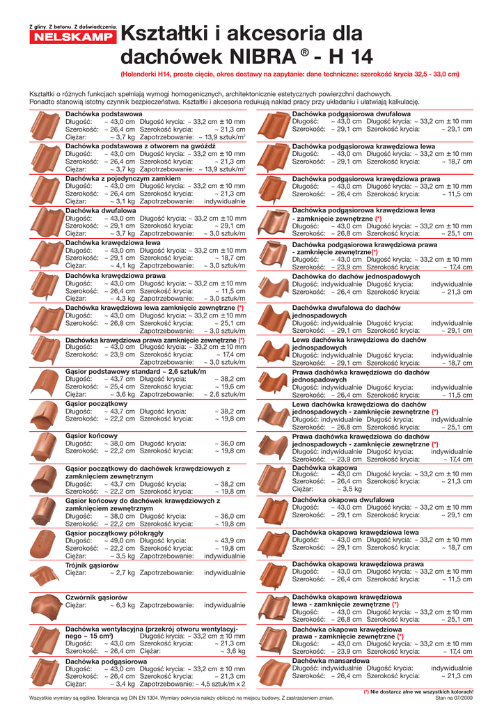 Kształtki i akcesoria dla dachówek NIBRA®- H 14 (Holenderki H14, proste cięcie, okres dostawy na zapytanie: dane techniczne: szerokość krycia 32,5 - 33,0 cm) Kształtki o różnych funkcjach spełniają wymogi homogenicznych, architektonicznie estetycznych powierzchni dachowych. Ponadto stanowią istotny czynnik bezpieczeństwa. Kształtki i akcesoria redukują nakład pracy przy układaniu i ułatwiają kalkulację. Dachówka podstawowa Długość: ~ 43,0 cm Długość krycia: ~ 33,2 cm ± 10 mm Szerokość: ~ 26,4 cm Szerokość krycia: ~ 21,3 cm Ciężar: ~ 3,7 kg Zapotrzebowanie: ~ 13,9 sztuk/m2 Dachówka podstawowa z otworem na gwóźdź Długość: ~ 43,0 cm Długość krycia: ~ 33,2 cm ± 10 mm Szerokość: ~ 26,4 cm Szerokość krycia: ~ 21,3 cm Ciężar: ~ 3,7 kg Zapotrzebowanie: ~ 13,9 sztuk/m2 Dachówka z pojedynczym zamkiem Długość: ~ 43,0 cm Długość krycia: ~ 33,2 cm ± 10 mm Szerokość: ~ 26,4 cm Szerokość krycia: ~ 21,3 cm Ciężar: ~ 3,1 kg Zapotrzebowanie: indywidualnie Dachówka dwufalowa Długość: ~ 43,0 cm Długość krycia: ~ 33,2 cm ± 10 mm Szerokość: ~ 29,1 cm Szerokość krycia: ~ 29,1 cm Ciężar: ~ 3,7 kg Zapotrzebowanie: ~ 3,0 sztuk/m Dachówka krawędziowa lewa Długość: ~ 43,0 cm Długość krycia: ~ 33,2 cm ± 10 mm Szerokość: ~ 29,1 cm Szerokość krycia: ~ 18,7 cm Ciężar: ~ 4,1 kg Zapotrzebowanie: ~ 3,0 sztuk/m Dachówka krawędziowa prawa Długość: ~ 43,0 cm Długość krycia: ~ 33,2 cm ± 10 mm Szerokość: ~ 26,4 cm Szerokość krycia: ~ 11,5 cm Ciężar: ~ 4,3 kg Zapotrzebowanie: ~ 3,0 sztuk/m Dachówka krawędziowa lewa zamknięcie zewnętrzne (*) Długość: ~ 43,0 cm Długość krycia: ~ 33,2 cm ± 10 mm Szerokość: ~ 26,8 cm Szerokość krycia: ~ 25,1 cm Zapotrzebowanie: ~ 3,0 sztuk/m Dachówka krawędziowa prawa zamknięcie zewnętrzne (*) Długość: ~ 43,0 cm Długość krycia: ~ 33,2 cm ± 10 mm Szerokość: ~ 23,9 cm Szerokość krycia: ~ 17,4 cm Zapotrzebowanie: ~ 3,0 sztuk/m Gąsior podstawowy standard ~ 2,6 sztuk/m Długość: ~ 43,7 cm Długość krycia: ~ 38,2 cm Szerokość: ~ 25,4 cm Szerokość krycia: ~ 19,6 cm Ciężar: ~ 3,6 kg Zapotrzebowanie: ~ 2,6 sztuk/m Gąsior początkowy Długość: ~ 43,7 cm Długość krycia: ~ 38,2 cm Szerokość: ~ 22,2 cm Szerokość krycia: ~ 19,8 cm Gąsior końcowy Długość: ~ 38,0 cm Długość krycia: Szerokość: ~ 22,2 cm Szerokość krycia: ~ 36,0 cm ~ 19,8 cm Gąsior początkowy do dachówek krawędziowych z zamknięciem zewnętrznym Długość: ~ 43,7 cm Długość krycia: ~ 38,2 cm Szerokość: ~ 22,2 cm Szerokość krycia: ~ 19,8 cm Gąsior końcowy do dachówek krawędziowych z zamknięciem zewnętrznym Długość: ~ 38,0 cm Długość krycia: ~ 36,0 cm Szerokość: ~ 22,2 cm Szerokość krycia: ~ 19,8 cm Gąsior początkowy półokrągły Długość: ~ 49,0 cm Długość krycia: ~ 43,9 cm Szerokość: ~ 22,2 cm Szerokość krycia: ~ 19,8 cm Ciężar: ~ 3,5 kg Zapotrzebowanie: indywidualnie Trójnik gąsiorów Ciężar: ~ 2,7 kg Zapotrzebowanie: indywidualnie Czwórnik gąsiorów Ciężar: ~ 6,3 kg Zapotrzebowanie: indywidualnie Dachówka wentylacyjna (przekrój otworu wentylacyjDługość krycia: ~ 33,2 cm ± 10 mm nego ~ 15 cm2) Długość: ~ 43,0 cm Szerokość krycia: ~ 21,3 cm Szerokość: ~ 26,4 cm Ciężar: ~ 3,6 kg Dachówka podgąsiorowa Długość: ~ 43,0 cm Długość krycia: ~ 33,2 cm ± 10 mm Szerokość: ~ 26,4 cm Szerokość krycia: ~ 21,3 cm Ciężar: ~ 3,4 kg Zapotrzebowanie: ~ 4,5 sztuk/m x 2 Dachówka podgąsiorowa dwufalowa Długość: ~ 43,0 cm Długość krycia: ~ 33,2 cm ± 10 mm Szerokość: ~ 29,1 cm Szerokość krycia: ~ 29,1 cm Dachówka podgąsiorowa krawędziowa lewa Długość: ~ 43,0 cm Długość krycia: ~ 33,2 cm ± 10 mm Szerokość: ~ 29,1 cm Szerokość krycia: ~ 18,7 cm Dachówka podgąsiorowa krawędziowa prawa Długość: ~ 43,0 cm Długość krycia: ~ 33,2 cm ± 10 mm Szerokość: ~ 26,4 cm Szerokość krycia: ~ 11,5 cm Dachówka podgąsiorowa krawędziowa lewa - zamknięcie zewnętrzne (*) Długość: ~ 43,0 cm Długość krycia: ~ 33,2 cm ± 10 mm Szerokość: ~ 26,8 cm Szerokość krycia: ~ 25,1 cm Dachówka podgąsiorowa krawędziowa prawa - zamknięcie zewnętrzne(*) Długość: ~ 43,0 cm Długość krycia: ~ 33,2 cm ± 10 mm Szerokość: ~ 23,9 cm Szerokość krycia: ~ 17,4 cm Dachówka do dachów jednospadowych Długość: indywidualnie Długość krycia: indywidualnie Szerokość: ~ 26,4 cm Szerokość krycia: ~ 21,3 cm Dachówka dwufalowa do dachów jednospadowych Długość: indywidualnie Długość krycia: indywidualnie Szerokość: ~ 29,1 cm Szerokość krycia: ~ 29,1 cm Lewa dachówka krawędziowa do dachów jednospadowych Długość: indywidualnie Długość krycia: indywidualnie Szerokość: ~ 29,1 cm Szerokość krycia: ~ 18,7 cm Prawa dachówka krawędziowa do dachów jednospadowych Długość: indywidualnie Długość krycia: indywidualnie Szerokość: ~ 26,4 cm Szerokość krycia: ~ 11,5 cm Lewa dachówka krawędziowa do dachów jednospadowych - zamknięcie zewnętrzne (*) Długość: indywidualnie Długość krycia: indywidualnie Szerokość: ~ 26,8 cm Szerokość krycia: ~ 25,1 cm Prawa dachówka krawędziowa do dachów jednospadowych - zamknięcie zewnętrzne (*) Długość: indywidualnie Długość krycia: indywidualnie Szerokość: ~ 23,9 cm Szerokość krycia: ~ 17,4 cm Dachówka okapowa Długość: ~ 43,0 cm Długość krycia: ~ 33,2 cm ± 10 mm Szerokość: ~ 26,4 cm Szerokość krycia: ~ 21,3 cm Ciężar: ~ 3,5 kg Dachówka okapowa dwufalowa Długość: ~ 43,0 cm Długość krycia: ~ 33,2 cm ± 10 mm Szerokość: ~ 29,1 cm Szerokość krycia: ~ 29,1 cm Dachówka okapowa krawędziowa lewa Długość: ~ 43,0 cm Długość krycia: ~ 33,2 cm ± 10 mm Szerokość: ~ 29,1 cm Szerokość krycia: ~ 18,7 cm Dachówka okapowa krawędziowa prawa Długość: ~ 43,0 cm Długość krycia: ~ 33,2 cm ± 10 mm Szerokość: ~ 26,4 cm Szerokość krycia: ~ 11,5 cm Dachówka okapowa krawędziowa lewa - zamknięcie