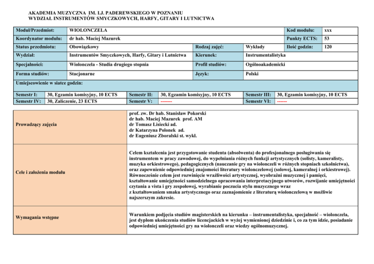 AKADEMIA MUZYCZNA IM. I.J. PADEREWSKIEGO W POZNANIU WYDZIAŁ INSTRUMENTÓW SMYCZKOWYCH, HARFY, GITARY I LUTNICTWA Moduł/Przedmiot: WIOLONCZELA Kod modułu: xxx Koordynator modułu: dr hab. Maciej Mazurek Punkty ECTS: 53 Status przedmiotu: Obowiązkowy Rodzaj zajęć: Wykłady Ilość godzin: 120 Wydział: Instrumentów Smyczkowych, Harfy, Gitary i Lutnictwa Kierunek: Instrumentalistyka Specjalności: Wiolonczela - Studia drugiego stopnia Profil studiów: Ogólnoakademicki Forma studiów: Stacjonarne Język: Polski Umiejscowienie w siatce godzin: Semestr I: Semestr IV: 30, Egzamin komisyjny, 10 ECTS 30, Zaliczenie, 23 ECTS Prowadzący zajęcia Cele i założenia modułu Wymagania wstępne Semestr II: Semestr V: 30, Egzamin komisyjny, 10 ECTS ------- Semestr III: Semestr VI: 30, Egzamin komisyjny, 10 ECTS ------ prof. zw. Dr hab. Stanisław Pokorski dr hab. Maciej Mazurek prof. AM dr Tomasz Lisiecki ad. dr Katarzyna Polonek ad. dr Eugeniusz Zboralski st. wykł. Celem kształcenia jest przygotowanie studenta (absolwenta) do profesjonalnego posługiwania się instrumentem w pracy zawodowej, do wypełniania różnych funkcji artystycznych (solisty, kameralisty, muzyka orkiestrowego), pedagogicznych (nauczanie gry na wiolonczeli w różnych stopniach szkolnictwa), oraz zapewnienie odpowiedniej znajomości literatury wiolonczelowej (solowej, kameralnej i orkiestrowej). Równocześnie celem jest rozwinięcie wrażliwości artystycznej, wyobraźni muzycznej i pamięci, kształtowanie umiejętności samodzielnego opracowania interpretacyjnego utworów, rozwijanie umiejętności czytania a vista i gry zespołowej, wyrabianie poczucia stylu muzycznego wraz z kształtowaniem smaku artystycznego oraz zaznajomienie z literaturą wiolonczelową w możliwie najszerszym zakresie. Warunkiem podjęcia studiów magisterskich na kierunku – instrumentalistyka, specjalność – wiolonczela, jest dyplom ukończenia studiów licencjackich w wyżej wymienionej dziedzinie i, co za tym idzie, posiadanie odpowiedniej umiejętności gry na wiolonczeli oraz wiedzy ogólnomuzycznej. TREŚCI PROGRAMOWE MODUŁU (przedmiotu) Semestr I 1.Rozwój i praca nad specyfiką, różnorodnością oraz oryginalnością stylu XX wieku. 2.Pogłębianie i doskonalenie wiedzy na temat sonorystycznych i wirtuozowskich możliwości instrumentu. 3.Rozwijanie i doskonalenie wyobraźni muzycznej oraz pamięci. Liczba godzin 30 10 10 10 Semestr II 1. Opanowanie całego zakresu zagadnień związanych z techniką gry prawej ręki. 2.Świadoma umiejętność samodzielnego interpretowania dzieła muzycznego. 3.Doskonalenie stylu XX wieku. 30 10 10 10 Semestr III 1. Umiejętność właściwego interpretowania utworów zgodnie z różnorodnością form i stylów. 2.Rozwój i kształtowanie osobowości artystycznej. 3.Opanowanie na scenie-techniki relaksacyjne. 30 10 10 10 Semestr IV 1. Umiejętność właściwego i w pełni samodzielnego interpretowania utworów zgodnie z różnorodnością form, stylów i epok. 2.Swoboda wykonawcza- pełna kontrola wyrazu i techniki na scenie. 3.Umiejętność doskonalenia warsztatu oraz dalszej pracy nad swoim rozwojem. 30 10 10 10 Kod efektu Wiedza (W) EFEKTY KSZTAŁCENIA MODUŁU (przedmiotu) Odwołanie do kierunkowych efektów kształcenia W01 posiada gruntowną znajomość ogólnego repertuaru i związanych z nim tradycji wykonawczych W02 posiada szczegółową wiedzę dotyczącą repertuaru wybranej specjalności oraz związanego z nią piśmiennictwa W03 posiada wiedzę dotyczącą swobodnego korzystania z różnorodnych mediów (książki, nagrania, materiały nutowe, internet, nagrania archiwalne itp.) oraz umiejętność samodzielnego poszerzania i rozwijania wiedzy dotyczącej swojej specjalności K_W05 W04 wykazuje się głębokim zrozumieniem i opanowaniem pedagogiki oraz umiejętnościami jej zastosowania w praktyce, dającymi kwalifikacje do nauczania w zakresie swej specjalności na wszystkich poziomach edukacji artystycznej (A+B+D) K_W10 K_W01 K_W02 Umiejętności (U) U01 posiada rozwiniętą osobowość artystyczną umożliwiającą tworzenie, realizowanie i wyrażanie własnych koncepcji artystycznych K_U01 U02 samodzielnie interpretuje i wykonuje utwory muzyczne w oparciu o własne twórcze motywacje i inspiracje na wysokim poziomie profesjonalizmu K_U02 U03 na bazie doświadczeń związanych ze studiami pierwszego stopnia potrafi budować i pogłębiać obszerny repertuar w zakresie swojej specjalności, z możliwością specjalizowania się w wybranym obszarze K_U04 U04 jest zdolny do funkcjonowania w różnych formach zawodowych i posiada umiejętność współdziałania z innymi artystami w różnego typu zespołach oraz w ramach innych wspólnych prac i projektów, także o charakterze multidyscyplinarnym K_U06 U05 U06 U07 U08 U09 U10 Kompetencje społeczne (K) K01 posiada umiejętność kreowania i realizowania projektów artystycznych (często w powiązaniu z innymi dyscyplinami) oraz posiada zdolność do podjęcia wiodącej roli w zespołach różnego typu kontynuując i rozwijając umiejętności nabyte na studiach pierwszego stopnia, poprzez indywidualną pracę utrzymuje i poszerza swoje zdolności do tworzenia, realizowania i wyrażania własnych koncepcji artystycznych posiada umiejętność szybkiego odczytania i opanowania pamięciowego utworów, ze świadomym zastosowaniem różnych typów pamięci muzycznej posiada umiejętność dogłębnego rozumienia i kontrolowania struktur rytmicznych i metrorytmicznych oraz zagadnień dotyczących aplikatury, smyczkowania, pedalizacji, frazowania, struktury harmonicznej itp. opracowywanych utworów na bazie doświadczeń uzyskanych na studiach pierwszego stopnia wykazuje się umiejętnością świadomego stosowania technik pozwalających panować nad stresem posiada umiejętność praktycznego zastosowania pogłębionej wiedzy dotyczącej szerokich aspektów pedagogiki, dającą kwalifikacje do nauczania w zakresie swej specjalności n