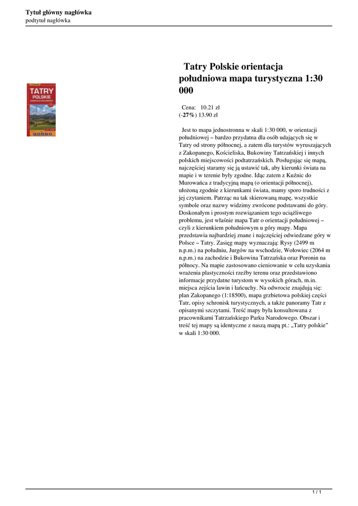 Tytuł główny nagłówka podtytuł nagłówka Tatry Polskie orientacja południowa mapa turystyczna 1:30 000 Cena: 10.21 zł (-27%) 13.90 zł Jest to mapa jednostronna w skali 1:30 000, w orientacji południowej – bardzo przydatna dla osób udających się w Tatry od strony północnej, a zatem dla turystów wyruszających z Zakopanego, Kościeliska, Bukowiny Tatrzańskiej i innych polskich miejscowości podtatrzańskich. Posługując się mapą, najczęściej staramy się ją ustawić tak, aby kierunki świata na mapie i w terenie były zgodne. Idąc zatem z Kuźnic do Murowańca z tradycyjną mapą (o orientacji północnej), ułożoną zgodnie z kierunkami świata, mamy sporo trudności z jej czytaniem. Patrząc na tak skierowaną mapę, wszystkie symbole oraz nazwy widzimy zwrócone podstawami do góry. Doskonałym i prostym rozwiązaniem tego uciążliwego problemu, jest właśnie mapa Tatr o orientacji południowej – czyli z kierunkiem południowym u góry mapy. Mapa przedstawia najbardziej znane i najczęściej odwiedzane góry w Polsce – Tatry. Zasięg mapy wyznaczają: Rysy (2499 m n.p.m.) na południu, Jurgów na wschodzie, Wołowiec (2064 m n.p.m.) na zachodzie i Bukowina Tatrzańska oraz Poronin na północy. Na mapie zastosowano cieniowanie w celu uzyskania wrażenia plastyczności rzeźby terenu oraz przedstawiono informacje przydatne turystom w wysokich górach, m.in. miejsca zejścia lawin i łańcuchy. Na odwrocie znajdują się: plan Zakopanego (1:18500), mapa grzbietowa polskiej części Tatr, opisy schronisk turystycznych, a także panoramy Tatr z opisanymi szczytami. Treść mapy była konsultowana z pracownikami Tatrzańskiego Parku Narodowego. Obszar i treść tej mapy są identyczne z naszą mapą pt.: „Tatry polskie” w skali 1:30 000. 1/1 Powered by TCPDF (www.tcpdf.org)