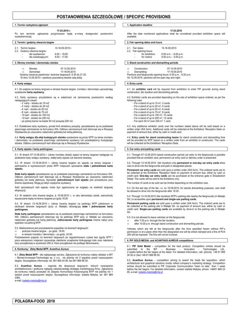POSTANOWIENIA SZCZEGÓŁOWE / SPECIFIC PROVISIONS 1. Termin nadsyłania zgłoszeń 1. Application deadline 17.03.2010 r. Po tym terminie zgłoszenia przyjmowane będę w miarę dostępności powierzchni wystawienniczej. 17.03.2010 After the date mentioned applications shall be considered provided exhibition space still available. 2. Termin i godziny otwarcia targów 2. Fair opening dates and hours 2.1. Termin targów: 2.2. Godziny otwarcia targów: dla wystawców: dla zwiedzających: 13-16.09.2010 r. 8.00 – 18.00 9.00 – 17.00 3. Okresy montaŜu i demontaŜu stoiska • MontaŜ: 07-12.09.2010 • DemontaŜ: 17-19.09.2010 Godziny otwarcia pawilonów i terenów targowych: 6.30 do 21.30. W dniu 12.09.2010 r. pawilony pozostaną otwarte całą dobę. 2.1. Fair dates: 2.2. Fair opening hours: for exhibitors: for visitors 13-16.09.2010 8.00 a.m. – 6.00 p.m. 9.00 a.m.– 5.00 p.m. 3. Stand construction and dismantling periods • Construction: 07-12.09.2010 • Dismantling: 17-19.09.2010 Pavilions and fairgrounds opening hours: 6.30 a.m. - 9.30 p.m. On 12.09.2010 pavilions will be open day and night. 4. Karty wstępu 4. Entry cards 4.1. Do wejścia na tereny targowe w okresie trwania targów, montaŜu i demontaŜu upowaŜniają wystawców karty wystawcy. 4.1. An exhibitor card will be required from exhibitors to enter PIF grounds during stand construction, fair duration and dismantling periods. 4.2. Karty wystawcy przydzielane są w zaleŜności od zamówionej powierzchni według następujących zasad: - 2 karty - stoisko do 10 m2 - 4 karty - stoisko do 20 m2 - 6 kart - stoisko do 50 m2 - 8 kart - stoisko do 75 m2 - 10 kart - stoisko do 100 m2 - 12 kart - stoisko do 200 m2 - po jednej karcie na kaŜde 50 m2 powyŜej 200 m2. 4.2. Exhibitor cards are provided depending on the size of exhibition space ordered, as per the following rules: - For a stand of up to 10 m2, 2 cards - For a stand of up to 20 m2, 4 cards - For a stand of up to 50 m2, 6 cards - For a stand of up to 75 m2, 8 cards - For a stand of up to 100 m2, 10 cards - For a stand of up to 200 m2, 12 cards - For each 50 m2 over 200 m2, 1 card. 4.3. Dodatkowe karty wystawcy, ponad limit określony powyŜej, sprzedawane są na podstawie pisemnego zamówienia na formularzu WA. Odbioru zamówionych kart dokonuje się w Recepcji Wystawców po uiszczeniu naleŜności gotówką lub kartą płatniczą. 4.3. Any additional exhibitor cards over the numbers stated above will be sold based on a written order (WA form). Additional cards will be collected at the Exhibitors’ Reception Desk on payment of amount due, either by cash or credit card. 4.4. Karty wstępu dla ekip budujących stoiska wystawiane są przez MTP na okres montaŜu i demontaŜu na podstawie pisemnego zamówienia wystawcy lub przedsiębiorcy budującego stoiska. Odbioru zamówionych kart dokonuje się w Recepcji Wystawców. 4.4. Entry cards for stand constructing teams for stand construction and dismantling time will be provided by MTP based on a written order from an exhibitor or constructor. The cards will be collected at the Exhibitors’ Reception Desk. 5. Karty wjazdu i karty parkingowe 5. Car entry and parking cards 5.1. W dniach 07-12.09.2010 r. (okres montaŜu stoisk) wjazd na tereny targowe następuje na podstawie karty wstępu wystawcy, stałej karty wjazdu lub zlecenia dostawy. 5.1. Through 07-12.09.2010 (stand construction period) car entry to the fairgrounds is possible provided that an exhibitor card, permanent car entry card or delivery order is presented. 5.2. W dniach 13-16.09.2010 r. (okres trwania targów) do wjazdu na tereny targowe i parkowania w wyznaczonych przez MTP miejscach upowaŜnia stała i jednodniowa karta wjazdu. 5.2. Through 13-16.09.2010 (fair duration) only permanent or one-day car entry cards allow cars to drive into the fairgrounds and park in designated places. Stałe karty wjazdu sprzedawane są na podstawie pisemnego zamówienia na formularzu WA. Odbioru zamówionych kart dokonuje się w Recepcji Wystawców po uiszczeniu naleŜności gotówką lub kartą płatniczą. SprzedaŜ jednodniowych kart wjazdu jest prowadzona przy bramie wjazdowej. Mogą ją nabyć wyłącznie wystawcy. Permanent car entry cards are sold upon a written order (WA form). The ordered cards are to be collected at the Exhibitors’ Reception Desk on payment of amount due, either by cash or credit card. One-day car entry cards can be purchased at the entrance gate in Śniadeckich Street. The cards will be sold to the Exhibitors only. The number of cards to be sold can be limited depending on the exhibition size. Ilość sprzedanych kart wjazdu moŜe być ograniczona ze względu na wielkość targowej ekspozycji. 5.3. On the last day of the fair, i.e. on 16.09.2010, for stands dismantling purposes, cars shall be allowed to drive into the fairgrounds after 18.00 . 5.3. W ostatnim dniu trwania targów, tj. 16.09.2010 r., w celu demontaŜu stoisk, samochody wpuszczane będą na tereny targowe po godz.18.00 5.4. Through 13-16.09.2010 (fair duration) MTP’s parking site nearby the fairgrounds (in Matejki Str.) is accessible upon permanent and single-use parking cards. 5.4. W dniach 13-16.09.2010 r. (okres trwania targów) na parkingu MTP połoŜonym w okolicach terenów targowych (przy ul. Matejki) obowiązują stałe i jednorazowe karty parkingowe. Permanent parking cards are sold upon a written order (WA form). The ordered cards are to be collected at the parking site in Matejki Str. on payment of amount due, either by cash or credit card. Single-use parking cards are available by drive-in to the parking site in Matejki Str. Stałe karty parkingowe sprzedawane są na podstawie pisemnego zamówienia na formularzu WA. Odbioru zamówionych dokonuje się na parkingu MTP przy ul. Matejki po uiszczeniu naleŜności gotówką lub kartą płatniczą. Jednorazowe karty parkingowe moŜna nabyć przy wjeździe na parking MTP. 5.5. Niedozwolone jest pozostawienie pojazdów na terenac