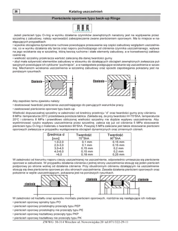 Katalog uszczelnieñ 26 1234567890123456789012345678901212345678901234567890123456789012123456789012345678901234567890121234567890123456789012345678901212345678901234567890 1234567890123456789012345678901212345678901234567890123456789012123456789012345678901234567890121234567890123456789012345678901212345678901234567890 1234567890123456789012345678901212345678901234567890123456789012123456789012345678901234567890121234567890123456789012345678901212345678901234567890 1234567890123456789012345678901212345678901234567890123456789012123456789012345678901234567890121234567890123456789012345678901212345678901234567890 1234567890123456789012345678901212345678901234567890123456789012123456789012345678901234567890121234567890123456789012345678901212345678901234567890 1234567890123456789012345678901212345678901234567890123456789012123456789012345678901234567890121234567890123456789012345678901212345678901234567890 1234567890123456789012345678901212345678901234567890123456789012123456789012345678901234567890121234567890123456789012345678901212345678901234567890 Piercienie oporowe typu back-up Ringe Je¿eli piercieñ typu O-ring w wyniku dzia³ania czynników zewnêtrznych nara¿ony jest na wyp³ywanie przez szczelinê z zabudowy, nale¿y wprowadziæ zabezpieczenie zwane piercieniem oporowym. Ma to miejsce w nastêpuj¹cych przypadkach: wysokie obci¹¿enia dynamiczne ruchowe powoduj¹ce przesuwanie siê czêci zabudowy wzglêdem uszczelnienia, co w wyniku dzia³ania si³y tarcia oraz naporu pochodz¹cego od cinienia czynnika uszczelnianego, wp³ywa na jego wciskanie siê w szczelinê, któr¹ tworz¹ ruchome i sta³e elementy zabudowy, a w konsekwencji zakleszczanie siê. wielkoæ szczeliny przekracza wartoæ zalecan¹ dla danej twardoci gumy. zbyt ma³a sztywnoæ elementów zabudowy w stosunku do dzia³aj¹cych obci¹¿eñ zewnêtrznych zw³aszcza pulsacyjnych powoduj¹ce ich cykliczne puchniêcie, a w nastêpstwie postêpuj¹ce wciskanie siê uszczelnienia w szczelinê. Mechanizm wciskania uszczelnienia w szczelinê zabudowy oraz sposób zapobiegania pokazany jest na poni¿szym rysunkach: Cisnie nie Sz cz e l ina Sz cz e lina Cisn ie n ie Aby zapobiec temu zjawisku nale¿y: dostosowaæ twardoæ piercienia uszczelniaj¹cego do panuj¹cych warunków pracy. zastosowaæ piercienie oporowe typu back-up. Wielkoæ dopuszczalnej szczeliny w zale¿noci od rednicy przekroju d oraz twardoci gumy przy cinieniu 8 MPa i temperaturze 20oC przedstawia poni¿sza tablica. Zak³ada siê, ¿e przy twardoci H=70oShA, temperaturze 20oC i cinieniu 8 MPa i prawid³owo obliczonej wielkoci szczeliny nie dojdzie wyp³ywu uszczelnienia. Aby wyeliminowaæ ryzyko wyp³ywu uszczelnienia przez szczelinê, zaleca siê ju¿ od cinienia 5 MPa stosowanie piercieni typu O-ring z materia³u o twardoci 90oShA. Powy¿ej 5 MPa zalecane jest tak¿e stosowanie piercieni oporowych zw³aszcza w przypadku wystêpowania obci¹¿eñ dynamicznych oraz zmiennych cinieñ. UHGQLFDG >PP@ ! 7ZDUGR ü 2 6K$ PP PP PP PP PP 7ZDUGR ü 2 6K$ PP PP PP PP PP W zale¿noci od kierunku naporu cieczy uszczelnianej na uszczelnienie, odpowiednio umieszcza siê piercienie oporowe w zabudowie. W przypadku dzia³ania cinienia z jednej strony uszczelnienia stosujê siê jeden piercieñ podporowy po stronie wolnej od dzia³ania cinienia. Przy obustronnym cinieniu dzia³aj¹cym na uszczelnienie stosujê siê dwa piercienie oporowe po obu stronach uszczelnienia. Zasada dzia³ania piercieni oporowych oraz po³o¿enie w wêle uszczelniaj¹cym, pokazana jest na poni¿szych rysunkach. cisnie nie cisnie nie cisnie nie W zale¿noci od kszta³tu oraz sposobu monta¿u piercieni oporowych, rozró¿nia siê nastêpuj¹ce ich rodzaje: piercieñ oporowy spiralny typu PO piercieñ oporowy prostok¹tny przeciêty typu PEP piercieñ oporowy prostok¹tny nie przeciêty typu PE piercieñ oporowy kszta³towy przeciêty typu PKP piercieñ oporowy kszta³towy nie przeciêty typu PK ZWWG 50-314 Wroc³aw ul. Nowowiejska 20 tel:071/322-29-11 Katalog uszczelnieñ 27 Konstrukcja 45 v R 0 ,5 Typ PE Typ PEP Typ PO Typ PK Przyk³adowy kszta³t przekroju piercienia oporowego PK i PKP Typ PKP Parametry techniczne W zale¿noci od cinienia nale¿y stosowaæ nastêpuj¹ce materia³y oraz typy piercieni oporowych: do 25 MPa cinienia typy PE, PEP, PO, materia³ PTFE bez wype³niaczy. do 40 MPa cinienia typy PE, PEP, PO, materia³ PTFE z w³óknem szklanym. powy¿ej 40 MPa cinienia typy PK, PKP, materia³ PTFE z w³óknem szklanym lub PA wype³niony. Materia³y Do wykonania piercieni oporowych stosuje siê: gumê o wysokiej twardoci na bazie kauczukowej NBR pliczterofluoroetylen PTFE - czysty lub wype³niany: w³óknem szklanym oznaczenie PTFE-SZ br¹zem oznaczenie PTFE-BR grafitem oznaczenie PTFE-C poliamid czysty oznaczenie PA lub zbrojony oznaczenie PA-Z S Zabudowa K R b3 d6 PE P d6 PE d5 d3 d4 Typ d5 R R b2 S S/2 K R R d4 d3 R Typ PO b3 b2 ZWWG 50-314 Wroc³aw ul. Nowowiejska 20 tel:071/322-29-11 Katalog uszczelnieñ 28 S K R PK PK P b3 d6 d3 d4 Typ d5 R R b2 Wymiary zabudowy FLHQLD UHGQLFD :\PLDU\SU]HNURMXSLHU >PP@ SU]HNURMX SLHU FLHQLD :\VRNR üSLHU FLHQLD W\SX2ULQJ RSRURZHJR. 6]HUR NR ü G :DUXQNL 6 >PP@ :DUXQNL UXFKRZH VSRF]\QN 5XFKGK G G G G GO G G G G G G G G G G G G :\PLDU\]DEXGRZ\ >PP@ UHGQLFHURZNyZ]DEXGRZ\ 6SRF]\QHN 5XFKG+ 6SRF]\QHN GK G+ G G G G G G G G G G G G G G G G G G G G G G G G G G G G G G G G G G G G G G G G G G G G G G G G G G G 6]HURNR ü]DEXGRZ\ 3URPLH E Oznaczanie Piercienie oporowe oznaczane s¹ w nastêpuj¹cy sposób: typ konstrukcyjny piercienia oporowego rednica wewnêtrzna zabudowy d3 lub d5 wysokoæ zabudowy K symbol materia³u (PE, PEP, PO, PK, PKP)- (d3 lub d5)[mm] x K Symbol materia³u ZWWG 50-314 Wroc³aw ul. Nowowiejska 20 tel:071/322-29-11 E 5