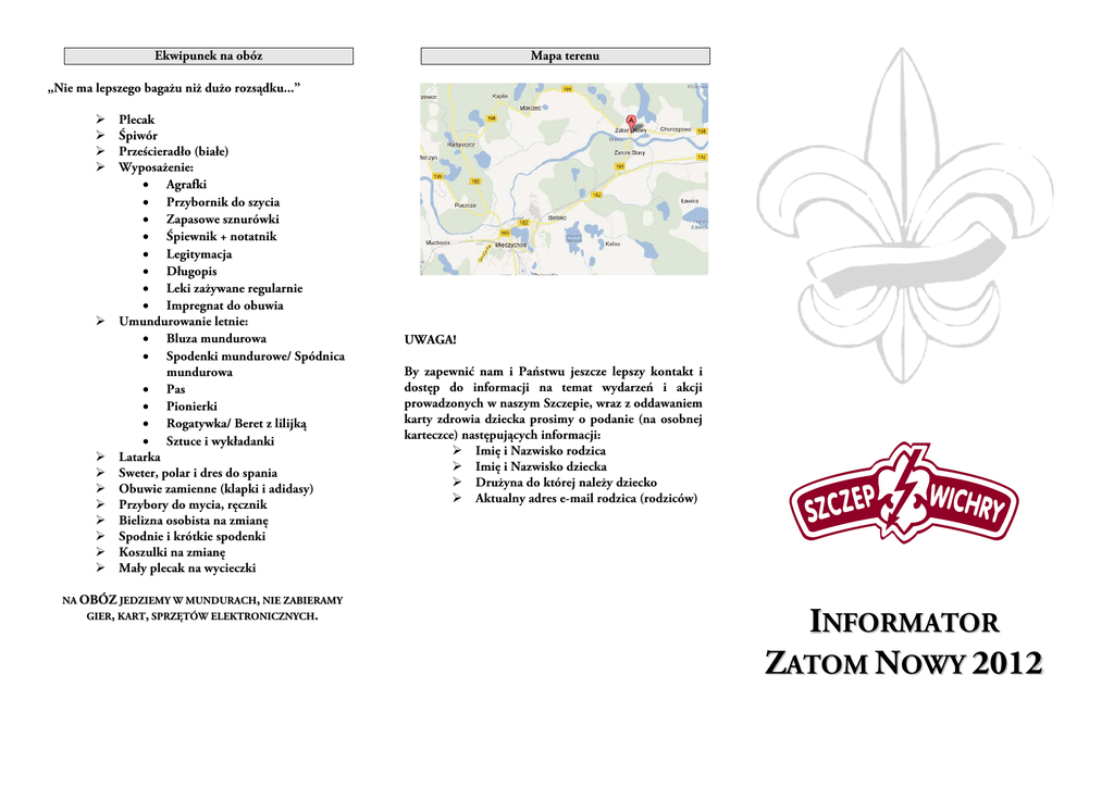 Ekwipunek na obóz Mapa terenu „Nie ma lepszego bagażu niż dużo rozsądku...” Plecak Śpiwór Prześcieradło (białe) Wyposażenie: Agrafki Przybornik do szycia Zapasowe sznurówki Śpiewnik + notatnik Legitymacja Długopis Leki zażywane regularnie Impregnat do obuwia Umundurowanie letnie: Bluza mundurowa Spodenki mundurowe/ Spódnica mundurowa Pas Pionierki Rogatywka/ Beret z lilijką Sztuce i wykładanki Latarka Sweter, polar i dres do spania Obuwie zamienne (klapki i adidasy) Przybory do mycia, ręcznik Bielizna osobista na zmianę Spodnie i krótkie spodenki Koszulki na zmianę Mały plecak na wycieczki NA OBÓZ JEDZIEMY W MUNDURACH, NIE ZABIERAMY GIER, KART, SPRZĘTÓW ELEKTRONICZNYCH. UWAGA! By zapewnić nam i Państwu jeszcze lepszy kontakt i dostęp do informacji na temat wydarzeń i akcji prowadzonych w naszym Szczepie, wraz z oddawaniem karty zdrowia dziecka prosimy o podanie (na osobnej karteczce) następujących informacji: Imię i Nazwisko rodzica Imię i Nazwisko dziecka Drużyna do której należy dziecko Aktualny adres e-mail rodzica (rodziców) INFORMATOR ZATOM NOWY 2012 Miejsce W tym roku udajemy się do miejscowości Zatom Nowy położonej w powiecie międzychodzkim, w gminie Międzychód. Będziemy mieszkać nad j. Barlińskim. Teren i okolice sprzyjają pieszym wycieczkom i licznym grom terenowym w lesie. Termin Wyjazd na obóz odbędzie się 02.08.2012 (czwartek) w godzinach wieczornych ok. 18:00, zbiórka najprawdopodobniej na stacji PKP Kraków Płaszów. Powrót natomiast w godzinach rannych 28.08.2012 Dokładne godziny zostaną podane, kiedy będą znane dokładne godziny odjazdu pociągów. Zawiadomimy o nich na naszej stronie internetowej. Rodziców zapraszamy w odwiedziny w terminie: 11-12.08.2012 Kadra i organizatorzy Organizatorem obozu jest Szczep Wichry 5 KDH Kraków Związku Harcerstwa Rzeczypospolitej. Kadrę wychowawczą obozu stanowią: - phm. Piotr Hausner HR. – komendant, - pwd. Mariusz Skóra HO- kwatermistrz Opłaty Terminarz WPŁATA GWARANCYJNA 300 zł: - do 15 maja 2012 (wtorek) Wpłaty gotówkowe będą przyjmowane w SP nr 12 w godzinach 18.00 – 18.30 KARTY ZDROWIA: - należy oddać do 12 czerwca 2012 Karty będą przyjmowane w SP nr 12 w godzinach 18.00 – 18.30 Proszę o wydrukowanie karty zdrowia na jednej kartce formatu A4! (obustronnie) – inne karty nie będą przyjmowane. Nowy wzór kart zdrowia jest dostępny na stronie wichry.pl Bardzo prosimy o odnotowanie na kartach zdrowia wszelkich informacji dotyczących zażywanych leków i ich dawkowania. WPŁATA POZOSTAŁA 690 zł (740 zł): - do 10 lipca 2012 Wpłaty gotówkowe będą przyjmowane w SP nr 12 w godzinach 18.00 – 18.30 W przypadku terminowego oddania kart zdrowia oraz terminowego dokonania wpłaty zaliczki obniżymy odpłatność za obóz o 50 zł czyli do 990 zł W obozie uczestniczyć będą harcerze i harcerki - 5 KDH PIORUN drużynowy wyw. Maciej Adrian, tel. 534 668 203 - 5 KDH BŁYSKAWICA drużynowa: pwd Karolina Wierzejska, tel. 509 842 251 - 73 PgDH LAS Drużynowa pwd. Katarzyna Chmielewska-Synowska Tel. 601 239 049 Warunkiem uczestnictwa w zimowisku jest: Wiek 10 lat i więcej, wypełnienie i oddanie karty zdrowia do: 12.06.2012 r., opłata gwarancyjna 15.05.2012 r. Całkowita opłata za obóz do dnia: 10.07.2012 r. Personel Na zimowisku obecny będzie wykwalifikowany personel: - lekarz medycyny - ratownik WOPR Wszyscy instruktorzy oraz drużynowi są posiadaczami kursu wychowawców kolonijnych. Kontakt Wszelkich wpłat, można również dokonać na konto Szczepu: UWAGA! ZMIANA NUMERU KONTA BANKOWEGO! Całkowity koszt obozu wynosi: 990 zł* (1040 zł) *(dla tych którzy terminowo wpłacą zaliczkę oraz terminowo oddadzą kartę zdrowia) Uczestnicy Alior Bank w Krakowie 50 2490 0005 0000 4600 5713 5727 z tytułem: ------------------------składka programowa AL 2012 imię i nazwisko dziecka. -----------------------Wszelkie informacje dotyczące wpłat i terminów można znaleźć na naszej stronie www.wichry.pl W razie jakichkolwiek wątpliwości i zapytań prosimy o kontakt z drużynowymi lub mailowo: [email protected]. Zapraszamy również do śledzenia naszej strony internetowej: www.wichry.pl Używanie telefonów komórkowych będzie możliwe na własną odpowiedzialność, jednak, aby nie zaburzały one zajęć programowych będzie można mieć je włączone w godzinach podanych przez drużynowych. Dostępny będzie również telefon Szczepowy. Jego numer zostanie podany przy wyjeździe.