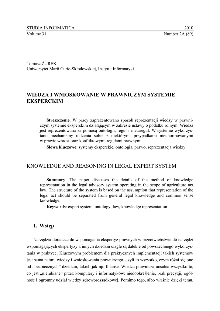 Słowa kluczowe: systemy eksperckie, ontologia, prawo, reprezentacja wiedzy