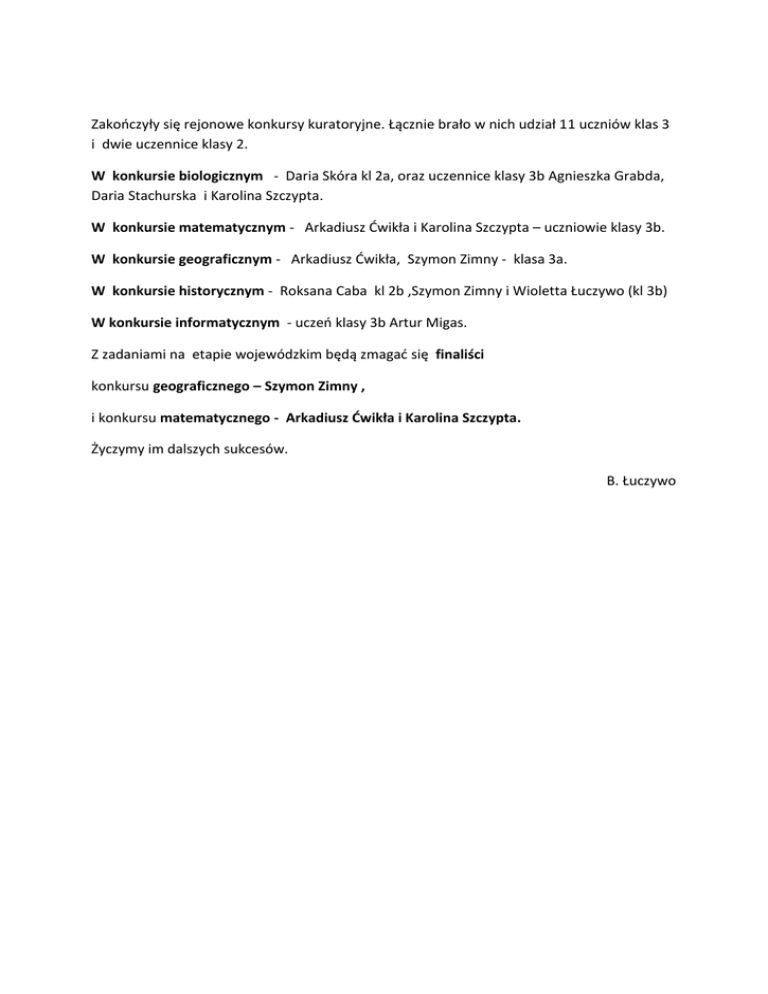 Zakończyły się rejonowe konkursy kuratoryjne. Łącznie brało w nich udział 11 uczniów klas 3 i dwie uczennice klasy 2. W konkursie biologicznym - Daria Skóra kl 2a, oraz uczennice klasy 3b Agnieszka Grabda, Daria Stachurska i Karolina Szczypta. W konkursie matematycznym - Arkadiusz Ćwikła i Karolina Szczypta – uczniowie klasy 3b. W konkursie geograficznym - Arkadiusz Ćwikła, Szymon Zimny - klasa 3a. W konkursie historycznym - Roksana Caba kl 2b ,Szymon Zimny i Wioletta Łuczywo (kl 3b) W konkursie informatycznym - uczeń klasy 3b Artur Migas. Z zadaniami na etapie wojewódzkim będą zmagać się finaliści konkursu geograficznego – Szymon Zimny , i konkursu matematycznego - Arkadiusz Ćwikła i Karolina Szczypta. Życzymy im dalszych sukcesów. B. Łuczywo