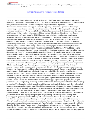 Dane pochodzą ze strony: http://www.ogloszenia.wirtualnaskandynawia.pl/. Wygenerowano dnia: 08-03-2017. spawanie rurociągów w Finlandii / Fiński kontrakt Praca przy spawaniu rurociągów o małych średniacach ( do 20 cm) na terenie budowy elektrowni atomowej. Wymagania: Wymagamy: • Min. 3 lata udokumentowanego doświadczenia zawodowego na analogicznym stanowisku • Aktualne europejskie certyfikaty na met. Spawania 111/141 • Doświadczenie w spawaniu rurociągów oraz stali węglowej. • Znajomość rysunku technicznego umożliwiająca samodzielną pracę • Gotowość do udziału w testach praktycznych potwierdzających posiadane umiejętności • W pierwszej kolejności będą akceptowani kandydaci ze znajomością języka angielskiego • Mile widziany własny samochód na wyjazd Oferujemy: Oferujemy: • Atrakcyjne wynagrodzenie:14,72 euro brutto/h • Fiński kontrakt na 6 miesięcy z możliwością przedłużenia • Bezpłatne zakwaterowanie na terenie miasta: Rauma lub Pori • Bezpłatne ubrania robocze • Pełne ubezpieczenie zdrowotne (obowiązujące na terenie całej UE) Adecco Poland Sp. z o.o. Siedziba Główna Al. Jana Pawła II 19 00-854 Warszawa Telefon: +48 22 376 09 00 Fax: +48 22 376 09 01 [email protected] Adecco, jako globalny lider w dziedzinie rozwiązań zarządzania zasobami ludzkimi, oferuje szeroki zakres usług: * rekrutacja i selekcja pracowników na stałe (Permanent Placement), * rekrutacja pracowników tymczasowych (Temporary Staffing), * weryfikacja i ocena kandydatów (Assessment Center), * ocena pracowników, określenie potencjału oraz kierunków rozwoju (Development Center), * poszukiwania bezpośrednie kluczowych specjalistów, menedżerów oraz na stanowiska kierownicze (Direct & Executive Search), * rekrutacja do pracy za granicą (International Recruitment), * program zwolnień monitorowanych (Outplacement), * doradztwo z zakresu zarządzania zasobami ludzkimi i rynku pracy (Consulting & Adjustment Services), * obsługa pracowników poprzez biuro zlokalizowane na terenie firmy Klienta (On-Site Management), * outsourcing funkcji z zakresu zarządzania personelem (Outsourcing), * zarządzanie i koordynacja pracy innych dostawców personelu (Master Vendoring), * wypróbowanie pracownika przed zatrudnieniem na stałe (Try & Hire), * przeprowadzanie testów manualnych i internetowych (Xpert). Wychodząc naprzeciw oczekiwaniom klientów oferujemy szeroki wachlarz usług i sprawdzonych rozwiązań. Zawsze w sposób indywidualny podchodzimy do każdego klienta, gdyż traktujemy zasoby ludzkie jako największe dobro firmy. Służymy pomocą i radą z zakresu Human Resources oraz gwarantujemy, że podejmiemy się każdego zlecenia. Skorzystaj z naszego bogatego doświadczenia oraz wsparcia jakiego można oczekiwać od lidera branży, który od 50 lat działa na światowym rynku. Sprawdź nas i skontaktuj się z lokalnym biurem Adecco! Nasza sieć biur na całym świecie i zmieniające się warunki geopolityczne, w tym poszerzenie Unii Europejskiej, pozwoliły nam na zaoferowanie polskim pracownikom możliwości pracy za granicą. Współpracując z międzynarodowymi klientami nasi kandydaci zdobywają doświadczenie i kontakty, które owocują poprawą kwalifikacji i lepszą pozycją na polskim rynku pracy. Zależy nam na tym, aby promować polskich kandydatów. Stosując w trakcie rekrutacji międzynarodowy system oceny Adecco Xpert, dajemy im pewność, że poradzą sobie z wyzwaniem, jakie stawia przed nimi międzynarodowy rynek pracy. Współpracujemy z oddziałami Adecco na całym świecie, a nasza oferta jest skierowana do osób będących na początku swojej kariery zawodowej oraz do kandydatów posiadających specjalistyczne kwalifikacje lub określone umiejętności. Korzyści dla Klienta: * współpraca z największą firmą rekrutacyjną świata, * struktura regionalna - ponad 40 lokalizacji w Polsce, * zespół konsultantów dedykowanych do rekrutacji zagranicznych, * długoletnie doświadczenie w prowadzeniu projektów międzynarodowych, * profesjonalny i skuteczny proces rekrutacji i selekcji. Korzyści dla Kandydata: * praca u sprawdzonych i pewnych pracodawców, * legalne i atrakcyjne zatrudnienie, * warunki pracy i wynagrodzenia adekwatne do kraju w którym oferujemy pracę, * pomoc w znalezieniu mieszkania oraz organizacji transportu do miejsca pracy, * opieka podczas całego procesu Dane pochodzą ze strony: http://www.ogloszenia.wirtualnaskandynawia.pl/. Wygenerowano dnia: 08-03-2017. rekrutacji (od momentu podjęcia decyzji do wyjazdu za granicę), * możliwość uczestniczenia w szkoleniach językowych. W Polsce działamy od 1994 roku, więc mieliśmy wystarczająco dużo czasu, aby dogłębnie poznać panujące tu prawo i zwyczaje pracy. Otworzyliśmy ponad 30 biur pracy tymczasowej, stałej oraz placówek on-site – lokalnych przedstawicielstw utworzonych przy dużych klientach, w ponad 30 miastach w całej Polsce. Dzięki takiej ekspansji pracodawcy i potencjalni pracownicy mają ułatwiony dostęp do naszych usług. Z uwagi na przystąpienie Polski do Unii Europejskiej prowadzimy aktywną rekrutację do pracy w krajach członkowskich. Co roku bierzemy udział w Dniach Kariery AIESEC, Programie Cień Menedżera, Programie Grasz o Staż, ogólnopolskich i lokalnych targach pracy, a także uczestniczymy w spotkaniach organizowanych przez szkoły i uczelnie. Adecco Poland jest członkiem i jednym z założycieli Polskiego Forum HR zrzeszającego największe firmy świadczące usługi doradztwa personalnego w Polsce. W ubiegłym roku pomogliśmy znaleźć pracę dla ponad 27 000 osób. Adecco od 2002 roku aktywnie wspiera inicjatywę Global Compact pod patronatem ONZ. Inicjatywa ta zrzesza firmy, które dobrowolnie zgadzają się przestrzegać określonych ram etycznych w prowadzeniu biznesu, takich jak: przestrzeganie prawa człowieka, zachowywanie wysokich standardów pracy, stosowanie się do przepisów ochrony środo