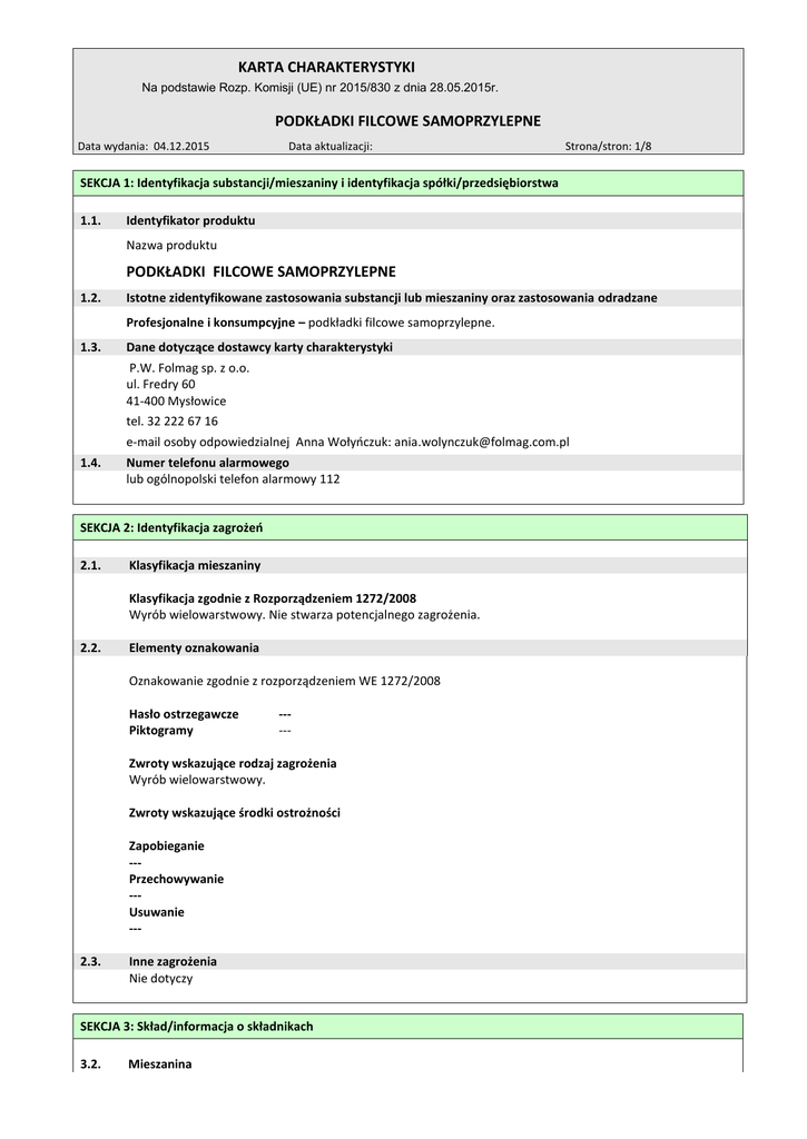 KARTA CHARAKTERYSTYKI Na podstawie Rozp. Komisji (UE) nr 2015/830 z dnia 28.05.2015r. PODKŁADKI FILCOWE SAMOPRZYLEPNE Data wydania: 04.12.2015 Data aktualizacji: Strona/stron: 1/8 SEKCJA 1: Identyfikacja substancji/mieszaniny i identyfikacja spółki/przedsiębiorstwa 1.1. Identyfikator produktu Nazwa produktu PODKŁADKI FILCOWE SAMOPRZYLEPNE 1.2. Istotne zidentyfikowane zastosowania substancji lub mieszaniny oraz zastosowania odradzane Profesjonalne i konsumpcyjne – podkładki filcowe samoprzylepne. 1.3. Dane dotyczące dostawcy karty charakterystyki P.W. Folmag sp. z o.o. ul. Fredry 60 41-400 Mysłowice tel. 32 222 67 16 e-mail osoby odpowiedzialnej Anna Wołyńczuk: [email protected] 1.4. Numer telefonu alarmowego lub ogólnopolski telefon alarmowy 112 SEKCJA 2: Identyfikacja zagrożeń 2.1. Klasyfikacja mieszaniny Klasyfikacja zgodnie z Rozporządzeniem 1272/2008 Wyrób wielowarstwowy. Nie stwarza potencjalnego zagrożenia. 2.2. Elementy oznakowania Oznakowanie zgodnie z rozporządzeniem WE 1272/2008 Hasło ostrzegawcze Piktogramy ----- Zwroty wskazujące rodzaj zagrożenia Wyrób wielowarstwowy. Zwroty wskazujące środki ostrożności Zapobieganie --Przechowywanie --Usuwanie --2.3. Inne zagrożenia Nie dotyczy SEKCJA 3: Skład/informacja o składnikach 3.2. Mieszanina KARTA CHARAKTERYSTYKI Na podstawie Rozp. Komisji (UE) nr 2015/830 z dnia 28.05.2015r. PODKŁADKI FILCOWE SAMOPRZYLEPNE Data wydania: 04.12.2015 Data aktualizacji: Strona/stron: 2/8 Charakter chemiczny: Składniki: filc, klej topliwy samoprzylepny, papier silikonowy jako ochrona kleju. Nazwa substancji Identyfikator Klasyfikacja 1272/2008/WE % wag Filc [wyrób włókienniczy z włókna sztucznego] Indeks --CAS --WE --- --- --- do 85 Klej samoprzylepny wiecznie żywy Indeks --CAS --WE --- --- --- do 3 papier z celulozy Indeks --CAS 65996-61-4 WE --- Flam. Sol. 3 H242 do 15 *Pełne znaczenie zwrotów zagrożenia H ujęto w punkcie 16 SEKCJA 4: Środki pierwszej pomocy 4.1. 4.2. 4.3. Opis środków pierwszej pomocy Informacja ogólna Wyrób. Drogi narażenia: Drogi oddechowe, drogi pokarmowe, kontakt ze skórą, kontakt z oczami. Następstwa wdychania pyłów lub par: Wyprowadzić poszkodowana osobę na świeże powietrze. Ułożyć w wygodnej pozycji. Zapewnić ciepło i spokój. W razie potrzeby zapewnić pomoc lekarską. Następstwa połknięcia: Mało prawdopodobne. Przepłukać usta wodą, Nie wywoływać wymiotów. W razie potrzeby zapewnić pomoc medyczną . Choremu zapewnić spokój, leżenie i ciepło. Kontakt z oczami: Usunąć szkła kontaktowe. Przemyć zanieczyszczone oczy większą ilością wody przez 15 minut, przy wywiniętych powiekach. Co pewien czas nakładać górną na dolną powiekę. Oczy osłonić kompresem. W razie potrzeby zapewnić pomoc okulisty. Kontakt ze skórą: Zdjąć zanieczyszczone ubranie i buty. Oczyścić skórę, przemyć wodą a następnie wodą z łagodnym mydłem. W przypadku gdy wystąpi podrażnienie skóry, które nie przemija, skonsultować się z lekarzem dermatologiem. Najważniejsze ostre i opóźnione objawy oraz skutki narażenia Brak danych. Wskazania dotyczące wszelkiej natychmiastowej pomocy lekarskiej i szczególnego postępowania z poszkodowanym W miejscu pracy powinny być dostępne środki umożliwiające pomoc przedlekarską. udzielające pierwszej pomocy powinny posiadać rękawiczki medyczne. SEKCJA 5: Postępowanie w przypadku pożaru 5.1. Środki gaśnicze KARTA CHARAKTERYSTYKI Na podstawie Rozp. Komisji (UE) nr 2015/830 z dnia 28.05.2015r. PODKŁADKI FILCOWE SAMOPRZYLEPNE Data wydania: 04.12.2015 5.2. 5.3. Data aktualizacji: Strona/stron: 3/8 Odpowiednie środki gaśnicze: ditlenek węgla CO2, piana gaśnicza, proszek gaśniczy, rozproszona woda. Niewłaściwe środki gaśnicze: Nie stosować zwartych strumieni wody. Szczególne zagrożenia związane z substancją lub mieszaniną Produkty spalania: Podczas spalania tworzy się tlenek i ditlenek węgla. Mieszaniny wybuchowe: Nie dotyczy. Informacje dla straży pożarnej Stosować standardowe metody gaszenia pożarów chemicznych. Opakowania narażone na działanie wysokiej temperatury chłodzić wodą i w miarę możliwości usunąć z zagrożonego obszaru. Unikać wdychania oparów. Sprzęt ochronny strażaków: Pełne wyposażenie ochronne. Aparaty izolujące drogi oddechowe. SEKCJA 6: Postępowanie w przypadku niezamierzonego uwolnienia do środowiska 6.1. 6.2. 6.3. 6.4. Indywidualne środki ostrożności, sprzęt ochronny i procedury w sytuacjach awaryjnych W przypadku wydostania się większej ilości produktu do otoczenia w sposób niekontrolowany, ostrzec jego użytkowników i nakazać opuszczenie zanieczyszczonego terenu osobom postronnym. Środki ostrożności w zakresie ochrony środowiska Nie dopuścić do zanieczyszczenia środowiska. Zabezpieczyć studzienki ściekowe. W przypadku poważnego zanieczyszczenia cieku wodnego, systemu kanalizacyjnego lub zanieczyszczenia gruntu, powiadomić odpowiednie władze administracyjne i kontrolne oraz organizacje ratownicze. Metody i materiały zapobiegające rozprzestrzenianiu się skażenia i służące do usuwania skażenia Usunąć wszelkie, potencjalne źródła zapłonu. Zabezpieczyć uszkodzone opakowania. Wietrzyć zagrożony obszar i unikać wdychania oparów. Zbieranie zrzuconego produktu dokonywane jest mechanicznie. Zebraną ze środowiska masę umieścić w opakowaniu zastępczym. Odniesienia do innych sekcji Ochrony osobiste: sekcja 8 Metody unieszkodliwiania: sekcja 13. SEKCJA 7: Postępowanie z substancjami i mieszaninami oraz ich magazynowanie 7.1. 7.2. Środki ostrożności dotyczące bezpiecznego postępowania Zalecenia podczas wykonywania czynności z wyrobem: Nie przechowywać w pobliżu źródeł zapłonu. Nie palić tytoniu. Odporność termiczna ( SAFT, MC 218) ~ 78ºC Wysoka przyczepność na zimno. Bardzo dobra adhezja do metali. Dobra stabilność termiczna. Stosować przepisy ogólne przemysłowej higieny pracy. Nie jeść, ni
