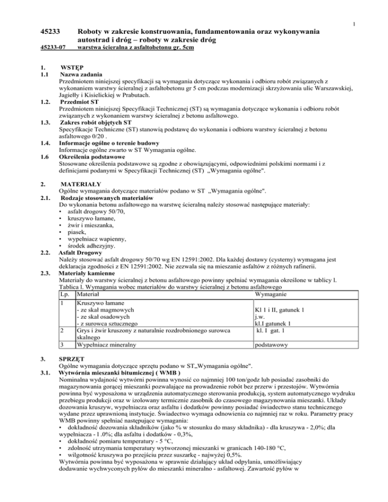 1 45233 Roboty w zakresie konstruowania, fundamentowania oraz wykonywania autostrad i dróg – roboty w zakresie dróg 45233-07 warstwa ścieralna z asfaltobetonu gr. 5cm 1. 1.1 1.2. 1.3. 1.4. 1.6 2. 2.1. 2.2. 2.3. 3. 3.1. WSTĘP Nazwa zadania Przedmiotem niniejszej specyfikacji są wymagania dotyczące wykonania i odbioru robót związanych z wykonaniem warstwy ścieralnej z asfaltobetonu gr 5 cm podczas modernizacji skrzyżowania ulic Warszawskiej, Jagiełły i Kisielickiej w Prabutach. Przedmiot ST Przedmiotem niniejszej Specyfikacji Technicznej (ST) są wymagania dotyczące wykonania i odbioru robót związanych z wykonaniem warstwy ścieralnej z betonu asfaltowego. Zakres robót objętych ST Specyfikacje Techniczne (ST) stanowią podstawę do wykonania i odbioru warstwy ścieralnej z betonu asfaltowego 0/20 . Informacje ogólne o terenie budowy Informacje ogólne zwarto w ST Wymagania ogólne. Określenia podstawowe Stosowane określenia podstawowe są zgodne z obowiązującymi, odpowiednimi polskimi normami i z definicjami podanymi w Specyfikacji Technicznej (ST) „Wymagania ogólne". MATERIAŁY Ogólne wymagania dotyczące materiałów podano w ST „Wymagania ogólne". Rodzaje stosowanych materiałów Do wykonania betonu asfaltowego na warstwę ścieralną należy stosować następujące materiały: • asfalt drogowy 50/70, • kruszywo łamane, • żwir i mieszanka, • piasek, • wypełniacz wapienny, • środek adhezyjny. Asfalt Drogowy Należy stosować asfalt drogowy 50/70 wg EN 12591:2002. Dla każdej dostawy (cysterny) wymagana jest deklaracja zgodności z EN 12591:2002. Nie zezwala się na mieszanie asfaltów z różnych rafinerii. Materiały kamienne Materiały do warstwy ścieralnej z betonu asfaltowego powinny spełniać wymagania określone w tablicy l. Tablica l. Wymagania wobec materiałów do warstwy ścieralnej z betonu asfaltowego Lp. Materiał Wymaganie 1 Kruszywo łamane - ze skał magmowych Kl 1 i II, gatunek 1 - ze skał osadowych j.w. - z surowca sztucznego kl.I gatunek 1 2 Grys i żwir kruszony z naturalnie rozdrobnionego surowca kl. I gat. 1 skalnego 3 Wypełniacz mineralny podstawowy SPRZĘT Ogólne wymagania dotyczące sprzętu podano w ST„Wymagania ogólne". Wytwórnia mieszanki bitumicznej ( WMB ) Nominalna wydajność wytwórni powinna wynosić co najmniej 100 ton/godz lub posiadać zasobniki do magazynowania gorącej mieszanki pozwalające na prowadzenie robót bez przerw i przestojów. Wytwórnia powinna być wyposażona w urządzenia automatycznego sterowania produkcją, system automatycznego wydruku przebiegu produkcji oraz w izolowany termicznie zasobnik do czasowego magazynowania mieszanki. Układy dozowania kruszyw, wypełniacza oraz asfaltu i dodatków powinny posiadać świadectwo stanu technicznego wydane przez uprawnioną instytucje. Świadectwo wymaga odnowienia co najmniej raz w roku. Parametry pracy WMB powinny spełniać następujące wymagania: • dokładność dozowania składników (jako % w stosunku do masy składnika) - dla kruszywa - 2,0%; dla wypełniacza - l .0%; dla asfaltu i dodatków - 0,3%, • dokładność pomiaru temperatury - 5 °C, • zdolność utrzymania temperatury wytworzonej mieszanki w granicach 140-180 °C, • wilgotność kruszywa po przejściu przez suszarkę - najwyżej 0,5%. Wytwórnia powinna być wyposażona w sprawnie działający układ odpylania, umożliwiający dodawanie wychwyconych pyłów do mieszanki mineralno - asfaltowej. Zawartość pyłów w 2 3.2. 3.3. 3.4. 4. 5. 5.1. 5.2. gazach odlotowych nie może przekraczać 20 mg/m3 Wykonawca musi posiadać świadectwo dopuszczenia wytwórni do ruchu przez właściwe organy administracji państwowej (np. inspekcję sanitarną,władze ochrony środowiska). Układarka Wykonawca powinien posiadać co najmniej dwie układarki z elektronicznym sterowaniem grubości układanej warstwy. Stół układarki powinien być podgrzewany oraz posiadać płynną regulację częstotliwości i amplitudy wibracji deski oraz regulację parametrów pracy ubijaków. Systemy sterowania muszą zapewnić możliwość stałej prędkości poruszania się układarki w zakresie od l m/min. Do 50 m/min. Układarka powinna mieć możliwość układania w jednym przejściu warstwy o grubości od 4 cm do 15 cm, oraz na szerokość, co najmniej 7,5 m. Sprzęt zagęszczający Do zagęszczania mieszanki Wykonawca powinien stosować następujący sprzęt: • walce statyczne gładkie; ciężar całkowity walca co najmniej 9 ton, nacisk jednostkowy około 30 kg/cm, • walce wibracyjne; ciężar całkowity walca powyżej 9 ton; parametry wibracji :amplituda -około l mm, częstotliwość - około 40 Hz, • walce ogumione o regulowanym ciśnieniu w oponach; ciężar walca ogumionego od 10 do 20 ton - w zależności od balastu, nacisk przenoszony przez jedno koło około 1,5 tony • wibracyjne zagęszczarki płytowe - do zagęszczania w miejscach trudno dostępnych; statyczny nacisk zagęszczarki nie mniej szy niż 0,016 MPa Sprzęt do obcinania pionowych krawędzi oraz frezowania lokalnych nierówności Do obcinania pionowych krawędzi oraz do frezowania lokalnych nierówności mogą być wykorzystane samodzielne narzędzia (piły, frezarki) lub osprzęt na specjalistycznym pojeździe. TRANSPORT Ogólne wymagania dotyczące transportu podano w ST „Wymagania ogólne". Transport powinien się odbywać w sposób uniemożliwiający zanieczyszczenie transportowanej mieszanki mineralno-asfaltowej oraz dróg publicznych po których będzie odbywał się transport. Mieszanka mineralnoasfaltowa będzie przewożona samochodami samowyładowczymi pod przykryciem plandekami. Wykonawca wykona pomosty do skraplania skrzyń samochodów emulsją oraz do rolowania plandek. Transport powinien być takiej ładowności i tak zorganizowany, aby nie dopuścić do spadków temperatury przewożonej mieszanki z wytwórni do miejsca wbudowania, poniżej 10% temperatury wyjściowej. Samochody z wyciekami o