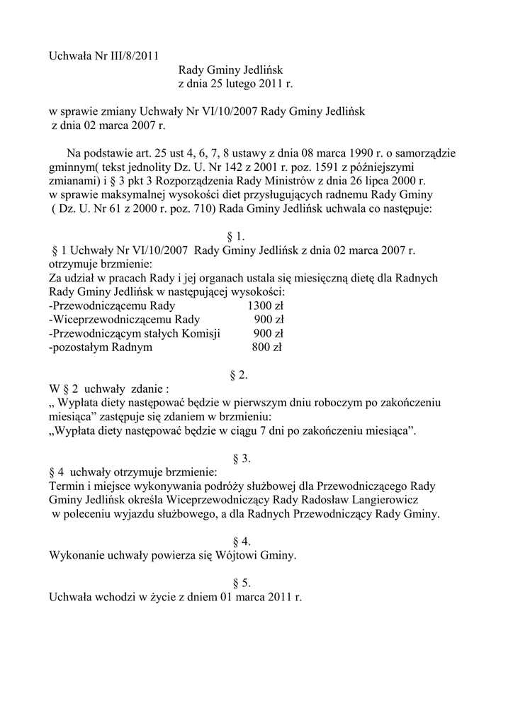 Uchwała Nr III/8/2011 Rady Gminy Jedlińsk z dnia 25 lutego 2011 r. w sprawie zmiany Uchwały Nr VI/10/2007 Rady Gminy Jedlińsk z dnia 02 marca 2007 r. Na podstawie art. 25 ust 4, 6, 7, 8 ustawy z dnia 08 marca 1990 r. o samorządzie gminnym( tekst jednolity Dz. U. Nr 142 z 2001 r. poz. 1591 z późniejszymi zmianami) i § 3 pkt 3 Rozporządzenia Rady Ministrów z dnia 26 lipca 2000 r. w sprawie maksymalnej wysokości diet przysługujących radnemu Rady Gminy ( Dz. U. Nr 61 z 2000 r. poz. 710) Rada Gminy Jedlińsk uchwala co następuje: § 1. § 1 Uchwały Nr VI/10/2007 Rady Gminy Jedlińsk z dnia 02 marca 2007 r. otrzymuje brzmienie: Za udział w pracach Rady i jej organach ustala się miesięczną dietę dla Radnych Rady Gminy Jedlińsk w następującej wysokości: -Przewodniczącemu Rady 1300 zł -Wiceprzewodniczącemu Rady 900 zł -Przewodniczącym stałych Komisji 900 zł -pozostałym Radnym 800 zł § 2. W § 2 uchwały zdanie : „ Wypłata diety następować będzie w pierwszym dniu roboczym po zakończeniu miesiąca” zastępuje się zdaniem w brzmieniu: „Wypłata diety następować będzie w ciągu 7 dni po zakończeniu miesiąca”. § 3. § 4 uchwały otrzymuje brzmienie: Termin i miejsce wykonywania podróży służbowej dla Przewodniczącego Rady Gminy Jedlińsk określa Wiceprzewodniczący Rady Radosław Langierowicz w poleceniu wyjazdu służbowego, a dla Radnych Przewodniczący Rady Gminy. § 4. Wykonanie uchwały powierza się Wójtowi Gminy. § 5. Uchwała wchodzi w życie z dniem 01 marca 2011 r.
