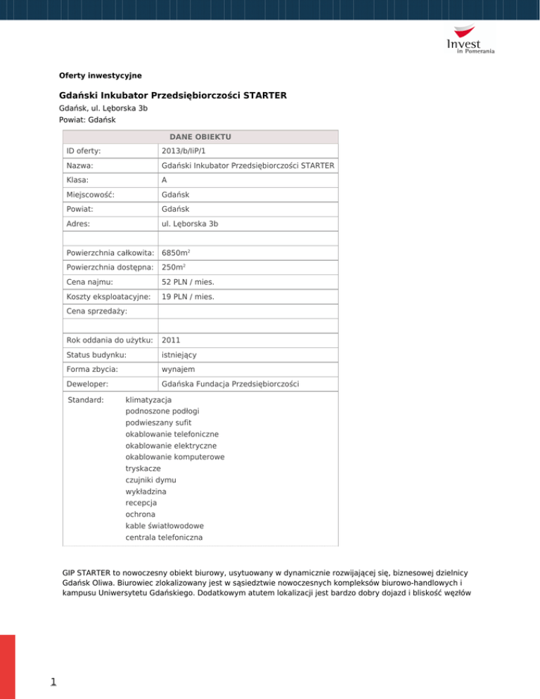 Oferty inwestycyjne Gdański Inkubator Przedsiębiorczości STARTER Gdańsk, ul. Lęborska 3b Powiat: Gdańsk DANE OBIEKTU ID oferty: 2013/b/IiP/1 Nazwa: Gdański Inkubator Przedsiębiorczości STARTER Klasa: A Miejscowość: Gdańsk Powiat: Gdańsk Adres: ul. Lęborska 3b Powierzchnia całkowita: 6850m2 Powierzchnia dostępna: 250m2 Cena najmu: 52 PLN / mies. Koszty eksploatacyjne: 19 PLN / mies. Cena sprzedaży: Rok oddania do użytku: 2011 Status budynku: istniejący Forma zbycia: wynajem Deweloper: Gdańska Fundacja Przedsiębiorczości Standard: klimatyzacja podnoszone podłogi podwieszany sufit okablowanie telefoniczne okablowanie elektryczne okablowanie komputerowe tryskacze czujniki dymu wykładzina recepcja ochrona kable światłowodowe centrala telefoniczna GIP STARTER to nowoczesny obiekt biurowy, usytuowany w dynamicznie rozwijającej się, biznesowej dzielnicy Gdańsk Oliwa. Biurowiec zlokalizowany jest w sąsiedztwie nowoczesnych kompleksów biurowo-handlowych i kampusu Uniwersytetu Gdańskiego. Dodatkowym atutem lokalizacji jest bardzo dobry dojazd i bliskość węzłów 1 komunikacji publicznej. Budynek przeznaczony jest na działalność wspierającą start-upy jak i na wynajem powierzchni dla klientów komercyjnych. Znajduje się w nim również nowoczesne przedszkole, lunch-bar oraz centrum komferencyjno-szkoleniowe, w tym m. in. innowacyjny Crazy Room, dostępny bezpłatnie dla pracowników firm zlokalizowanych w biurowcu. W celu uzyskania szczegółowych informacji prosimy o kontakt: Anton Koval, tel.: +48 58 32 33 240, email: [email protected] Ostatnia aktualizacja: lipiec, 2016 Galeria zdjęć: 2