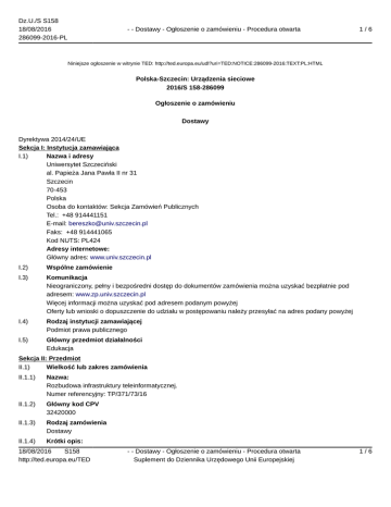 Dz.U./S S158 18/08/2016 286099-2016-PL - - Dostawy - Ogłoszenie o zamówieniu - Procedura otwarta 1/6 Niniejsze ogłoszenie w witrynie TED: http://ted.europa.eu/udl?uri=TED:NOTICE:286099-2016:TEXT:PL:HTML Polska-Szczecin: Urządzenia sieciowe 2016/S 158-286099 Ogłoszenie o zamówieniu Dostawy Dyrektywa 2014/24/UE Sekcja I: Instytucja zamawiająca I.1) Nazwa i adresy Uniwersytet Szczeciński al. Papieża Jana Pawła II nr 31 Szczecin 70-453 Polska Osoba do kontaktów: Sekcja Zamówień Publicznych Tel.: +48 914441151 E-mail: [email protected] Faks: +48 914441065 Kod NUTS: PL424 Adresy internetowe: Główny adres: www.univ.szczecin.pl I.2) Wspólne zamówienie I.3) Komunikacja Nieograniczony, pełny i bezpośredni dostęp do dokumentów zamówienia można uzyskać bezpłatnie pod adresem: www.zp.univ.szczecin.pl Więcej informacji można uzyskać pod adresem podanym powyżej Oferty lub wnioski o dopuszczenie do udziału w postępowaniu należy przesyłać na adres podany powyżej I.4) Rodzaj instytucji zamawiającej Podmiot prawa publicznego I.5) Główny przedmiot działalności Edukacja Sekcja II: Przedmiot II.1) Wielkość lub zakres zamówienia II.1.1) Nazwa: Rozbudowa infrastruktury teleinformatycznej. Numer referencyjny: TP/371/73/16 II.1.2) Główny kod CPV 32420000 II.1.3) Rodzaj zamówienia Dostawy II.1.4) Krótki opis: 18/08/2016 S158 http://ted.europa.eu/TED - - Dostawy - Ogłoszenie o zamówieniu - Procedura otwarta Suplement do Dziennika Urzędowego Unii Europejskiej 1/6 Dz.U./S S158 18/08/2016 286099-2016-PL - - Dostawy - Ogłoszenie o zamówieniu - Procedura otwarta 2/6 Rozbudowa infrastruktury teleinformatycznej w ramach inwestycji pn. Przebudowa istniejącego budynku nr 4 wraz z przebudową i rozbudową infrastruktury technicznej i zagospodarowania terenu w Kampusie US przy al. Piastów 40B w Szczecinie zgodnie z umową nr 1415 z 13 czerwca 2014 r. II.1.5) Szacunkowa całkowita wartość II.1.6) Informacje o częściach To zamówienie podzielone jest na części: nie II.2) Opis II.2.1) Nazwa: II.2.2) Dodatkowy kod lub kody CPV II.2.3) Miejsce świadczenia usług Kod NUTS: PL424 Główne miejsce lub lokalizacja realizacji: Szczecin, al. Piastów 40B. II.2.4) Opis zamówienia: Rozbudowa infrastruktury teleinformatycznej w ramach inwestycji pn. Przebudowa istniejącego budynku nr 4 wraz z przebudową i rozbudową infrastruktury technicznej i zagospodarowania terenu w Kampusie US przy al. Piastów 40B w Szczecinie zgodnie z umową nr 1415 z 13 czerwca 2014 r. LP przedmiot ilość 1 Macierz dyskowa 1 2 System archiwizacji. Biblioteka taśmowa + Taśmy 1 3 Stacja zarządzająca 3 4 Monitor 3 5 Macierz Dyskowa SAN 1 6 Szafy teleinformatyczne serwerowe 3 7 Serwery 6 8 AP 16 9 Konsola zarządzająca do montażu w szafie Rack 1 10 Przełącznik modularny (1 sztuka) 1 11 switch 4 12 Zasilacz awaryjny UPS 2. II.2.5) Kryteria udzielenia zamówienia Kryteria określone poniżej Kryterium jakości - Nazwa: Termin realizacji / Waga: 40 Cena - Waga: 60 II.2.6) Szacunkowa wartość II.2.7) Okres obowiązywania zamówienia, umowy ramowej lub dynamicznego systemu zakupów Okres w dniach: 45 Niniejsze zamówienie podlega wznowieniu: nie II.2.10) Informacje o ofertach wariantowych Dopuszcza się składanie ofert wariantowych: nie II.2.11) Informacje o opcjach Opcje: nie II.2.12) Informacje na temat katalogów elektronicznych 18/08/2016 S158 http://ted.europa.eu/TED - - Dostawy - Ogłoszenie o zamówieniu - Procedura otwarta Suplement do Dziennika Urzędowego Unii Europejskiej 2/6 Dz.U./S S158 18/08/2016 286099-2016-PL - - Dostawy - Ogłoszenie o zamówieniu - Procedura otwarta II.2.13) Informacje o funduszach Unii Europejskiej Zamówienie dotyczy projektu/programu finansowanego ze środków Unii Europejskiej: nie II.2.14) Informacje dodatkowe 3/6 Sekcja III: Informacje o charakterze prawnym, ekonomicznym, finansowym i technicznym III.1) Warunki udziału III.1.1) Zdolność do prowadzenia działalności zawodowej, w tym wymogi związane z wpisem do rejestru zawodowego lub handlowego Wykaz i krótki opis warunków: 1) informacji z Krajowego Rejestru Karnego w zakresie określonym w art. 24 ust. 1 pkt 13, 14 i 21 PZP, wystawionej nie wcześniej niż 6 miesięcy przed upływem terminu składania ofert; Wykluczenie wykonawcy następuje w przypadkach, o których mowa w art. 24 ust. 1 pkt 13 lit. a–c i pkt 14 PZP, gdy osoba, o której mowa w tych przepisach została skazana za przestępstwo wymienione w art. 24 ust. 1 pkt 13 lit. a–c, jeżeli nie upłynęło 5 lat od dnia uprawomocnienia się wyroku potwierdzającego zaistnienie jednej z podstaw wykluczenia, chyba że w tym wyroku został określony inny okres wykluczenia, zaś w przypadkach, o których mowa w art. 24 ust. 1 pkt 13 lit. d i pkt 14 PZP, gdy osoba, o której mowa w tych przepisach, została skazana za przestępstwo wymienione w art. 24 ust. 1 pkt 13 lit. d, PZP, lub jeżeli nie upłynęły 3 lata od dnia uprawomocnienia się wyroku potwierdzającego zaistnienie jednej z podstaw wykluczenia, chyba że w tym wyroku został określony inny okres wykluczenia; 2) odpisu z właściwego rejestru lub z centralnej ewidencji i informacji o działalności gospodarczej, jeżeli odrębne przepisy wymagają wpisu do rejestru lub ewidencji, w celu potwierdzenia braku podstaw wykluczenia na podstawie art. 24 ust. 5 pkt 1 PZP. 3) oświadczenia wykonawcy o braku wydania wobec niego prawomocnego wyroku sądu lub ostatecznej decyzji administracyjnej o zaleganiu z uiszczaniem podatków, opłat lub składek na ubezpieczenia społeczne lub zdrowotne albo – w przypadku wydania takiego wyroku lub decyzji – dokumentów potwierdzających dokonanie płatności tych należności wraz z ewentualnymi odsetkami lub grzywnami lub zawarcie wiążącego porozumienia w sprawie spłat tych należności. Wykluczenie wykonawcy następuje w przypadku, o którym mowa w art. 24 ust. 1 pkt 15 PZP, jeżeli nie upłynęły 3 lata od dnia odpowiednio uprawomocnienia się 