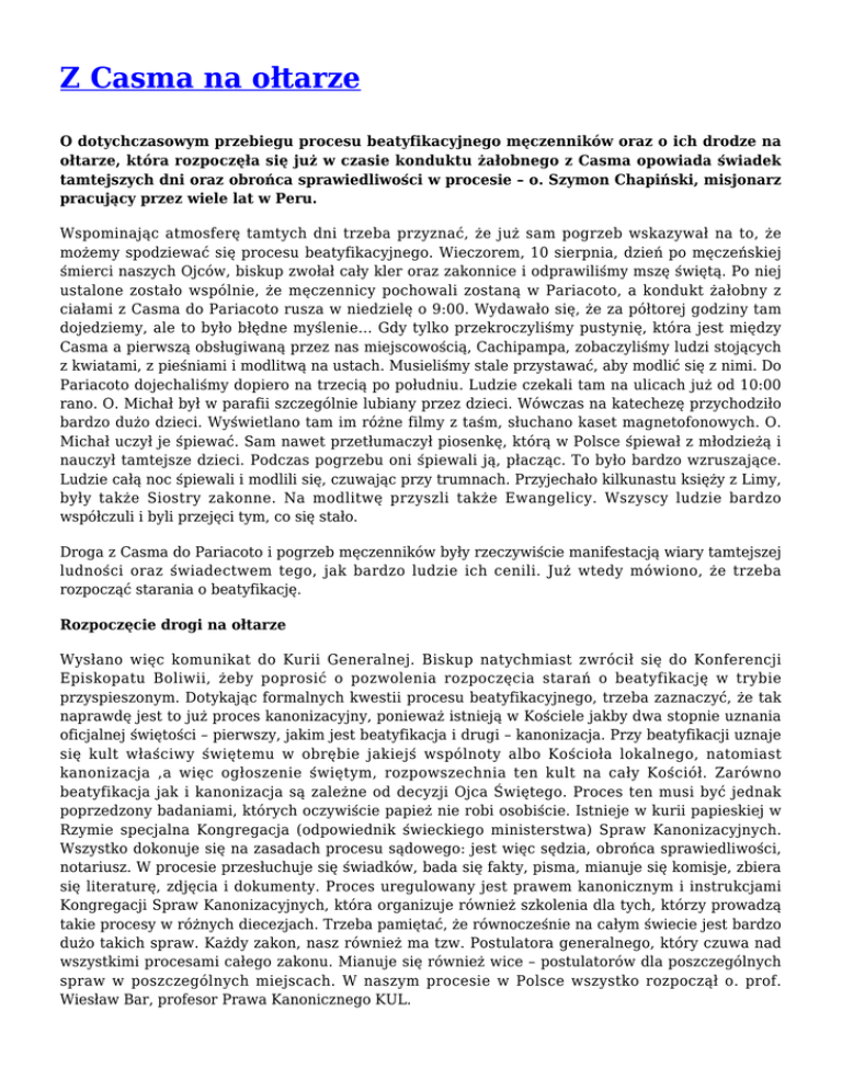 Z Casma na ołtarze O dotychczasowym przebiegu procesu beatyfikacyjnego męczenników oraz o ich drodze na ołtarze, która rozpoczęła się już w czasie konduktu żałobnego z Casma opowiada świadek tamtejszych dni oraz obrońca sprawiedliwości w procesie – o. Szymon Chapiński, misjonarz pracujący przez wiele lat w Peru. Wspominając atmosferę tamtych dni trzeba przyznać, że już sam pogrzeb wskazywał na to, że możemy spodziewać się procesu beatyfikacyjnego. Wieczorem, 10 sierpnia, dzień po męczeńskiej śmierci naszych Ojców, biskup zwołał cały kler oraz zakonnice i odprawiliśmy mszę świętą. Po niej ustalone zostało wspólnie, że męczennicy pochowali zostaną w Pariacoto, a kondukt żałobny z ciałami z Casma do Pariacoto rusza w niedzielę o 9:00. Wydawało się, że za półtorej godziny tam dojedziemy, ale to było błędne myślenie… Gdy tylko przekroczyliśmy pustynię, która jest między Casma a pierwszą obsługiwaną przez nas miejscowością, Cachipampa, zobaczyliśmy ludzi stojących z kwiatami, z pieśniami i modlitwą na ustach. Musieliśmy stale przystawać, aby modlić się z nimi. Do Pariacoto dojechaliśmy dopiero na trzecią po południu. Ludzie czekali tam na ulicach już od 10:00 rano. O. Michał był w parafii szczególnie lubiany przez dzieci. Wówczas na katechezę przychodziło bardzo dużo dzieci. Wyświetlano tam im różne filmy z taśm, słuchano kaset magnetofonowych. O. Michał uczył je śpiewać. Sam nawet przetłumaczył piosenkę, którą w Polsce śpiewał z młodzieżą i nauczył tamtejsze dzieci. Podczas pogrzebu oni śpiewali ją, płacząc. To było bardzo wzruszające. Ludzie całą noc śpiewali i modlili się, czuwając przy trumnach. Przyjechało kilkunastu księży z Limy, były także Siostry zakonne. Na modlitwę przyszli także Ewangelicy. Wszyscy ludzie bardzo współczuli i byli przejęci tym, co się stało. Droga z Casma do Pariacoto i pogrzeb męczenników były rzeczywiście manifestacją wiary tamtejszej ludności oraz świadectwem tego, jak bardzo ludzie ich cenili. Już wtedy mówiono, że trzeba rozpocząć starania o beatyfikację. Rozpoczęcie drogi na ołtarze Wysłano więc komunikat do Kurii Generalnej. Biskup natychmiast zwrócił się do Konferencji Episkopatu Boliwii, żeby poprosić o pozwolenia rozpoczęcia starań o beatyfikację w trybie przyspieszonym. Dotykając formalnych kwestii procesu beatyfikacyjnego, trzeba zaznaczyć, że tak naprawdę jest to już proces kanonizacyjny, ponieważ istnieją w Kościele jakby dwa stopnie uznania oficjalnej świętości – pierwszy, jakim jest beatyfikacja i drugi – kanonizacja. Przy beatyfikacji uznaje się kult właściwy świętemu w obrębie jakiejś wspólnoty albo Kościoła lokalnego, natomiast kanonizacja ,a więc ogłoszenie świętym, rozpowszechnia ten kult na cały Kościół. Zarówno beatyfikacja jak i kanonizacja są zależne od decyzji Ojca Świętego. Proces ten musi być jednak poprzedzony badaniami, których oczywiście papież nie robi osobiście. Istnieje w kurii papieskiej w Rzymie specjalna Kongregacja (odpowiednik świeckiego ministerstwa) Spraw Kanonizacyjnych. Wszystko dokonuje się na zasadach procesu sądowego: jest więc sędzia, obrońca sprawiedliwości, notariusz. W procesie przesłuchuje się świadków, bada się fakty, pisma, mianuje się komisje, zbiera się literaturę, zdjęcia i dokumenty. Proces uregulowany jest prawem kanonicznym i instrukcjami Kongregacji Spraw Kanonizacyjnych, która organizuje również szkolenia dla tych, którzy prowadzą takie procesy w różnych diecezjach. Trzeba pamiętać, że równocześnie na całym świecie jest bardzo dużo takich spraw. Każdy zakon, nasz również ma tzw. Postulatora generalnego, który czuwa nad wszystkimi procesami całego zakonu. Mianuje się również wice – postulatorów dla poszczególnych spraw w poszczególnych miejscach. W naszym procesie w Polsce wszystko rozpoczął o. prof. Wiesław Bar, profesor Prawa Kanonicznego KUL. Istnieją dwa rodzaje procesów kanonizacyjnych. Od najdawniejszych czasów za świętych uznawano męczenników – tych, którzy oddali życie za Chrystusa – oraz wyznawców, czyli ludzi, którzy wyznawali wiarę chrześcijańską, żyli według Ewangelii i według kryteriów teologiczno – moralnych osiągnęli świętość. W przypadku procesu Franciszkanów z Pariacoto chodzi o męczeństwo. W procesie należy więc stwierdzić, że rzeczywiście zginęli oni z powodu nienawiści do wiary, albo do Kościoła, albo do Boga. Wiele miejsc, jeden proces Wspomniany już O. Wiesław. Bar przygotował wszystkie dokumenty i przyjechał z nimi do Peru. 9 sierpnia 1996 w rocznicę śmierci, na uroczystej sesji w Pariacoto, otwarto proces kanonizacyjny. Równocześnie poproszono arcybiskupa Krakowa, aby otworzyć proces lokalny. Proces lokalny rozpoczęto również w Bergamo, skąd pochodził trzeci męczennik – o. Alessandro Dordi, który zginął kilkanaście dni później, w innym miejscu, ale w tej samej diecezji. Zabili go także ci sami ludzie, o czym świadczą pozostawione ślady oraz świadkowie wydarzenia. Trzeci trybunał procesu znajdował w Peru. Wielość miejsc spowodowana jest tym, że choć męczeństwo dokonało się w Pariacoto, męczennicy żyli wcześniej w innych miejscach – o. Alessandro we Włoszech a o. Michał i o. Zbigniew w Polsce. Należy przeprowadzić badania także co do ich wcześniejszego życia, potwierdzić, że byli dobrymi, przykładnymi chrześcijanami. W Polsce wyznaczeni przez arcybiskupa zakonnicy działali zarówno w Krakowie jak i na różnych sesjach wyjazdowych – w Rychwałdzie – bo z tych okolic pochodził o. Michał – w Pieńsku, – ponieważ tam pracował jako katecheta i wikary – w Legnicy, gdzie o. Zbigniew był wicerektorem Niższego Seminarium Duchownego. Wszystkie dokumentacje zostały poprawnie sporządzone i trzeba było je wszystkie przetłumaczyć – na j