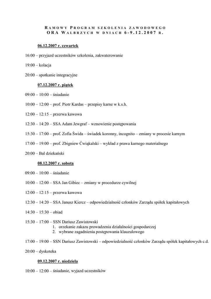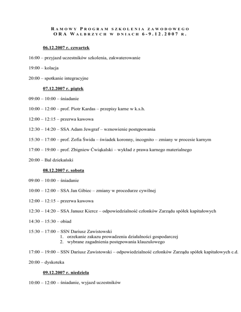 RAMOWY PROGRAM ORA WAŁBRZYCH SZKOLENIA ZAWODOWEGO W DNIACH 6-9.12.2007 R. 06.12.2007 r. czwartek 16:00 – przyjazd uczestników szkolenia, zakwaterowanie 19:00 – kolacja 20:00 – spotkanie integracyjne 07.12.2007 r. piątek 09:00 – 10:00 – śniadanie 10:00 – 12:00 – prof. Piotr Kardas – przepisy karne w k.s.h. 12:00 – 12:15 – przerwa kawowa 12:30 – 14:20 – SSA Adam Jewgraf – wznowienie postępowania 15:30 – 17:00 – prof. Zofia Świda – świadek koronny, incognito – zmiany w procesie karnym 17:00 – 19:00 – prof. Zbigniew Ćwiąkalski – wykład z prawa karnego materialnego 20:00 – Bal dziekański 08.12.2007 r. sobota 09:00 – 10:00 – śniadanie 10:00 – 12:00 – SSA Jan Gibiec – zmiany w procedurze cywilnej 12:00 – 12:15 – przerwa kawowa 12:30 – 14:20 – SSA Janusz Kiercz – odpowiedzialność członków Zarządu spółek kapitałowych 14:30 – 15:30 – obiad 15:30 – 17:00 – SSN Dariusz Zawistowski 1. orzekanie zakazu prowadzenia działalności gospodarczej 2. wybrane zagadnienia postępowania klauzulowego 17:00 – 19:00 – SSN Dariusz Zawistowski – odpowiedzialność członków Zarządu spółek kapitałowych c.d. 20:00 – dyskoteka 09.12.2007 r. niedziela 10:00 – 12:00 – śniadanie, wyjazd uczestników Koszty udziału uczestników w szkoleniu: Adwokaci z ORA Wałbrzych: 1. pokój 1 – osobowy – 600 zł 2. pokój 2 – osobowy – 350 zł Adwokaci z izb sąsiednich: 1. pokój 1 – osobowy – 700 zł 2. pokój 2 – osobowy – 500 zł Aplikanci z ORA Wałbrzych – 300 zł Dla uczestników (adwokatów z ORA Wałbrzych) nie korzystających z noclegów i wyŜywienia: wykłady - 150 zł bal - 100 zł Szkolenie odbędzie się w hotelu „Bornit” w Szklarskiej Porębie, o wysokim standardzie(www.interferie.pl). W hotelu znajduje się basen, bilard, dyskoteka, kręgle, pakiet SPA&Wellness. Szczegółowy program szkolenia zostanie podany do 15 listopada 2007 r. Przypominamy, Ŝe obowiązek uczestnictwa w szkoleniu dla adwokatów i aplikantów adwokackich wynika z uchwały nr 39/2006 Naczelnej Rady Adwokackiej z dnia 25 marca 2006 r. ORA w Wałbrzychu