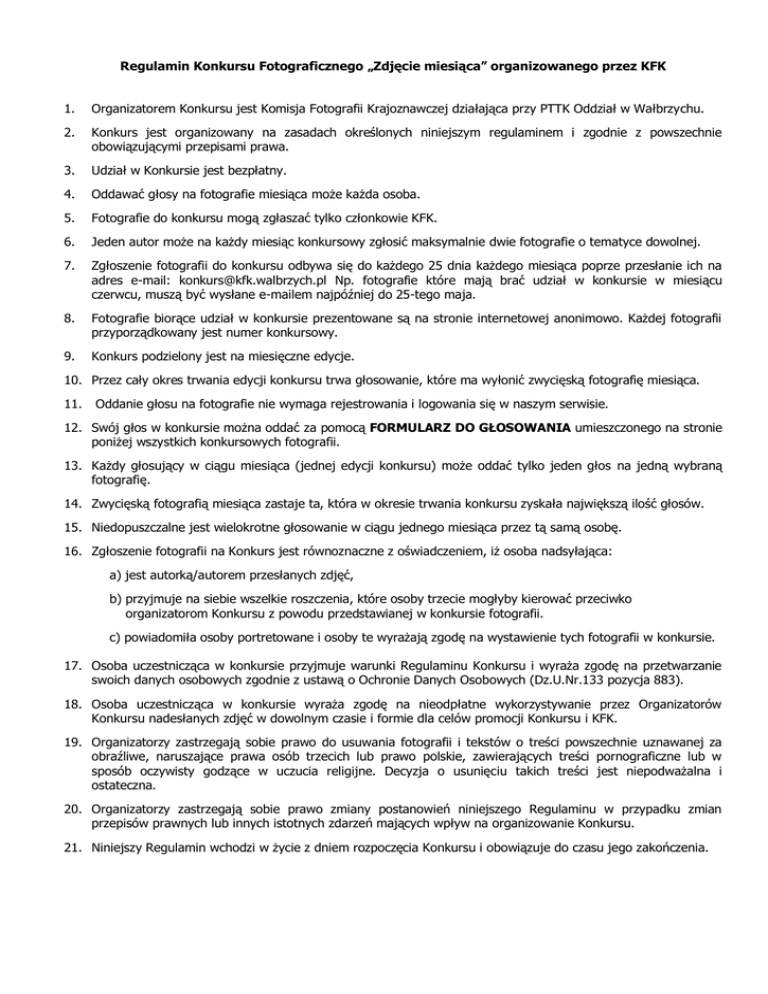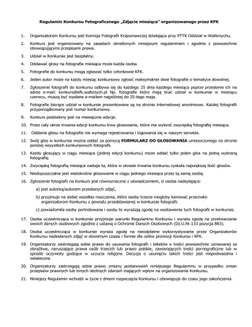 Regulamin Konkursu Fotograficznego „Zdjęcie miesiąca” organizowanego przez KFK 1. Organizatorem Konkursu jest Komisja Fotografii Krajoznawczej działająca przy PTTK Oddział w Wałbrzychu. 2. Konkurs jest organizowany na zasadach określonych niniejszym regulaminem i zgodnie z powszechnie obowiązującymi przepisami prawa. 3. Udział w Konkursie jest bezpłatny. 4. Oddawać głosy na fotografie miesiąca może każda osoba. 5. Fotografie do konkursu mogą zgłaszać tylko członkowie KFK. 6. Jeden autor może na każdy miesiąc konkursowy zgłosić maksymalnie dwie fotografie o tematyce dowolnej. 7. Zgłoszenie fotografii do konkursu odbywa się do każdego 25 dnia każdego miesiąca poprze przesłanie ich na adres e-mail: [email protected] Np. fotografie które mają brać udział w konkursie w miesiącu czerwcu, muszą być wysłane e-mailem najpóźniej do 25-tego maja. 8. Fotografie biorące udział w konkursie prezentowane są na stronie internetowej anonimowo. Każdej fotografii przyporządkowany jest numer konkursowy. 9. Konkurs podzielony jest na miesięczne edycje. 10. Przez cały okres trwania edycji konkursu trwa głosowanie, które ma wyłonić zwycięską fotografię miesiąca. 11. Oddanie głosu na fotografie nie wymaga rejestrowania i logowania się w naszym serwisie. 12. Swój głos w konkursie można oddać za pomocą FORMULARZ DO GŁOSOWANIA umieszczonego na stronie poniżej wszystkich konkursowych fotografii. 13. Każdy głosujący w ciągu miesiąca (jednej edycji konkursu) może oddać tylko jeden głos na jedną wybraną fotografię. 14. Zwycięską fotografią miesiąca zastaje ta, która w okresie trwania konkursu zyskała największą ilość głosów. 15. Niedopuszczalne jest wielokrotne głosowanie w ciągu jednego miesiąca przez tą samą osobę. 16. Zgłoszenie fotografii na Konkurs jest równoznaczne z oświadczeniem, iż osoba nadsyłająca: a) jest autorką/autorem przesłanych zdjęć, b) przyjmuje na siebie wszelkie roszczenia, które osoby trzecie mogłyby kierować przeciwko organizatorom Konkursu z powodu przedstawianej w konkursie fotografii. c) powiadomiła osoby portretowane i osoby te wyrażają zgodę na wystawienie tych fotografii w konkursie. 17. Osoba uczestnicząca w konkursie przyjmuje warunki Regulaminu Konkursu i wyraża zgodę na przetwarzanie swoich danych osobowych zgodnie z ustawą o Ochronie Danych Osobowych (Dz.U.Nr.133 pozycja 883). 18. Osoba uczestnicząca w konkursie wyraża zgodę na nieodpłatne wykorzystywanie przez Organizatorów Konkursu nadesłanych zdjęć w dowolnym czasie i formie dla celów promocji Konkursu i KFK. 19. Organizatorzy zastrzegają sobie prawo do usuwania fotografii i tekstów o treści powszechnie uznawanej za obraźliwe, naruszające prawa osób trzecich lub prawo polskie, zawierających treści pornograficzne lub w sposób oczywisty godzące w uczucia religijne. Decyzja o usunięciu takich treści jest niepodważalna i ostateczna. 20. Organizatorzy zastrzegają sobie prawo zmiany postanowień niniejszego Regulaminu w przypadku zmian przepisów prawnych lub innych istotnych zdarzeń mających wpływ na organizowanie Konkursu. 21. Niniejszy Regulamin wchodzi w życie z dniem rozpoczęcia Konkursu i obowiązuje do czasu jego zakończenia.