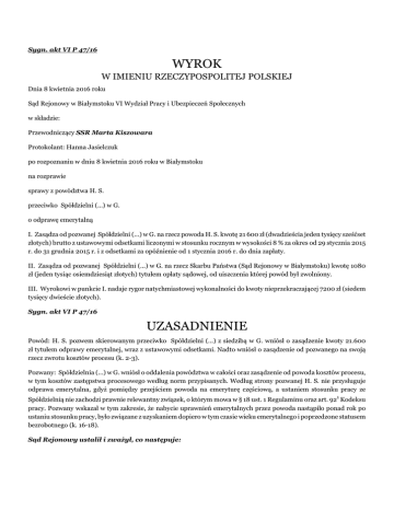Sygn. akt VI P 47/16 WYROK W IMIENIU RZECZYPOSPOLITEJ POLSKIEJ Dnia 8 kwietnia 2016 roku Sąd Rejonowy w Białymstoku VI Wydział Pracy i Ubezpieczeń Społecznych w składzie: Przewodniczący SSR Marta Kiszowara Protokolant: Hanna Jasielczuk po rozpoznaniu w dniu 8 kwietnia 2016 roku w Białymstoku na rozprawie sprawy z powództwa H. S. przeciwko Spółdzielni (...) w G. o odprawę emerytalną I. Zasądza od pozwanej Spółdzielni (...) w G. na rzecz powoda H. S. kwotę 21 600 zł (dwadzieścia jeden tysięcy sześćset złotych) brutto z ustawowymi odsetkami liczonymi w stosunku rocznym w wysokości 8 % za okres od 29 stycznia 2015 r. do 31 grudnia 2015 r. i z odsetkami za opóźnienie od 1 stycznia 2016 r. do dnia zapłaty. II. Zasądza od pozwanej Spółdzielni (...) w G. na rzecz Skarbu Państwa (Sąd Rejonowy w Białymstoku) kwotę 1080 zł (jeden tysiąc osiemdziesiąt złotych) tytułem opłaty sądowej, od uiszczenia której powód był zwolniony. III. Wyrokowi w punkcie I. nadaje rygor natychmiastowej wykonalności do kwoty nieprzekraczającej 7200 zł (siedem tysięcy dwieście złotych). Sygn. akt VI P 47/16 UZASADNIENIE Powód: H. S. pozwem skierowanym przeciwko Spółdzielni (...) z siedzibą w G. wniósł o zasądzenie kwoty 21.600 zł tytułem odprawy emerytalnej, wraz z ustawowymi odsetkami. Nadto wniósł o zasądzenie od pozwanego na swoją rzecz zwrotu kosztów procesu (k. 2-3). Pozwany: Spółdzielnia (...) w G. wniósł o oddalenia powództwa w całości oraz zasądzenie od powoda kosztów procesu, w tym kosztów zastępstwa procesowego według norm przypisanych. Według strony pozwanej H. S. nie przysługuje odprawa emerytalna, gdyż pomiędzy przejściem powoda na emeryturę częściową, a ustaniem stosunku pracy ze Spółdzielnią nie zachodzi prawnie relewantny związek, o którym mowa w § 18 ust. 1 Regulaminu oraz art. 921 Kodeksu pracy. Pozwany wskazał w tym zakresie, że nabycie uprawnień emerytalnych przez powoda nastąpiło ponad rok po ustaniu stosunku pracy, było związane z uzyskaniem dopiero w tym czasie wieku emerytalnego i poprzedzone statusem bezrobotnego (k. 16-18). Sąd Rejonowy ustalił i zważył, co następuje: H. S. był zatrudniony w Spółdzielni (...) z siedzibą w G.- Oddział Zakład Produkcji (...) w S. w okresie od 1 lutego 1973r. do 29 października 2013r., ostatnio na stanowisku Kierownika Wydziału Produkcji w S. (por. akta osobowe powoda). Bezspornie w ostatnim okresie zatrudnienia, tj. od 30 stycznia 2013r. H. S. stał się niezdolny do pracy z powodu choroby („nasilenie zaburzeń depresyjnych związanych głównie z sytuacją zawodową: stres, sesja, warunki pracy”por. zaświadczenie lekarskie- k. 8). Z tego powodu do końca czerwca 2013 roku przebywał na zwolnieniu lekarskim i pobierał zasiłek chorobowy. W związku z przedłużającą się niezdolnością do pracy w dniu 18 czerwca 2013r. powód wystąpił do Zakładu Ubezpieczeń Społecznych z wnioskiem o rentę z tytułu niezdolności do pracy. Po rozpoznaniu przedmiotowego wniosku (...) Oddział w B. Inspektorat w S. wydał decyzję z dnia 13 sierpnia 2013r., w której przyznał H. S. prawo do świadczenia rehabilitacyjnego na okres od 31 lipca 2013r. do 26 stycznia 2014r. (por. k. 7). Z dniem 29 października 2013r. z powodu pobierania zasiłku chorobowego (przez 182 dni) i świadczenia rehabilitacyjnego (przez 3 miesiące) Spółdzielnia (...) w G. rozwiązała z powodem umowę o pracę bez wypowiedzenia, stosując jako podstawę prawną art. 53 § 1 pkt. 1 k.p. (por. k. 6). Dnia 3 grudnia 2013r. powód wystąpił do Zakładu Ubezpieczeń Społecznych z wnioskiem o przyznanie uprawnień do świadczenia rehabilitacyjnego na dalszy okres (3 miesięcy). Decyzją z dnia 10 lutego 2014r. (...) Oddział w B. odmówił H. S. prawa do świadczenia rehabilitacyjnego od 27 stycznia 2014r. (k. 111/B akt osobowych). W związku z odmową przyznania świadczenia rehabilitacyjnego na dalszy okres powód zwrócił się do starosty (...) o uznanie za osobą bezrobotną i przyznanie zasiłku z tego tytułu. Status bezrobotnego i uprawnienia do zasiłku H. S. uzyskał decyzją z dnia 14 lutego 2014r. (por. k. 9). W dniu 19 grudnia 2014r. H. S. złożył w organie rentowym wniosek o przyznanie emerytury częściowej. Decyzją z dnia 23 stycznia 2015r. (...) Oddział w B. przyznał powodowi emeryturę częściową od dnia (...), tj. od osiągnięcia wieku uprawniającego do emerytury częściowej (por. k. 10). Okolicznością bezsporną pozostawało, że w okresie pomiędzy uzyskaniem statusy bezrobotnego, a przyznaniem uprawnień emerytalnych H. S. nie podejmował żadnego zatrudnienia i kontynuował leczenie z powodu zachorowania na depresję. Ze złożonego do akt sprawy zaświadczenia lekarskiego z dnia 4 grudnia 2015r. sporządzonego przez lekarza psychiatrę- W. S. wynika, że na dzień jego wystawienia (tj. 04.12.2015r.): „Leczenie pacjenta jest kontynuowane. Pacjent wymaga dalszej terapii farmakologicznej, wsparcia terapeutycznego” (k. 8). Pismem z dnia 29 stycznia 2015r. powód wezwał pozwanego do wypłaty odprawy emerytalnej. Pozwany odmówił wypłaty żądanej przez powoda odprawy emerytalnej. W uzasadnieniu swojego stanowiska wskazał m.in., że „Rozwiązanie stosunku pracy nastąpiło z dniem 29.10.2013r. na podstawie Art. 53 § 1 pkt. 1 ppkt. b Kodeksu Pracy (por. pismo- k. 11). Sporne w niniejszej sprawie pozostawało, czy pozwany jest zobowiązany do wypłaty H. S. odprawy emerytalnej, o której mowa w art. art. 921 Kodeksu pracy. Zgodnie z art. 92( 1) § 1 k.p. pracownikowi spełniającemu warunki uprawniające do renty z tytułu niezdolności do pracy lub emerytury, którego stosunek pracy ustał w związku z przejściem na rentę lub emeryturę, przysługuje odprawa pieniężna w wysokości jednomiesięcznego wynagrodzenia. W świetle przytoczonej wyżej regulacji prawnej odprawa emerytalna przysługuje zatem pracownikowi po spełnieniu dwóch przesłanek, 