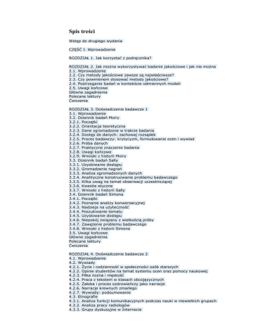 Spis treści Wstęp do drugiego wydania CZĘŚĆ I. Wprowadzenie ROZDZIAŁ 1. Jak korzystać z podręcznika? ROZDZIAŁ 2. Jak można wykorzystywać badanie jakościowe i jak nie można 2.1. Wprowadzenie 2.2. Czy metody jakościowe zawsze są najwłaściwsze? 2.3. Czy powinienem stosować metody jakościowe? 2.4. Postrzeganie badań w kontekście odmiennych modeli 2.5. Uwagi końcowe Główne zagadnienia Polecane lektury Ćwiczenia ROZDZIAŁ 3. Doświadczenie badawcze 1 3.1. Wprowadzenie 3.2. Dziennik badań Moiry 3.2.1. Początki 3.2.2. Orientacja teoretyczna 3.2.3. Dane zgromadzone w trakcie badania 3.2.4. Dostęp do danych: zachowaj rozsądek 3.2.5. Proces badawczy: krytycyzm, formułowanie ocen i wywiad 3.2.6. Próba danych 3.2.7. Praktyczne znaczenie badania 3.2.8. Uwagi końcowe 3.2.9. Wnioski z historii Moiry 3.3. Dziennik badań Sally 3.3.1. Uzyskiwanie dostępu 3.3.2. Gromadzenie nagrań 3.3.3. Analiza zgromadzonych danych 3.3.4. Analityczne konstruowanie problemu badawczego 3.3.5. Kilka uwag na temat obserwacji uczestniczącej 3.3.6. Kwestie etyczne 3.3.7. Wnioski z historii Sally 3.4. Dziennik badań Simona 3.4.1. Początki 3.4.2. Poznanie analizy konwersacyjnej 3.4.3. Nadzieja na użyteczność 3.4.4. Poszukiwanie tematu 3.4.5. Uzyskiwanie dostępu 3.4.6. Niepokój związany z wielkością próby 3.4.7. Zawężenie problemu badawczego 3.4.8. Wnioski z historii Simona 3.5. Uwagi końcowe Główne zagadnienia Polecane lektury Ćwiczenia ROZDZIAŁ 4. Doświadczenie badawcze 2 4.1. Wprowadzenie 4.2. Wywiady 4.2.1. Życie i codzienność w społeczności osób starszych 4.2.2. Opinie studentów na temat systemu ocen oraz pomocy naukowej 4.2.3. Piłka nożna i męskość 4.2.4. Praca z tekstem w klasach obcojęzycznych 4.2.5. Żałoba i proces ozdrowieńczy jako narracje 4.2.6. Narracje krewnych zmarłego 4.2.7. Wywiady: podsumowanie 4.3. Etnografie 4.3.1. Analiza funkcji komunikacyjnych podczas nauki w niewielkich grupach 4.3.2. Analiza pracy radiologów 4.3.3. Grupy dyskusyjne w Internecie 4.3.4. Etnografie: podsumowanie 4.4. Teksty 4.4.1. Analiza podręczników szkolnych do nauki religii 4.4.2. Kształt japońskiej "nowoczesności" 4.4.3. Medykalizacja ciała kobiety w średnim wieku w XX stuleciu 4.4.4. Obraz "zbrodni" w lokalnej prasie 4.4.5. "Dyskurs przedsiębiorstwa" w szkolnictwie wyższym 4.4.6. Teksty: podsumowanie 4.5. Nagrania audio 5.5.1. Spotkania grupowe w hospicjach 5.5.2. Asymetria w interakcjach między osobami, dla których angielski jest językiem ojczystym, a obcokrajowcami 4.5.3. Nagrania audio: podsumowanie 4.6. Nagrania wideo 4.6.1. Komunikacja werbalna, tekstowa oraz wizualna widoczna na pulpicie w trakcie wideokonferencji 4.6.2. Wczesne interakcje między matką a dzieckiem 4.6.3. Tworzenie tożsamości etnicznej przez hiszpańskich imigrantów w Londynie 4.6.4. Jak "doświadczenie kobiecości" jest przedstawiane i problemtyzowane w telewizji 4.6.5. Nagrania wideo: podsumowanie 4.7. Połączenie metod 4.7.1. Jak rekonstruowane są teksty 4.7.2. Botswańskie kobiety w życiu publicznym (od 1800 roku) 4.7.3. Amerykańskie występy taneczne w dobie powojennej 4.7.4. Jak kobiety odczuwają depresję 4.7.5. Połączenie metod: podsumowanie 4.8. Uwagi końcowe Główne zagadnienia Polecane lektury Ćwiczenia ROZDZIAŁ 5. Czy "oryginalność" ma znaczenie? 5.1. Wprowadzenie 5.2. Oryginalność 5.3. Zawodowcem być 5.4. Niezależna myśl krytyczna 5.4.1. Rozwój pojęcia i/lub metodologii 5.4.2. Krytyczny stosunek do przyjętego podejścia 5.4.3. Wykorzystanie wcześniejszych badań 5.4.4. Gotowość do zmiany obranego kierunku 5.5. Uwagi końcowe Główne zagadnienia Polecane lektury Ćwiczenia CZĘŚĆ II. Początek ROZDZIAŁ 6. Wybór tematu 6.1. Wprowadzenie 6.2. Uproszczony indukcjonizm 6.3. Strategia nadmiaru: "brać wszystko, co się nadarzy" 6.4. Wielki teoretyk 6.5. Strategie właściwe dla indukcjonistów ze skłonnością do upraszczania 6.5.1. Korzystaj z pojęć 6.5.2. Rozwijaj wyniki innych badań 6.5.3. Wprowadź trzecią zmienną 6.6. Strategie właściwe dla zwolenników nadmiaru 6.6.1. Opracuj diagram 6.6.2. Znajdź łamigłówkę 6.6.3. Obiektyw o zmiennej ogniskowej 6.6.4. Ostrzeżenie: unikaj redukcjonizmu 6.7. Strategie właściwe dla wielkich teoretyków 6.7.1. Ignoruj mody 6.7.2. Znajdź dane 6.8. Strategie właściwe dla wszystkich badaczy 6.8.1. Ustal, jaki temat badania możesz podjąć 6.8.2. Dostrzeż sprzężenia zwrotne 6.8.3. Zrozum, że kategorie przesycone są teorią 6.9. Uwagi końcowe Główne zagadnienia Polecane lektury Ćwiczenia ROZDZIAŁ 7. Zastosowanie teorii 7.1. Wprowadzenie 7.2. Czym jest teoria? 7.3. Teorie, modele i hipotezy 7.4. Trochę przykładów 7.5. Uogólnienia i tworzenie teorii 7.6. Jak teoretyzować na podstawie danych 7.7. Uwagi końcowe Główne zagadnienia Polecane lektury Ćwiczenia ROZDZIAŁ 8. Wybór metodologii 8.1. Wprowadzenie 8.2. Twoja strategia badawcza 8.2.1. Wczesna decyzja 8.2.2. Powiązania między metodami, metodologiami a społeczeństwem 8.2.3. Modele kształtujące znaczenie metod 8.2.4. Wybór właściwej metody 8.3. Wybór metodologii: studium przypadku 8.3.1. Badanie doradztwa 8.3.2. Skrzywienie ilościowe 8.3.3. Planowanie metodologii: trzy znane możliwości 8.3.4. Przyjęta metodologia 8.3.5. Podsumowanie i wnioski 8.4. Dane niewywołane? 8.5. Połączenie metod? 8.6. Uwagi końcowe Główne zagadnienia Polecane lektury Ćwiczenia ROZDZIAŁ 9. Wybór przypadku 9.1. Wprowadzenie 9.2. Czym jest studium przypadku? 9.3. Tworzenie uogólnień na podstawie przypadków 9.4. Rodzaje studiów przypadków 9.5. Łączenie badań jakościowych ze wskaźnikami ilościowymi dotyczącymi populacji 9.6. Celowy dobór próby 9.7. Teoretyczny dobór próby 9.7.1. Wybór przypadków pod kątem teorii 9.7.2. Wybór przypadków "odchyleń" 9.7.3. Zmiana wielkości próby w trakcie badania 9.8. Możliwość tworzenia uogólnień na podstawie pojedynczego przypadku 9.9. Uwagi końcowe Główne zagadnieni