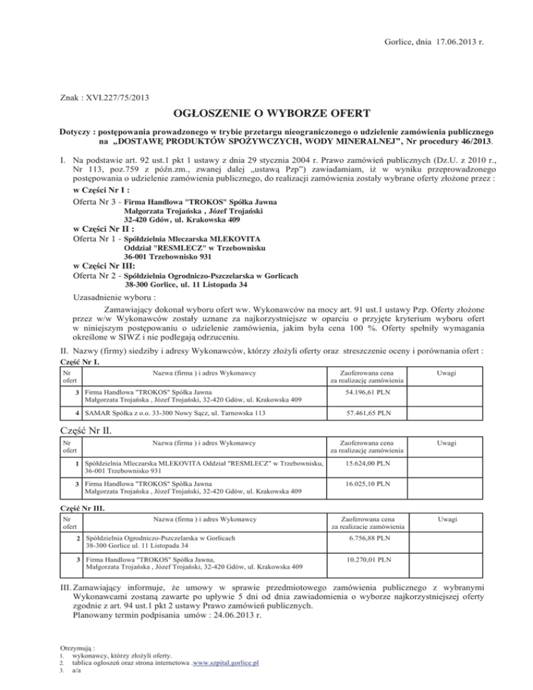 Gorlice, dnia 17.06.2013 r. Znak : XVI.227/75/2013 Dotyczy : post powania prowadzonego w trybie przetargu nieograniczonego o udzielenie zamówienia publicznego ! "#$%& ' ()*+,-.. na I. Na podstawie art. 92 ust.1 pkt 1 ustawy z dnia 29 stycznia 2004 r. Prawo zamówie publicznych (Dz.U. z 2010 r., Nr 113, poz.759 z pó n.zm., zwanej dalej „ustaw Pzp”) zawiadamiam, i w wyniku przeprowadzonego post powania o udzielenie zamówienia publicznego, do realizacji zamówienia zostały wybrane oferty zło one przez : w Cz ci Nr I : / 01 12%3"41 5 5 !6781 1421 179" :1;1 "<1=>81 6:$? "<1=>8/ .+@(+, %64 &3A 18"4>81 (,B 4 :CD#/ E !67%:/$32/1 3$#:1 >81 %%:/17 5 54 .)@,,- :$G"42/>8" B.- 4 :CD#/ F :$G"42/>8& E !67%:/$32/1 9 "%2/#:"@ >:#:$31 >81 4 .I@.,, " 3/#$ &3A -- />;"!1%1 .( " 3/#1#H Uzasadnienie wyboru : Zamawiaj cy dokonał wyboru ofert ww. Wykonawców na mocy art. 91 ust.1 ustawy Pzp. Oferty zło one przez w/w Wykonawców zostały uznane za najkorzystniejsze w oparciu o przyj te kryterium wyboru ofert w niniejszym post powaniu o udzielenie zamówienia, jakim była cena 100 %. Oferty spełniły wymagania okre lone w SIWZ i nie podlegaj odrzuceniu. II. Nazwy (firmy) siedziby i adresy Wykonawców, którzy zło yli oferty oraz streszczenie oceny i porównania ofert : :CDJ A Nr ofert Nazwa (firma ) i adres Wykonawcy Zaoferowana cena za realizacj zamówienia 3 Firma Handlowa "TROKOS" Spółka Jawna Małgorzata Troja ska , Józef Troja ski, 32-420 Gdów, ul. Krakowska 409 54.196,61 PLN 4 SAMAR Spółka z o.o. 33-300 Nowy S cz, ul. Tarnowska 113 57.461,65 PLN Cz Uwagi Nr II. Nr ofert Nazwa (firma ) i adres Wykonawcy Zaoferowana cena za realizacj zamówienia 1 Spółdzielnia Mleczarska MLEKOVITA Oddział "RESMLECZ" w Trzebownisku, 36-001 Trzebownisko 931 15.624,00 PLN 3 Firma Handlowa "TROKOS" Spółka Jawna Małgorzata Troja ska , Józef Troja ski, 32-420 Gdów, ul. Krakowska 409 16.025,10 PLN Cz Uwagi Nr III. Nr ofert Nazwa (firma ) i adres Wykonawcy 2 Spółdzielnia Ogrodniczo-Pszczelarska w Gorlicach 38-300 Gorlice ul. 11 Listopada 34 3 Firma Handlowa "TROKOS" Spółka Jawna, Małgorzata Troja ska , Józef Troja ski, 32-420 Gdów, ul. Krakowska 409 Zaoferowana cena za realizacj zamówienia Uwagi 6.756,88 PLN 10.270,01 PLN III. Zamawiaj cy informuje, e umowy w sprawie przedmiotowego zamówienia publicznego z wybranymi Wykonawcami zostan zawarte po upływie 5 dni od dnia zawiadomienia o wyborze najkorzystniejszej oferty zgodnie z art. 94 ust.1 pkt 2 ustawy Prawo zamówie publicznych. Planowany termin podpisania umów : 24.06.2013 r. Otrzymuj : wykonawcy, którzy zło yli oferty. tablica ogłosze oraz strona internetowa .www.szpital.gorlice.pl a/a 1. 2. 3.