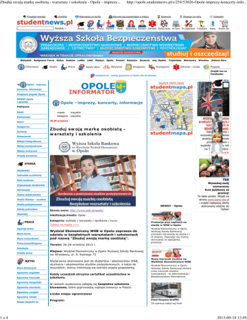 Zbuduj swoją markę osobistą - warsztaty i szkolenia - Opole - imprezy... 1z4 Przegląd newsów Białystok Uczelnie Bydgoszcz-Toruń Informator Rekrutacja na studia Kierunki wg przedmiotów z matury Szukaj ›› Studia Języki Praca Kariera Kasa Kielce Lublin Łódź Olsztyn Opole Poznań Kraków Studia Praca Języki obce http://opole.studentnews.pl/s/254/53026-Opole-imprezy-koncerty-info... Konkursy Wyjazdy na narty Studentka Student Zdrowie Świat nauki Hi-Tech Po zajęciach Turystyka Rzeszów Aktywnie Szczecin Knajpowo woj. śląskie Trójmiasto Noclegowo Warszawa Zdrowie i uroda Narty Active Jet Zielona Góra Pogoda Znajdź nas na Facebooku zestawienie - szkoły językowe w Opolu dla studentów Student MAPA Opole Opole - imprezy, Wrocław Sylwester studentnews.pl Lubię to! koncerty, informacje 1.668 osób lubi obiekt studentnews.pl. Prognoza pogody Opole NEWSY Opole i opolskie Opole - imprezy, koncerty, informacje Podręczne Banki Bankomaty miasto kategoria WORK UK - płatne praktyki w hotelach i restauracjach w Wielkiej Brytanii. Zakwaterowanie | wyżywienie | szkolenie praktyczno–językowe przed wyjazdem | wyjazdy przez cały rok na 3 – 12 miesięcy. Więcej>>> 26-28 września Ksero Księgarnie Kurierzy Kwiaciarnie Zbuduj swoją markę osobistą warsztaty i szkolenia Sklepy fotograficzne Sklepy komputerowe Sklepy muzyczne Urzędy pocztowe STUDIA W tyczka społecznościowa Facebooka Akademiki Jednostki uczelniane TEE Koła naukowe Organizacje studenckie Samorządy Studia doktoranckie Studia Olsztyn - uczelnie Studia podyplomowe NEWSY - Opole Szkoły policealne Strona www: http://www.wsb.pl/opole/ Wydziały lokalizacja;miasto: Opole PRACA Agencje pracy Biura karier Biura rachunkowe Firmy konsultingowe Szkolenia Urzędy pracy JĘZYKI Biura tłumaczeń Egzaminy angielski Egzaminy francuski Egzaminy hiszpański Egzaminy niemiecki Egzaminy rosyjski Egzaminy włoski Nauka języków za kategoria: wykłady / warsztaty / spotkania / kursy Zobacz na mapie >>> Wydział Ekonomiczny WSB w Opolu zaprasza do udziału w bezpłatnych warsztatach i szkoleniach pod nazwą "Zbuduj swoją markę osobistą". Termin: 26-28 września 2013 r. Wyszukaj swój wymarzony kurs językowy za granicą! To takie proste. Wejdź na stronę www.kursy.tee.pl i znajdź najlepszą ofertę skierowaną właśnie do Ciebie! Promocja przy zapisach na studia w WSB w Opolu Wydział Ekonomiczny w Opolu Wyższej Szkoły Bankowej prowadzi rekrutację na studia I i II stopnia. Zapisując się można skorzystać ze specjalnej promocji. Miejsce: Wydział Ekonomiczny w Opolu Wyższej Szkoły Bankowej we Wrocławiu, ul. A. Kośnego 72 Wydarzenie skierowane jest do studentów i absolwentów WSB, słuchaczy i absolwentów studiów podyplomowych, a także do wszystkich, którzy interesują się szeroko pojętą gospodarką. Każdy uczestnik otrzyma certyfikat uczestnictwa w szkoleniu. Nowy kierunek studiów na Wydziale Ekonomicznym WSB Wydział Ekonomiczny w Opolu Wyższej Szkoły Bankowej otwiera nowy kierunek studiów licencjackich - to Administracja i Bezpieczeństwo Wewnętrzne. W ramach wydarzenia odbędą się bezpłatne szkolenia biznesowe, które poprowadzą najlepsi trenerzy w Polsce. Liczba miejsc ograniczona! Program: Finał Oczyma Graffiti 29 czerwca odbył się finał 2013-09-18 12:05 Zbuduj swoją markę osobistą - warsztaty i szkolenia - Opole - imprezy... 2z4 http://opole.studentnews.pl/s/254/53026-Opole-imprezy-koncerty-info... granicą - organizatorzy konkursu Oczyma Graffiti. Start: godzina 17.00 w Wyższej Szkole•Bankowej w Opolu. Studenci w Polsce • Patronaty medialne O nas - reklama About us - advertising • Kontakt • Zaloguj się Szkoły językowe w Opolu 26 września 2013 r. Testy językowe AKTYWNIE Biura podróży Sklepy sportowe Dyscypliny 17.00 – 17.15 – rejestracja i powitanie 17.15- 19.00 - Formularz zapisów Metody aktywizujące grupę w pracy pedagogicznej - Halina Oster Ostatnie zmiany w przepisach Kodeksu Pracy – Tomasz Krzemienowski Aerokluby 27 września 2013 r. Akrobatyka sportowa 17.00- 19.00 - Formularz zapisów Badminton Fitness Golf Nowości w zamówieniach publicznych – Barbara Rokosz How to survive a meeting in English – Stephen Branigan – native speaker BIZNESLINGUA – Centrum Języków Obcych Jachty 28 września 2013 r. Jazda konna 9.00- 16.45 - Formularz zapisów Nauka jazdy Narty, snowboard Nurkowanie Sport uczelniany Sztuki walki Motywem przewodnim były książki, a na autobusach zagościli bohaterowie literaccy. 9.00 - 10.30 - Dress Code- jaki strój do Pracy 10.45 – 12.15 - Praca z autobiografią jako twórcze wyzwanie – dr Joanna Wawrzyniak 13.00 – 14.30 - Co wpływa na Twój profesjonalizm – Małgorzata Wojciechowska 14.45 - 16.15 - Zmiany w Podatkach – Krzysztof Kańdut 3 Art Festival W ostatni weekend czerwca Fundacja Rozwój zaprasza na III edycję 3 Art Festival. "Setka z HAKiem 2013" zakończona 127 – tyle osób wystartowało w XIX Ogólnopolskim, Ekstremalnym Rajdzie Pieszym "Setka z HAKiem 2013", organizowanym przez Harcerski Akademicki Krąg "HAKI" im. Bohaterów spod Monte Cassino. Tenis ziemny Żeglarstwo Żegluga KNAJPOWO Knajpy Bary Puby i kawiarnie Restauracje i pizzerie Nabór do programu „Ambasador Capgemini” Kluby studenckie Trwa nabór do programu „Ambasador Capgemini”. Inicjatywa jest skierowana do studentów II, III i IV roku z krakowskich, katowickich oraz opolskich uczelni wyższych. Stając się Ambasadorami Capgemini, wybrani studenci będą mieli możliwość nabycia kompetencji niezbędnych do funkcjonowania w międzynarodowym środowisku specjalistów oraz rozwoju umiejętności praktycznych, które pomogą zwiększyć ich konkurencyjność na rynku pracy. Rekreacyjnie Bilard Kręgielnie Coolturalnie Kina Kultura studencka Teatr i sceny muzyczne NOCLEGOWO Noclegi Hostele Hotele Kempingi Ośrodki wypoczynkowe Studio Dźwięku zaprasza na koncerty Pola namiotowe Studio Dźwięku po raz kolejny zaprasza zespoły z ca