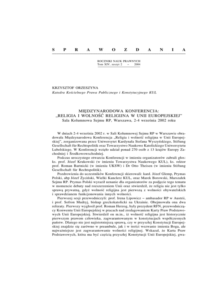 S P R A W O Z D A N I A ___________________________________________________________ ROCZNIKI NAUK PRAWNYCH Tom XIV, zeszyt 2 − 2004 KRZYSZTOF ORZESZYNA Katedra Kościelnego Prawa Publicznego i Konstytucyjnego KUL MIE˛DZYNARODOWA KONFERENCJA: „RELIGIA I WOLNOŚĆ RELIGIJNA W UNII EUROPEJSKIEJ” Sala Kolumnowa Sejmu RP, Warszawa, 2-4 września 2002 roku W dniach 2-4 września 2002 r. w Sali Kolumnowej Sejmu RP w Warszawie obradowała Mie˛dzynarodowa Konferencja „Religia i wolność religijna w Unii Europejskiej”, zorganizowana przez Uniwersytet Kardynała Stefana Wyszyńskiego, Stiftung Gesellschaft für Rechtspolitik oraz Towarzystwo Naukowe Katolickiego Uniwersytetu Lubelskiego. W Konferencji wzie˛ło udział ponad 270 osób z 13 krajów Europy Zachodniej i Środkowowschodniej. Podczas uroczystego otwarcia Konferencji w imieniu organizatorów zabrali głos: ks. prof. Józef Krukowski (w imieniu Towarzystwa Naukowego KUL), ks. rektor prof. Roman Bartnicki (w imieniu UKSW) i Dr Otto Theisen (w imieniu Stiftung Gesellschaft für Rechtspolitik). Pozdrowienia do uczestników Konferencji skierowali: kard. Józef Glemp, Prymas Polski, abp Józef Życiński, Wielki Kanclerz KUL, oraz Marek Borowski, Marszałek Sejmu RP. Prymas Polski wyraził uznanie dla organizatorów za podje˛cie tego tematu w momencie debaty nad rozszerzeniem Unii oraz stwierdził, że religia nie jest tylko sprawa˛ prywatna, ˛ gdyż wolność religijna jest pierwsza˛ z wolności obywatelskich i sprawdzianem funkcjonowania innych wolności. Pierwszej sesji przewodniczyli: prof. Irena Lipowicz − ambasador RP w Austrii, i prof. Sofron Mudryj, biskup greckokatolicki na Ukrainie. Obejmowała ona dwa referaty. Pierwszy wygłosił prof. Roman Herzog, były prezydent RFN, przewodnicza˛ cy Konwentu Unii Europejskiej w pracach nad zredagowaniem Karty Praw Podstawowych Unii Europejskiej. Stwierdził on m.in., iż wolność religijna jest historycznie pierwszym prawem człowieka, zagwarantowanym w konstytucjach współczesnych państw. Dlatego nie jest najistotniejsza˛ sprawa, ˛ czy w przyszłej Konstytucji Europejskiej znajdzie sie˛ zarówno w preambule, jak i w treści wezwanie imienia Boga, ale najważniejsze jest zagwarantowanie wolności religijnej. Wskazał, że Karta Praw Podstawowych, która ma być cze˛ścia˛ przyszłej Konstytucji Unii Europejskiej, gwa- 246 SPRAWOZDANIA rantuje wolność sumienia i religii, stanowiac ˛ standard „praw fundamentalnych” dla wszystkich państw członkowskich. Bp Attilio Nicora, wiceprzewodniczacy ˛ Komisji Episkopatów Wspólnoty Europejskiej (Com. ECE), przedstawił referat „Religia i wolność religijna w Unii Europejskiej z punktu widzenia Stolicy Apostolskiej”. Opierajac ˛ sie˛ na przemówieniu papieża Jana Pawła II, stwierdził on, że Stolica Apostolska docenia proces zjednoczenia Europy, ale jednocześnie zwraca uwage˛, aby Unia Europejska nie odcinała sie˛ od chrześcijańskiego dziedzictwa narodów europejskich. Podczas sesji popołudniowej, której przewodniczył prof. Carl-Otto Lenz, generalny adwokat przy Trybunale Sprawiedliwości w Luksemburgu, wygłoszono dwa referaty. Prof. Marek Safjan, prezes Trybunału Konstytucyjnego RP, w referacie „Wolność religijna w konstytucjach państw europejskich” przedstawił pluralizm modeli konstytucyjnych dotyczacych ˛ pozycji prawnej Kościołów i innych zwiazków ˛ wyznaniowych w państwach europejskich na podstawie postanowień konstytucji i orzeczeń trybunałów konstytucyjnych. Wskazał on na modele państw wyznaniowych i świeckich oraz ewolucje˛ dokonujac ˛ a˛ sie˛ w ustawodawstwie i orzecznictwie konstytucyjnym, polegajac ˛ a˛ na przechodzeniu od rozwiazań ˛ skrajnych do umiarkowanych. Jako kolejny prelegent wystapił ˛ prof. Josef Isensee z Uniwersytetu w Bonn. W referacie „Caritas i diakonia w Europie” przedstawił relacje Kościół – państwo w zakresie działalności charytatywnej. Państwa świeckie zgodnie z zasada˛ subsydiarności wspomagaja˛ działalność charytatywna˛ i humanitarna˛ Kościołów, ponieważ te wyre˛czaja˛ je z zadań w tej dziedzinie, które spoczywaja˛ na państwie. Drugiego dnia podczas pierwszej sesji, której przewodniczył prof. Jean-Paul Durand z Instytutu Katolickiego w Paryżu, jako pierwszy wystapił ˛ prof. Michael Brenner z Uniwersytetu w Jenie. W referacie „Religia i edukacja w Europie Zachodniej” stwierdził, że każde współczesne państwo jest zainteresowane przekazywaniem obywatelom pewnego systemu wartości, dlatego docenia działalność wspólnot wyznaniowych. Te wzgle˛dy prowadza˛ w wielu krajach europejskich do owocnej kooperacji mie˛dzy państwem i Kościołami w dziedzinie edukacji, zaś nauczanie religii w szkołach publicznych jest charakterystycznym elementem kultury europejskiej. Nie ma jednak w Europie Zachodniej takiego państwa, w którym nauczanie określonej religii byłoby przymusowe. Prof. Jiri Tretera z Uniwersytetu Karola w Pradze w referacie „Religia i edukacja w Europie Środkowowschodniej” przedstawił zmiany, jakie nastapiły ˛ w państwach tej cze˛ści Europy na etapie transformacji. Poczawszy ˛ od 1989 r. naste˛puje powrót nauczania religii do szkół publicznych jako przedmiotu obligatoryjnego (Chorwacja) badź ˛ fakultatywnego (Polska, We˛gry, Czechy, Słowacja). Ale sa˛ także w tej cze˛ści Europy państwa, w których nauka religii nie jest prowadzona w szkołach publicznych (Ukraina, Białoruś). Naste˛pnie prof. Peter Erdö, rektor Katolickiego Uniwersytetu Petera Pazmany w Budapeszcie, w referacie „Wpływ prawa UE na prawo wewne˛trzne Kościołów” podjał ˛ problem reakcji prawa wewne˛trznego Kościoła katolickiego na prawo Unii Europejskiej. Wskazał on, że Stolica Apostolska z wieloma spośród tych państw zawarła umowy dwustronne, czyli konkordaty, do których wpisane sa˛ gwarancje wolności sumienia i religii w wymiarze indywidualnym i instytucjonalnym, 