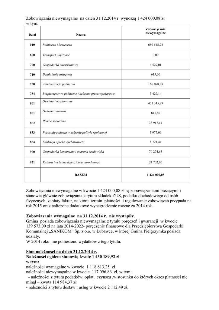 Zobowiązania niewymagalne na dzień 31.12.2014 r. wynoszą 1 424 000,08 zł w tym: Dział Nazwa 010 Rolnictwo i łowiectwo 600 Transport i łączność 700 Gospodarka mieszkaniowa 710 Działalność usługowa 750 Administracja publiczna 754 Bezpieczeństwo publiczne i ochrona przeciwpożarowa 801 851 852 Zobowiązania niewymagalne 650 548,78 0,00 4 529,01 615,00 Oświata i wychowanie 166 098,88 3 429,14 451 345,29 Ochrona zdrowia 841,60 Pomoc społeczna 38 917,14 853 Pozostałe zadania w zakresie polityki społecznej 3 977,09 854 Edukacja opieka wychowawcza 8 721,44 900 Gospodarka komunalna i ochrona środowiska 70 274,65 921 Kultura i ochrona dziedzictwa narodowego 24 702,06 RAZEM 1 424 000,08 Zobowiązania niewymagalne w kwocie 1 424 000,08 zł są zobowiązaniami bieżącymi i stanowią głównie zobowiązania z tytułu składek ZUS, podatku dochodowego od osób fizycznych, zapłaty faktur, na które termin płatności i regulowanie zobowiązań przypada na rok 2015 oraz naliczone dodatkowe wynagrodzenie roczne za 2014 rok. Zobowiązania wymagalne na 31.12.2014 r. nie wystąpiły. Gmina posiada zobowiązania niewymagalne z tytułu poręczeń i gwarancji w kwocie 139 573,00 zł na lata 2014-2022- poręczenie finansowe dla Przedsiębiorstwa Gospodarki Komunalnej „SANIKOM” Sp. z o.o. w Lubawce, w której Gmina Pielgrzymka posiada udziały. W 2014 roku nie poniesiono wydatków z tego tytułu. Stan należności na dzień 31.12.2014 r. Należności ogółem stanowią kwotę 1 430 189,92 zł w tym: należności wymagalne w kwocie 1 118 813,25 zł należności niewymagalne w kwocie 117 096,86 zł, w tym: - należności z tytułu podatków, opłat, czynszu ,w stosunku do których okres płatności nie minął – kwota 114 984,37 zł - należności z tytułu dostaw i usług w kwocie 2 112,49 zł, - należności z tytułu sprzedaży ratalnej (w latach następnych) w kwocie 75 058,02 zł, - depozyty na żądanie – środki pieniężne na rachunkach bankowych w kwocie 194 279,81 zł Należności z tytułu poręczeń i gwarancji nie występują. Należności wymagalne dotyczą: - zaległości w płatnościach podatków i opłat , czynszu za lokale mieszkalne i użytkowe , opłat za użytkowanie wieczyste , należności zahipotekowanych, zaliczek alimentacyjnych i funduszu alimentacyjnego w części należnej gminie. Należności niewymagalne dotyczą: -należności pozostałe do zapłaty dotyczące spłat, których termin płatności jeszcze nie minął w tym opłata za śmieci (płatność do 15.01.2015 r.) oraz odroczenie terminu płatności.
